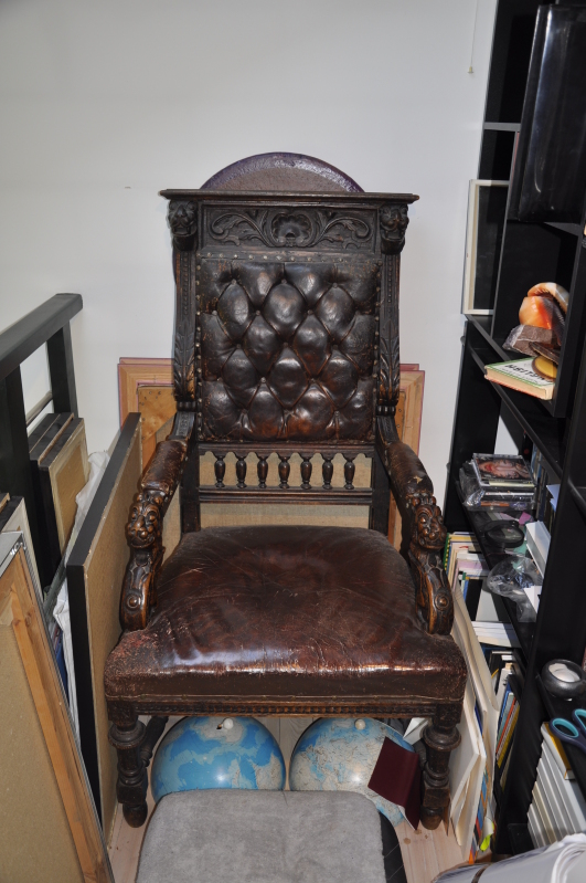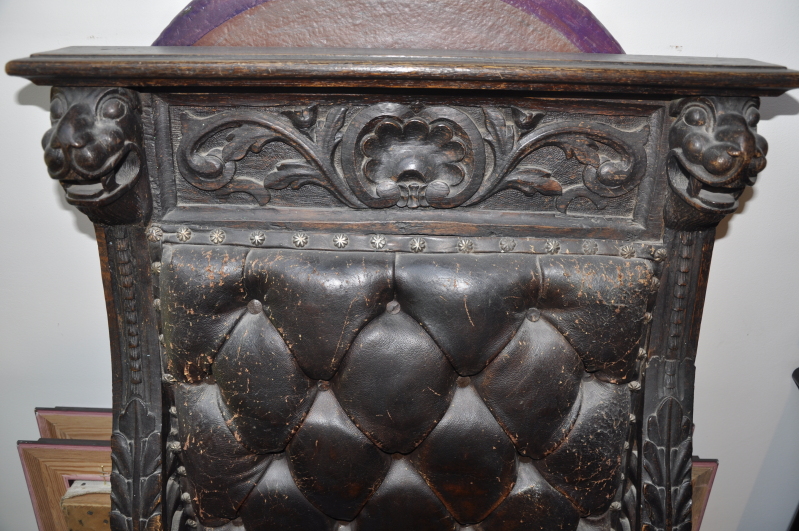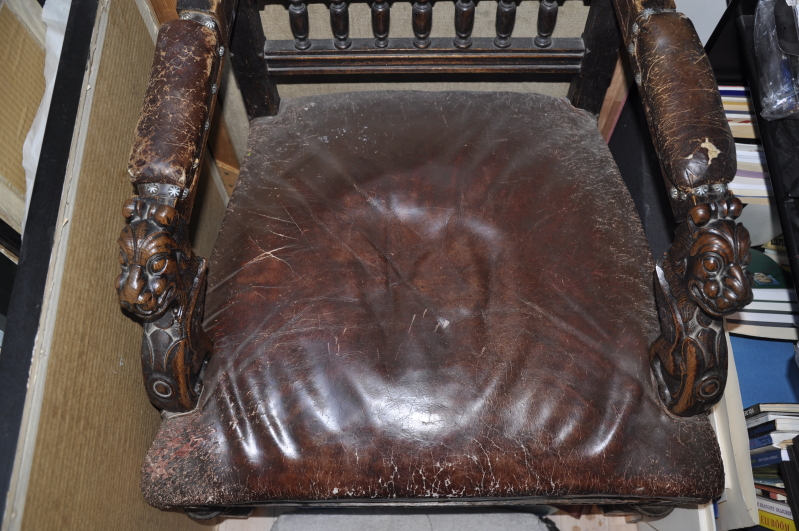 The chair is leather, and the leather is smooth but not very soft anymore. It's getting harder, and as you can see in the pictures below it's cracking and peeling. The framework is carved out of wood. The armrests seem to have lions(?) carved into the ends. I would like to know if anyone can tell from the style and woodwork, what the approximate year/century of this chair is, and where it could have been made?