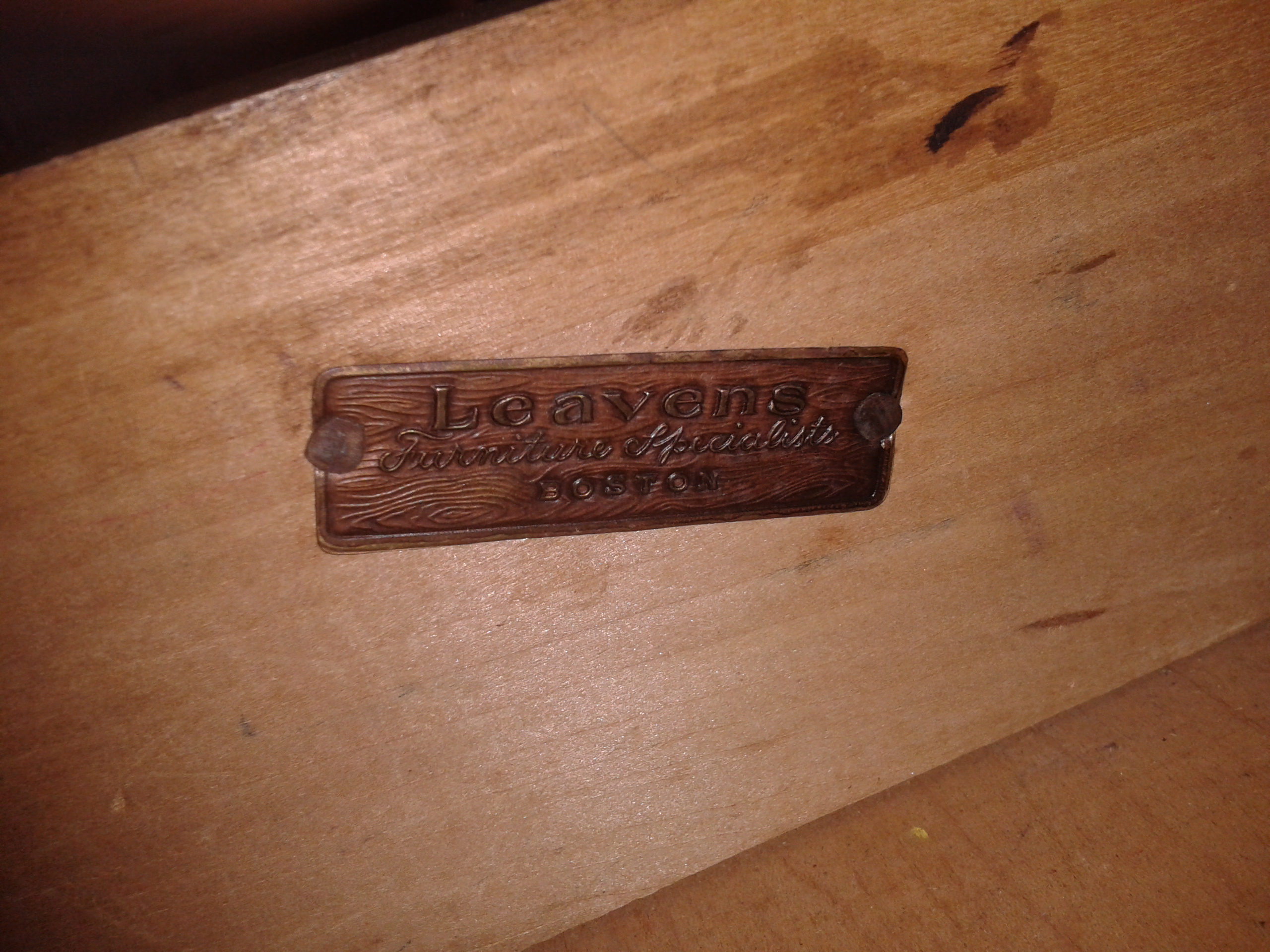 This an antique vanity and original chair manufactured by Leavens Furniture Specialists Boston. This company was in business from 1900 to 1930. The vanity is in very good condition with only a couple of minor scratches on the top. There is a label attached to the inside of the drawer stating the manufacturers name.