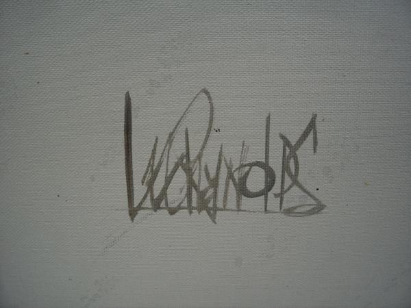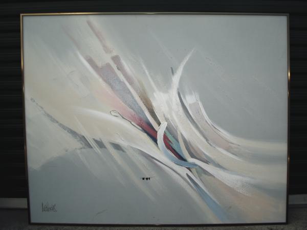 This painting is done in pastel-like colors. Vaguely like flowers. Swooshes of pink, blue, white...... all in all, very light coloring.