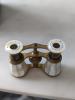 Antique LeFils Paris opera glasses. Genuine mother of pearl inlay on the eye pieces and on the fold up handle. Around the eye pieces and the top part of the fold up handle is brass finish with a four-leaf clover looking design(I know there's a name for it, I just can't think of it. See pictures.). The bottom half of the handle is mother of pearl with a flower design carved into it. There is a small sliding piece in the middle of the handle to keep it from folding back up when you have it unfolded. All the opera glasses I have looked up have a round handle, but the opera glasses I have have a flat handle.The piece that turns to focus the lenses is in good working condition. LeFils Paris is printed on both of the eye pieces. You can see out of it pretty clearly. The brass is a little dull, but nothing a good polishing can't fix. There are minimal scratches and flaws to the piece.