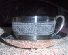 White with gilded edges, a fox hunt scene on front, riders coat in crisp burnt orange colors, 3 dogs, background of bushes, greenery, no markings on cup or saucer. Thank you!
