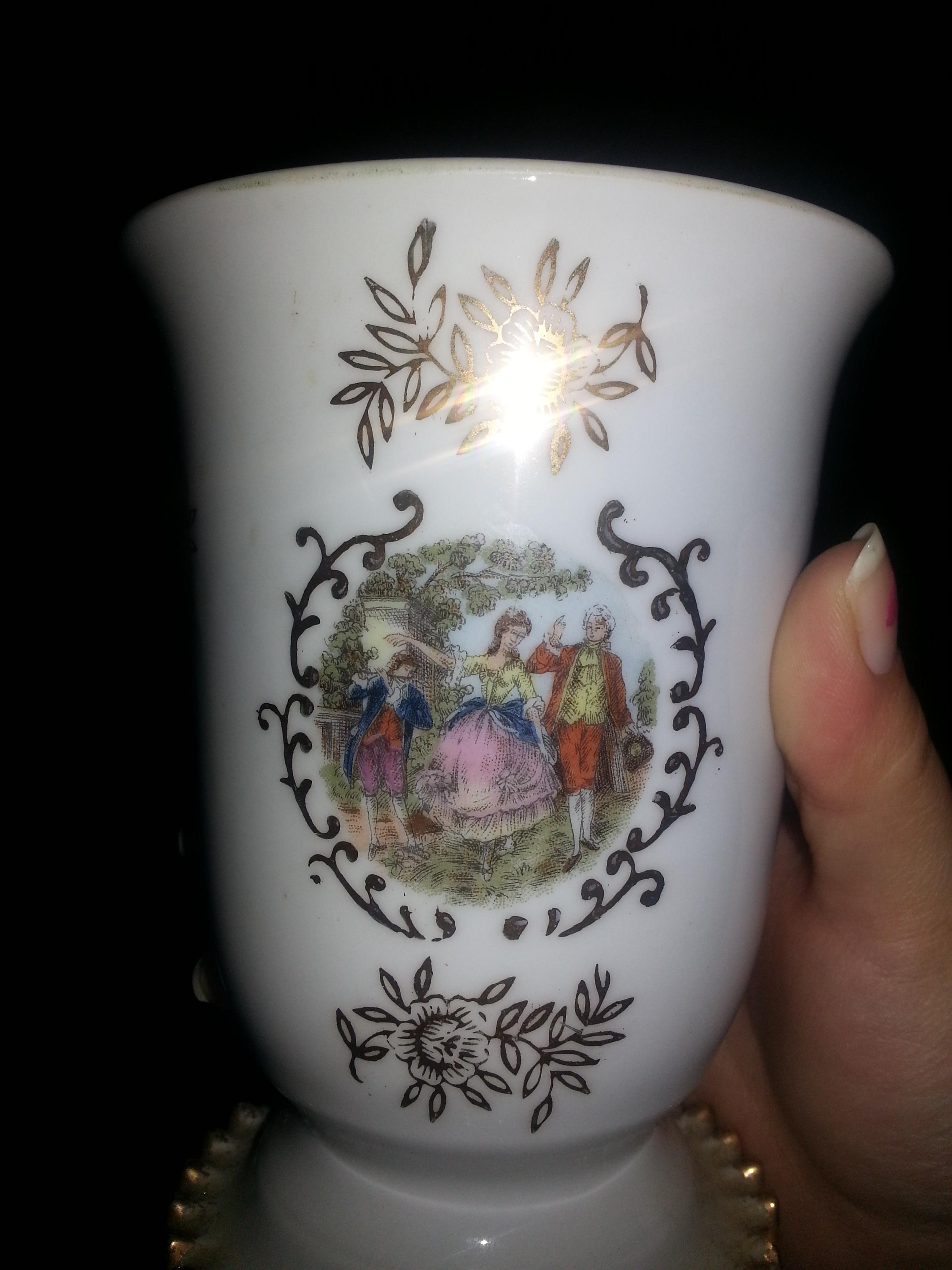 The set includes tall dish with lid, small vase and short oval dish with lid they have a gold trim painted with a woman and two men painted on each piece I believe the lot number is SL 5417 and they all have the red leftons label with gold trim
