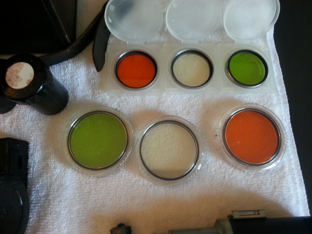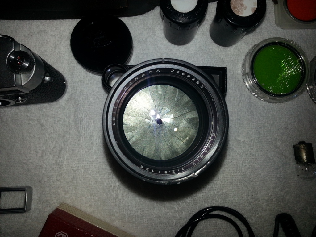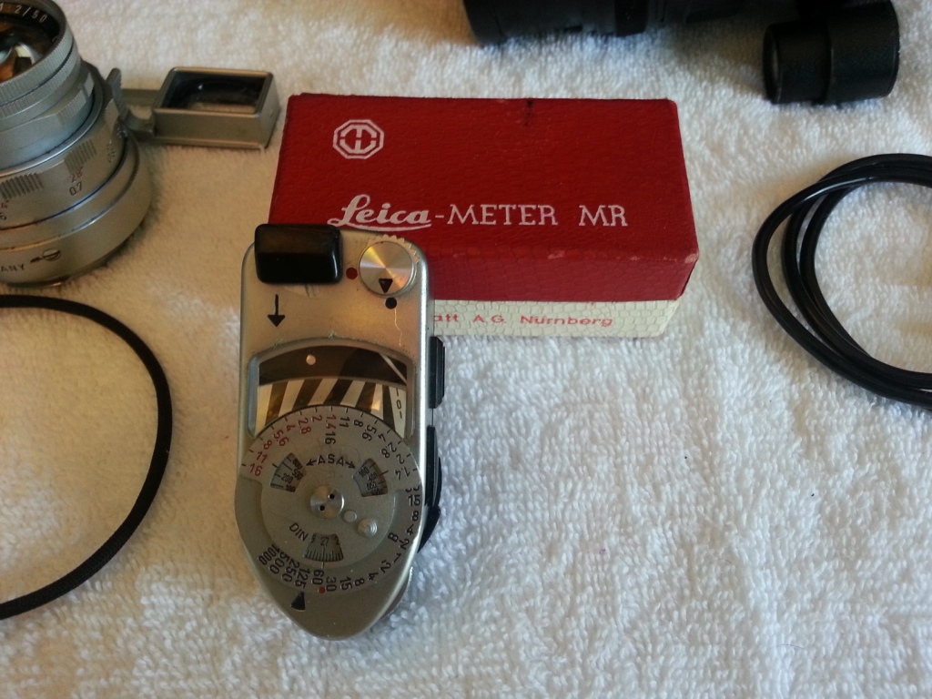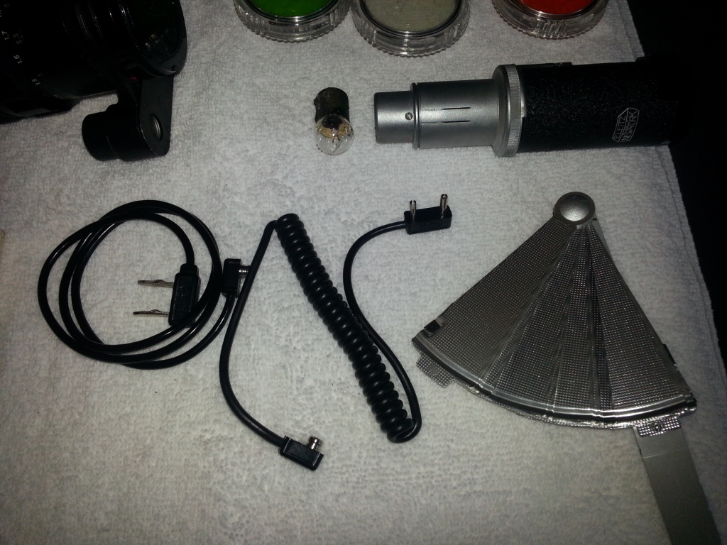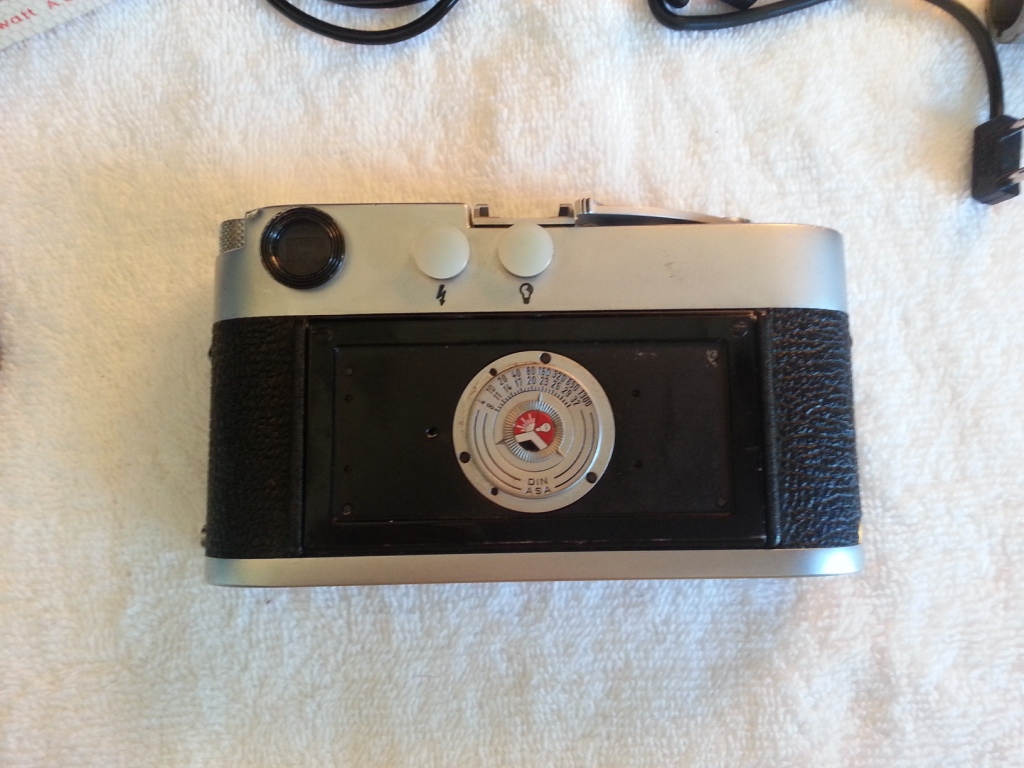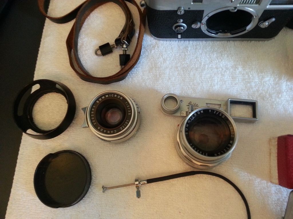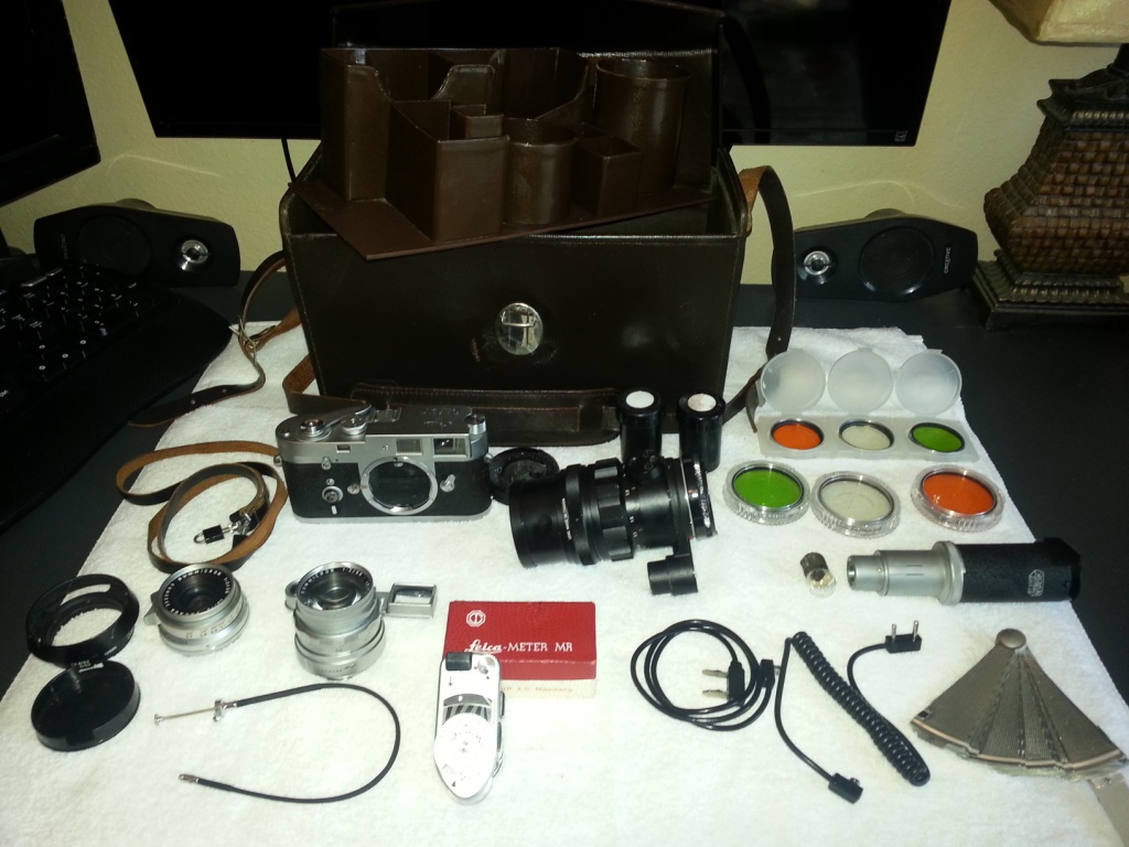 Leica M2 with 2 lenses, 6 filters, flash attachemt (no batts. but two batt. tube holders) Lentiz camera case from same era as camera, range meter, remote push rod, a couple of others things that I don't know what they are.