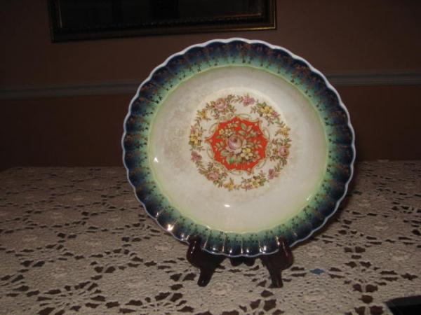 9 inch rimmed soup with 22 k gold trim. Leigh ware by leigh potters patent applied for.