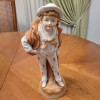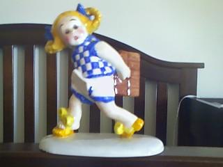 This figurine is of a girl with blonde braided pigtails. She is wearing blue and white checkered clothing. Her hands are behind her holding what looks to be a bar of chocolate that has had a bite taken from it.