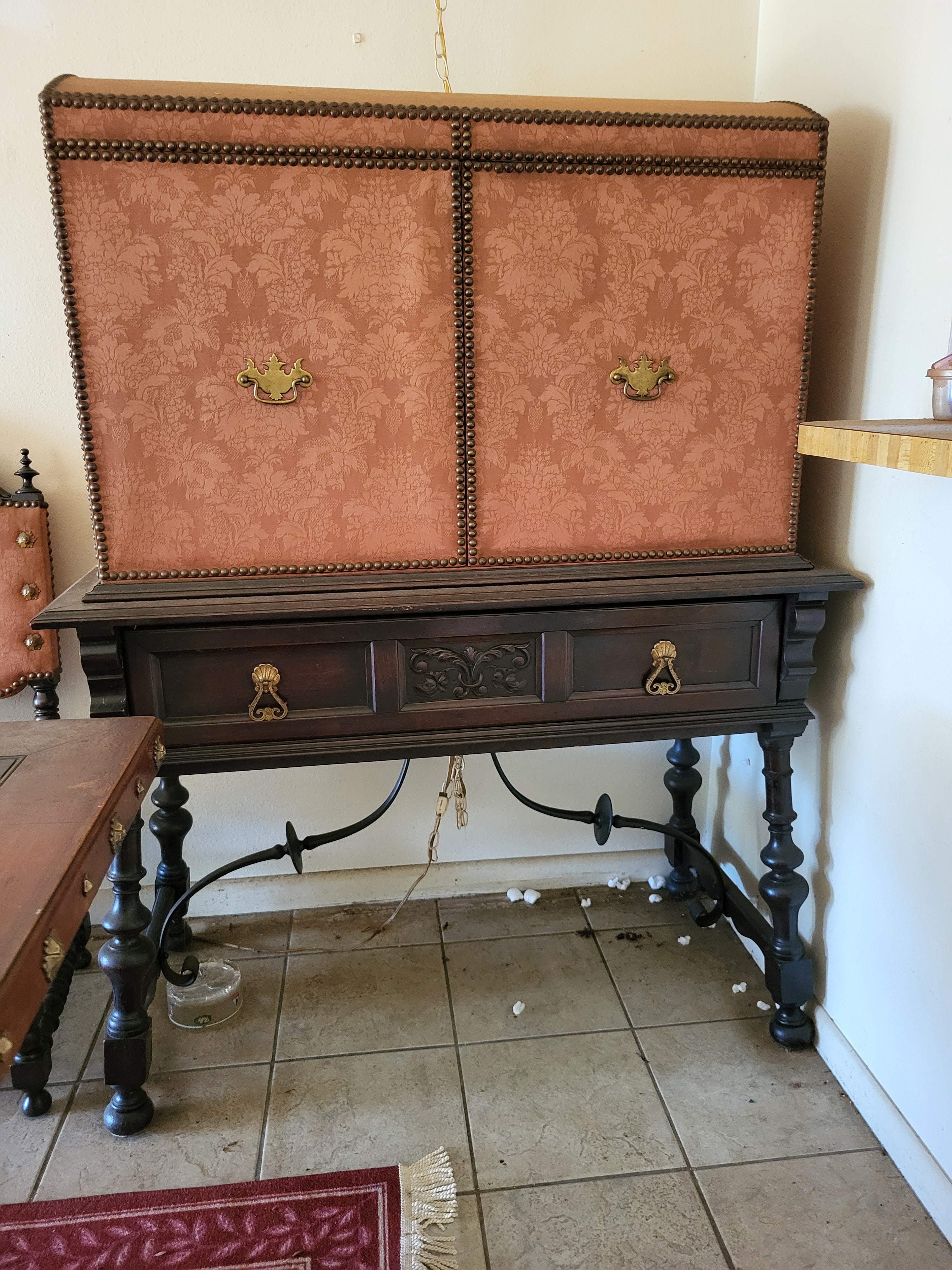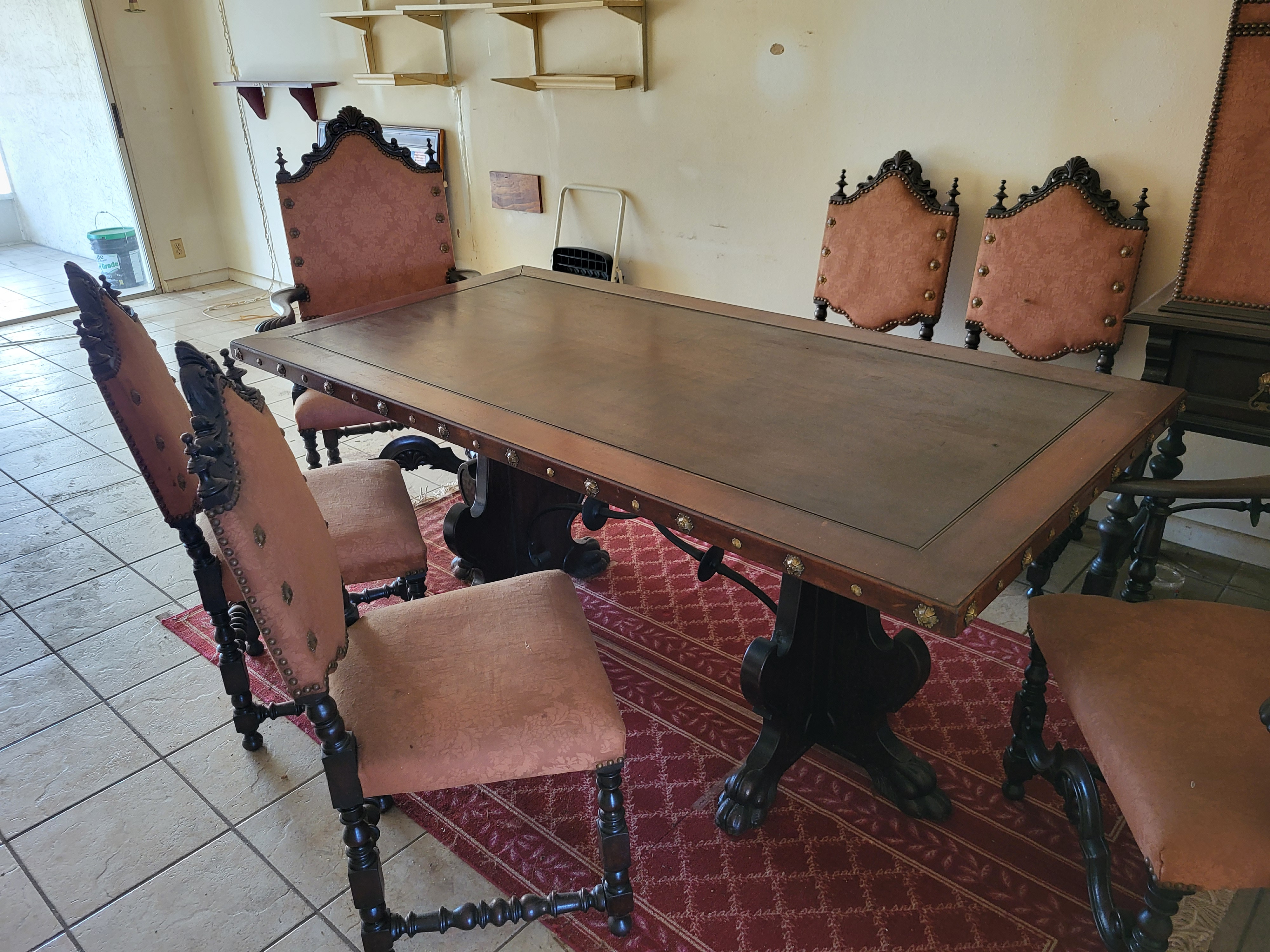 This was my great aunt's dining set in Grosse Pointe, MI who had it from the 1910s. She gave to my mother when my aunt was ready to downsize. My mother had it until the 1970s in Grosse Pointe. My brother took it over from my mother and moved it to the east coast of Florida. It is now i Southwest Florida. The label is from The Lenox Shop Furniture, NY. The chest is an unusual china cabinet, shaped like a pirate's chest. The buffet still has the original key. The table seats 6 - 10 but the leaves are absent. It has been reupholstered at least 3 times that I know of. All three times it was done with red damask which is now faded.
