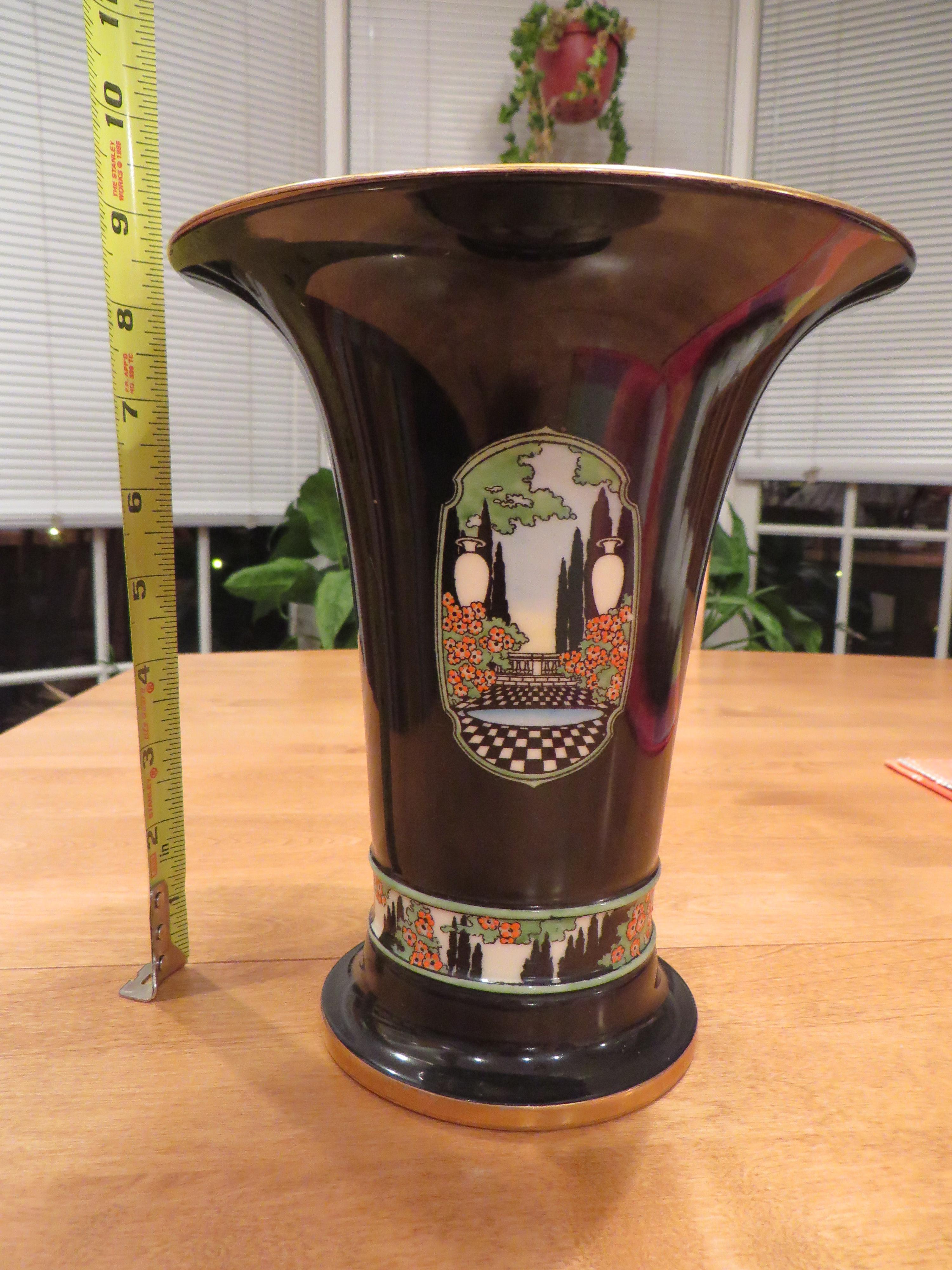 Approximately 8.5" footed trumpet vase. Exterior is black with same design on two sides of a formal garden scene (with two large urns, black/white pathway, red flowering shrubs and trees). There is a similar colored pattern in a ring around the footing. Both footing and top are edged in gold. Interior is bone china color and opening is approximately 7.5". Bottom mark is Lenox mark with Tiffany & Co printed underneth. I received the vase from my father-in-law who said it was his mother's. There are a few small discolorations in the interior of the vase and one small scrach on the outside of the vase near the top edge.