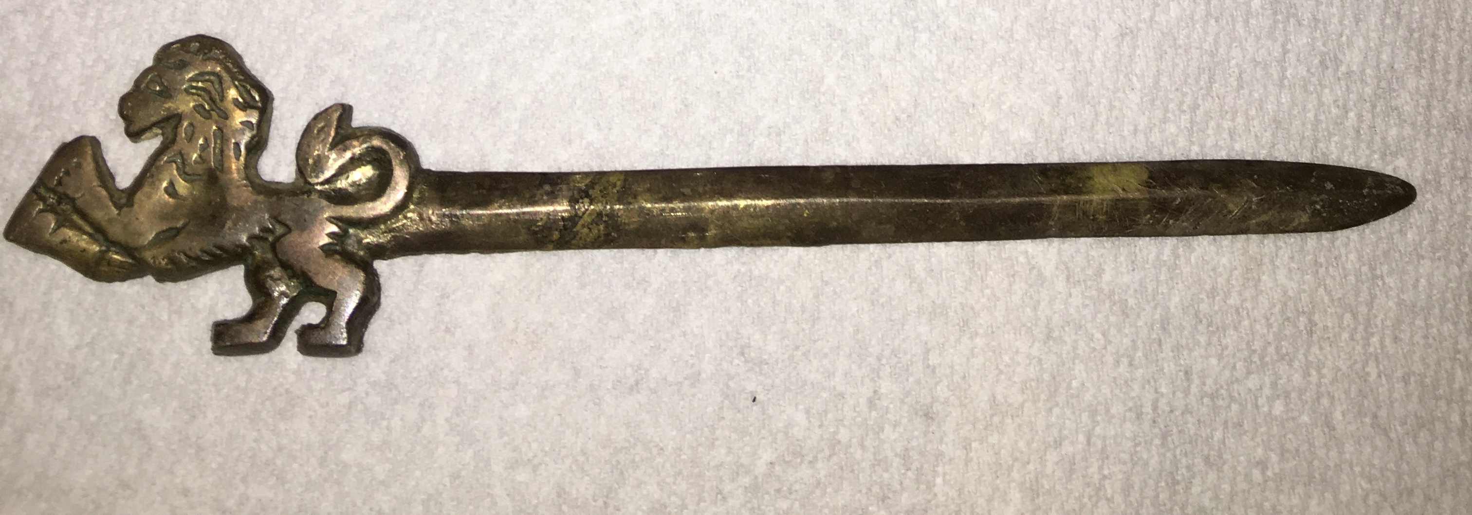 Lion letter opener I found in my yard. It has no identifying marks and I am curious about its age and what it is made of.