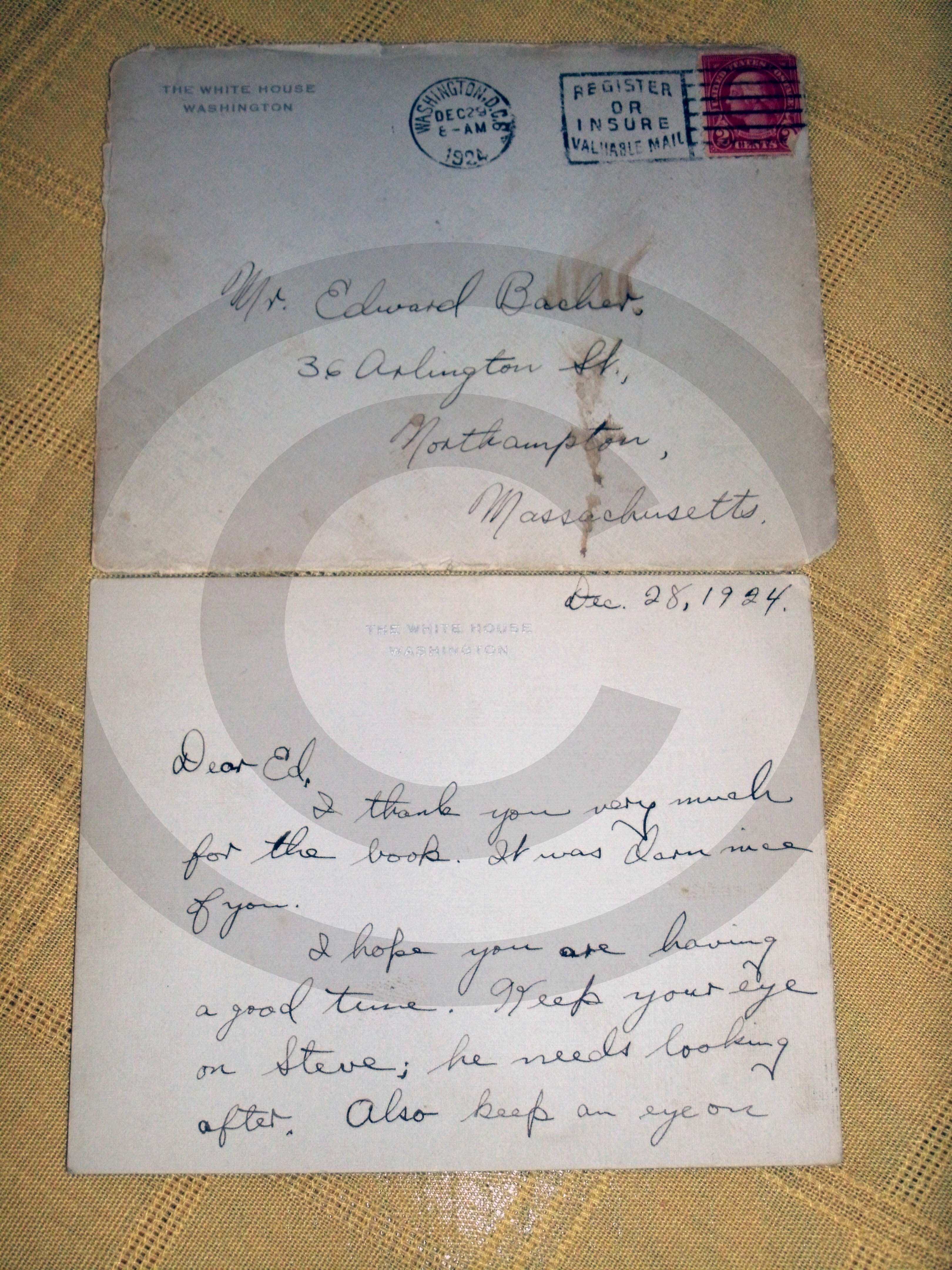 I was going through my mother-in-laws stamp collection when I came across 4 letters, 3 of which are on White House stationary/envelopes postmarked 1923-1924 and appear to be hand written letters from Calvin Coolidge addressed to a Mr Edward Bacher 36 Arlington Street Northampton Ma. One of the letters on White house stationary is signed John though the others are signed Calvin. The fourth letter is to Mr. Bacher from a Miss Georgia Atyan room 202 The New Ocean House Swampscott Ma., and appears to be a letter of sympathy for the loss of Calvin Coolidge/one of the three Musketeers? It's postmarked 1924 though, and her handwriting is very hard to read.