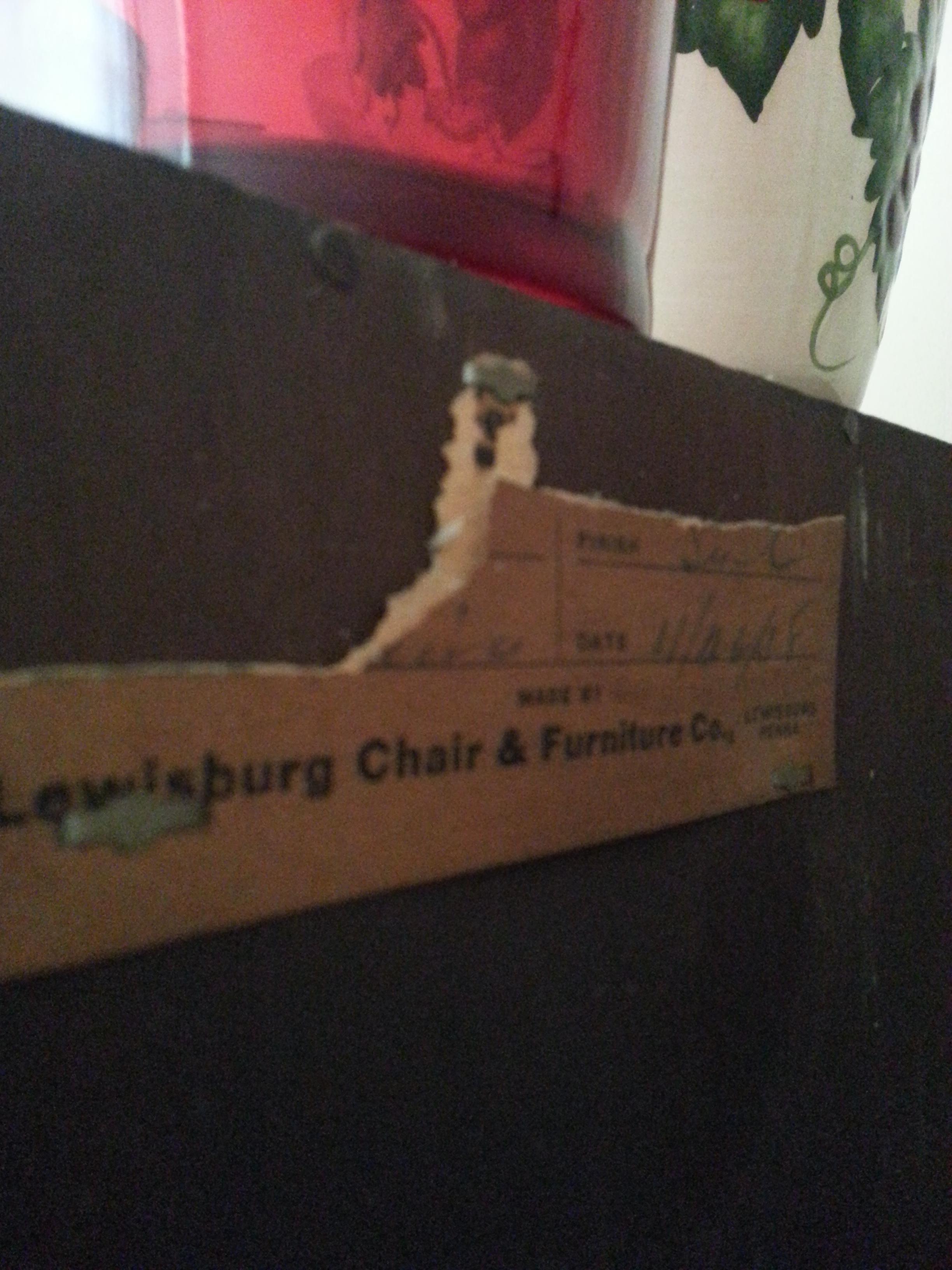 Made by the Lewisburg Furniture and Chair Co. Date on the back reads November 1938. A nice looking corner cabinet. Has a few cracks in the wood as shown in the pictures but otherwise in pretty good condition for a piece of furniture that is 76 years old. Just curious to see how much a piece like this would go for at auction or what could be expected if sold privately.