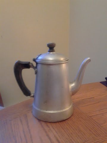 I have what I think to be, a percolator? The bottom reads: ALUMINUM UNIVERSAL L.F.&C. 291. I've searched online and can't find any pictures that are close to what I have. The base is large, about 5-6 inches in diameter with a wooden handle. The spout starts from the bottom of the base with a long upward motion?! It has chunks of wax in it that I simply can't explain. Any info will be greatly appreciated! Thank you, Suzannah