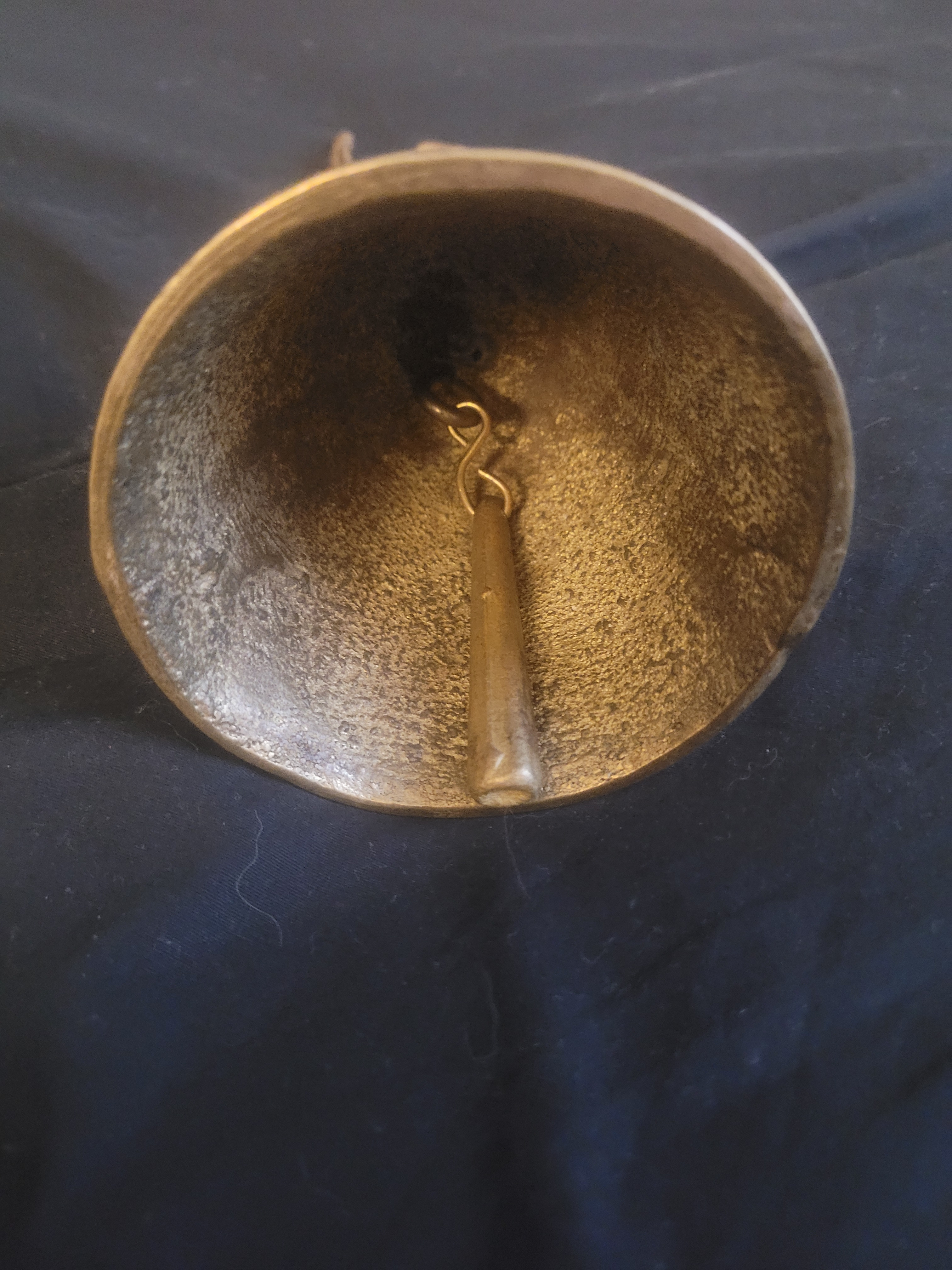 Cast bronze or brass alloy with a naturally aged patina. The internal clapper is intact and appears original.