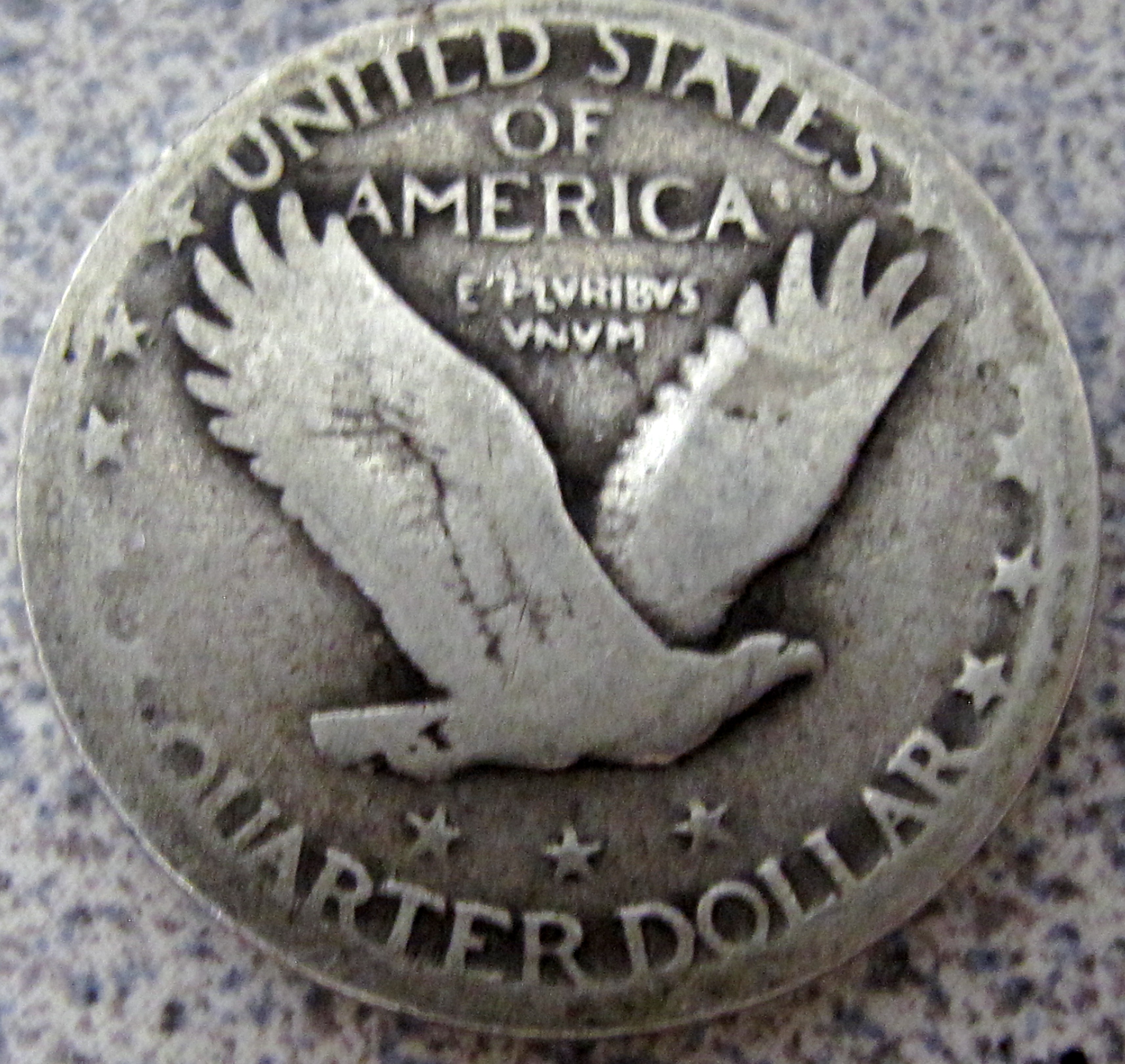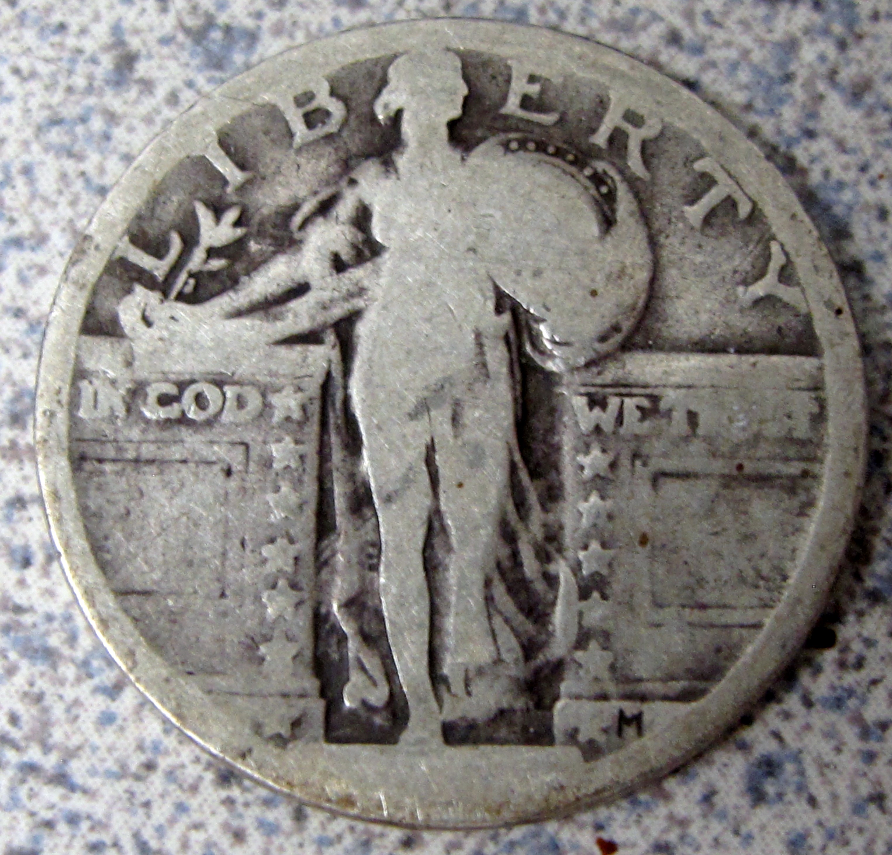 Standing liberty quarters were made from 1916-1930. In dealing with coins there are two values, the base value of the metal, and any additional numusmatic value from the coins collectibility. Unfortunately this particular quarter is what is known as a cull (heavily worn), on a scale of 0-70 it rates at about a 5 or 10 and it will carry very little if any premium over the metal value, which is about $6.