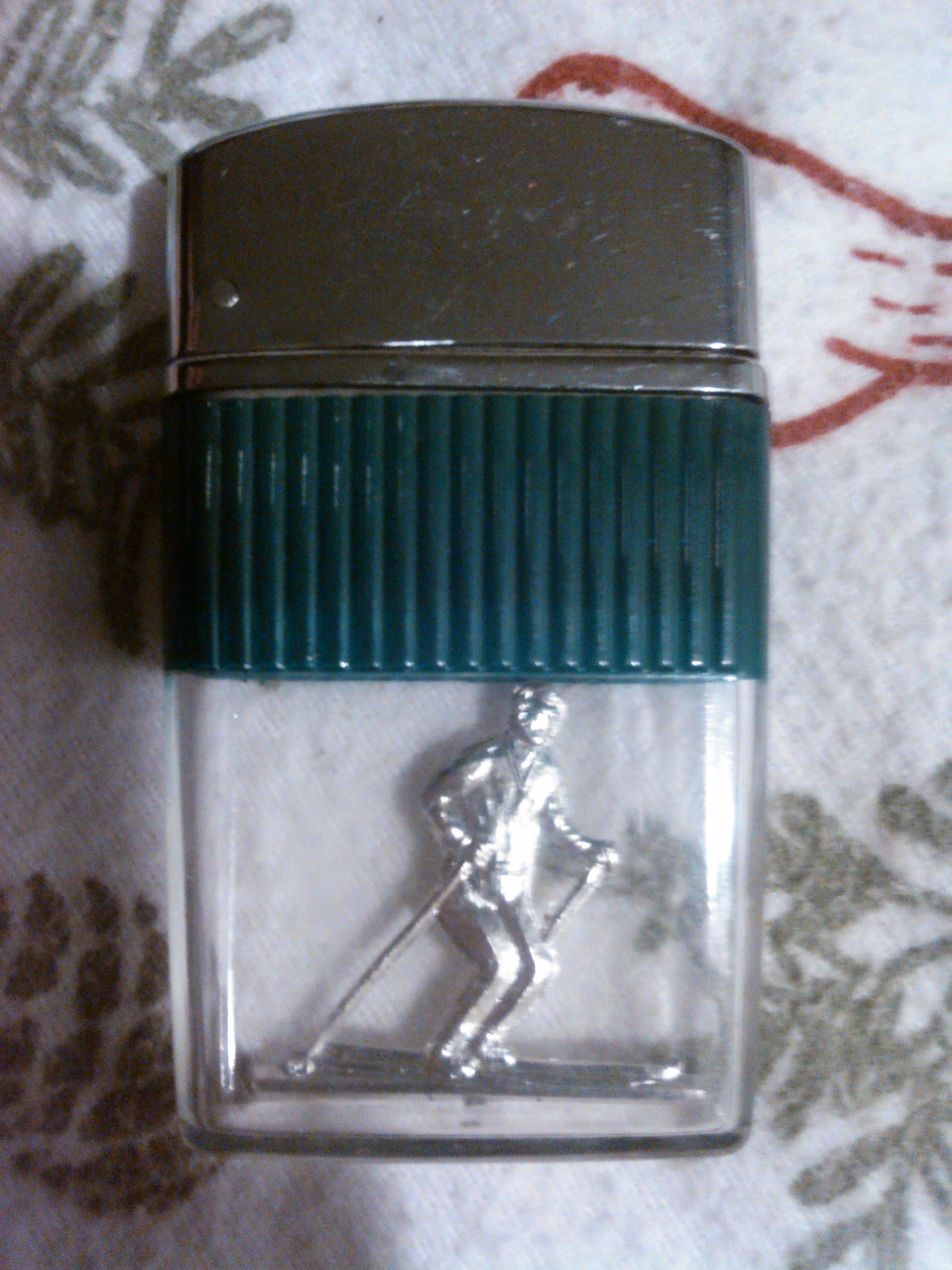 Metal top clear plastic bottom with a metal ski man in it that fills up with fluid