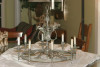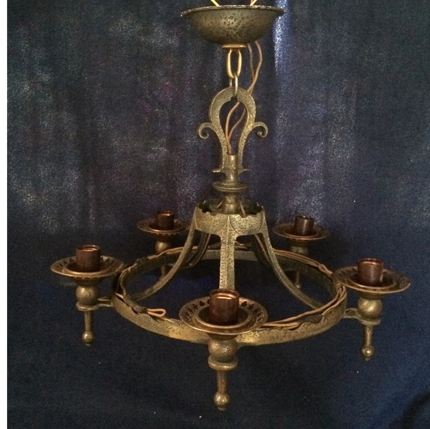 The ring of the chandelier has a 13" diameter with overall diameter being 18". Height is approximately 19" with one link chain. Light has original wiring (works, normal aging but not cracking) and original bakelite sockets. Heavy light with body being hammered cast metal (magnet will stick) and light rings being brass. Overall very good condition. I have two of these lights.
