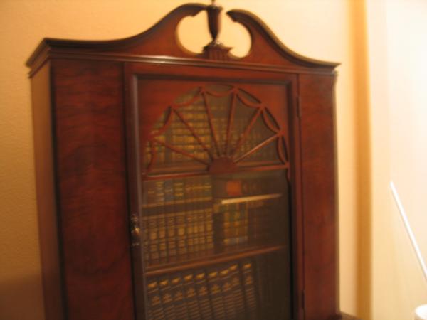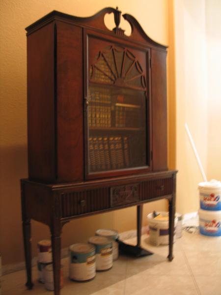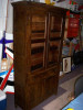Not sure if this is a book case or a china hutch but the style appears to be Georgian. The upper part has two wooden shelves and is enclosed with one glass door that has fanlight wood cutouts. The bottom section has one drawer which features a center urn decoration. The very top decoration also has an urn finial. The number 40 is stamped in the back top corner.