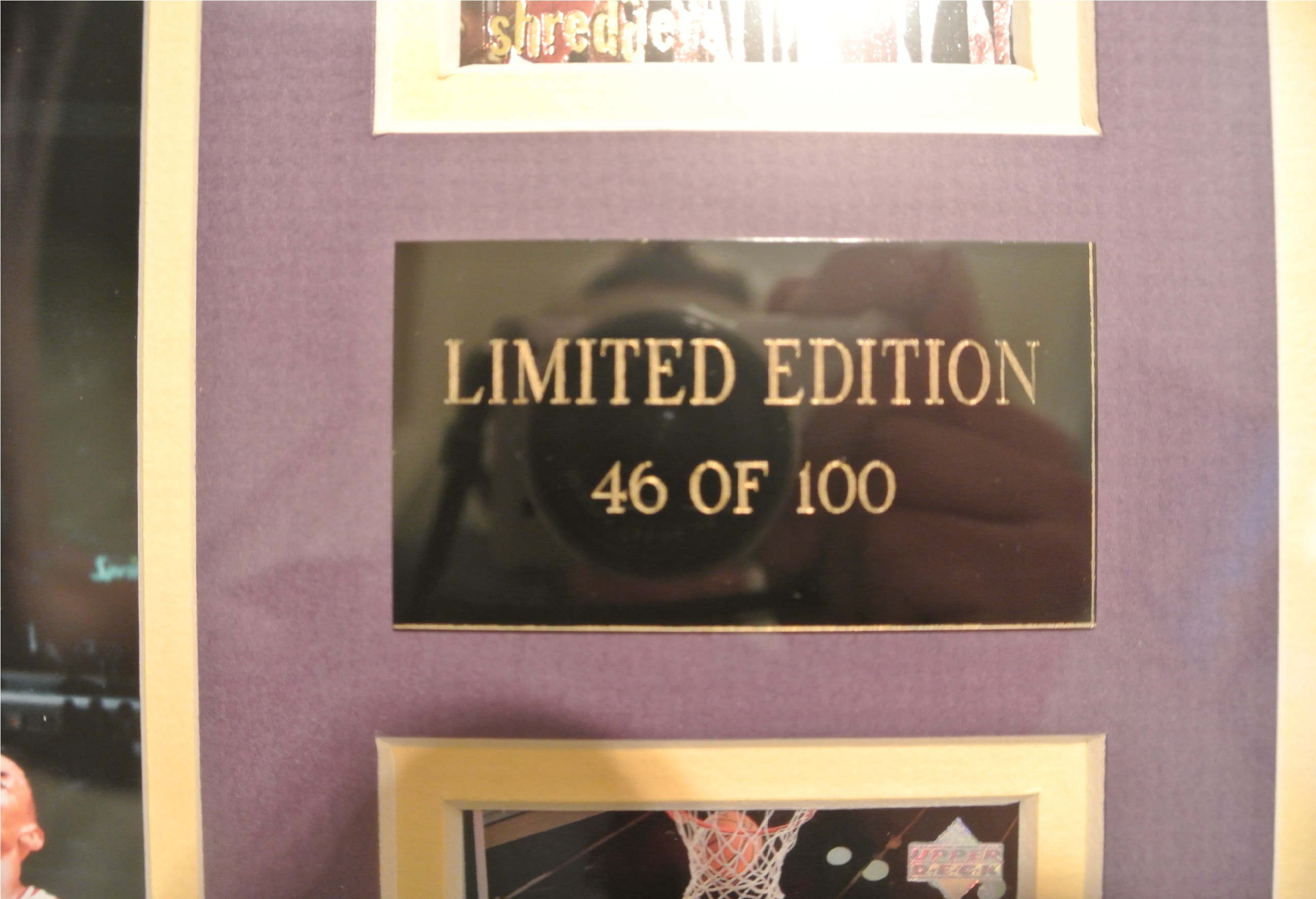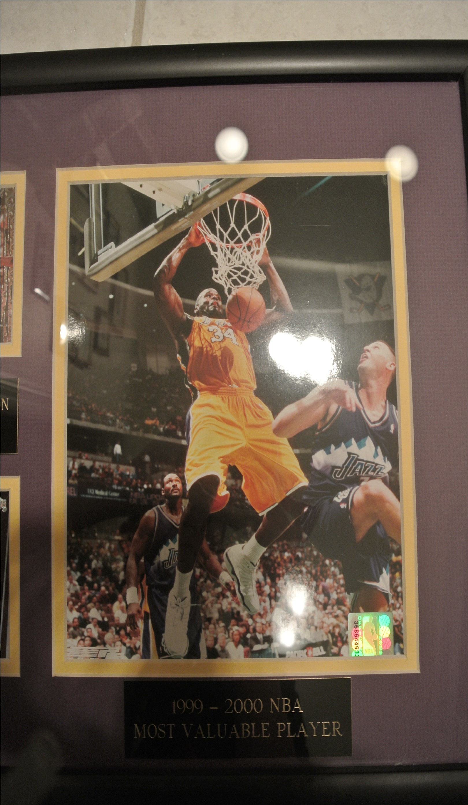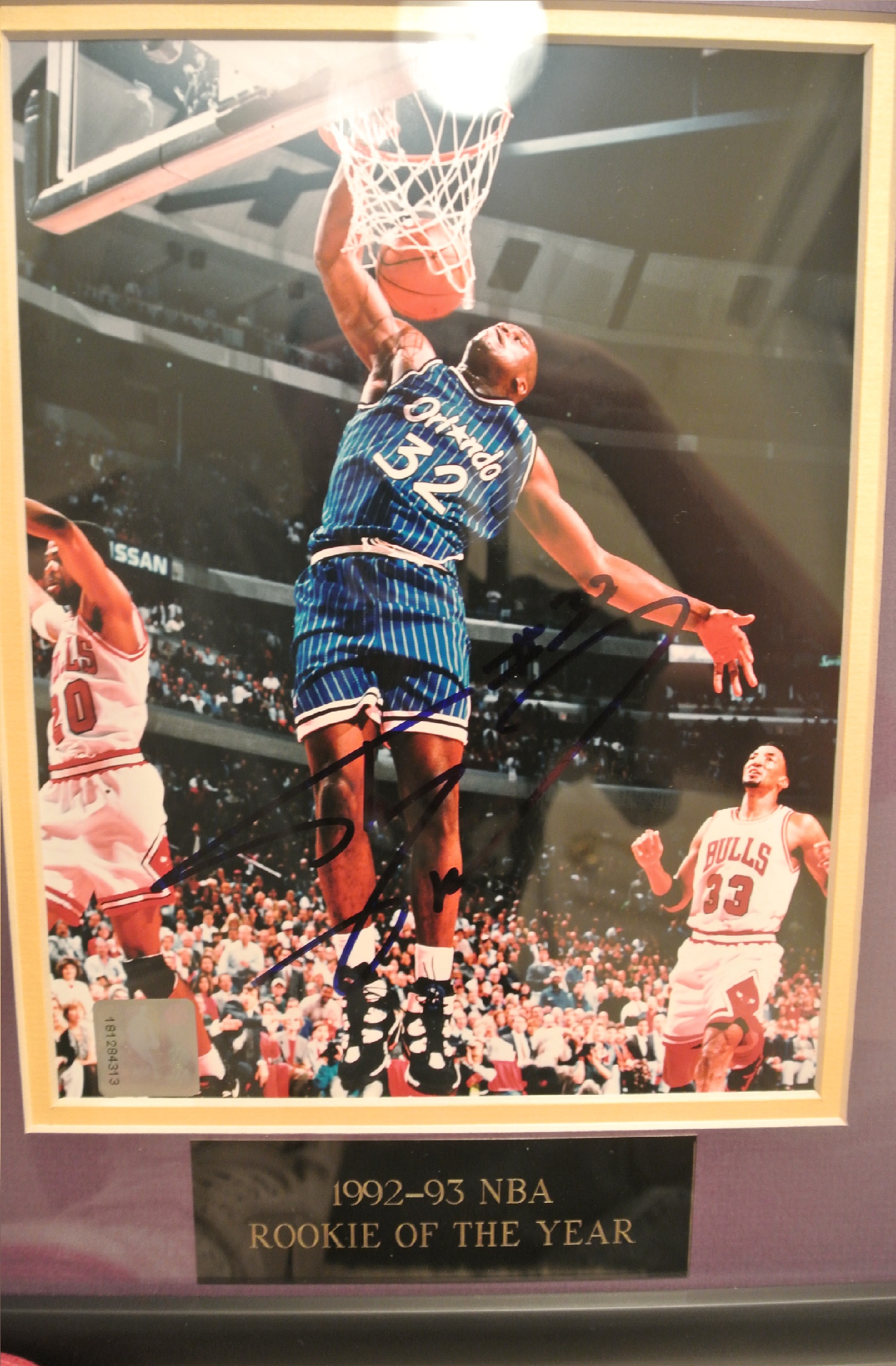 There are plates below each of the pictures too. The one that is signed says "1992-93 NBA ROOKIE OF THE YEAR" and the other one (not signed) says "1999-2000 NBA MOST VALUABLE PLAYER"
