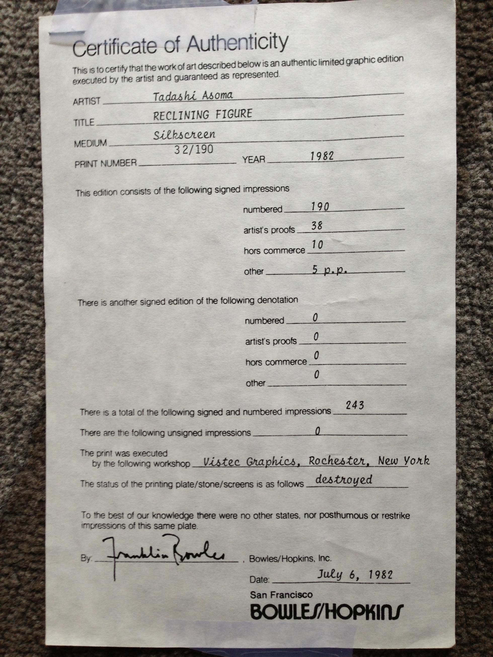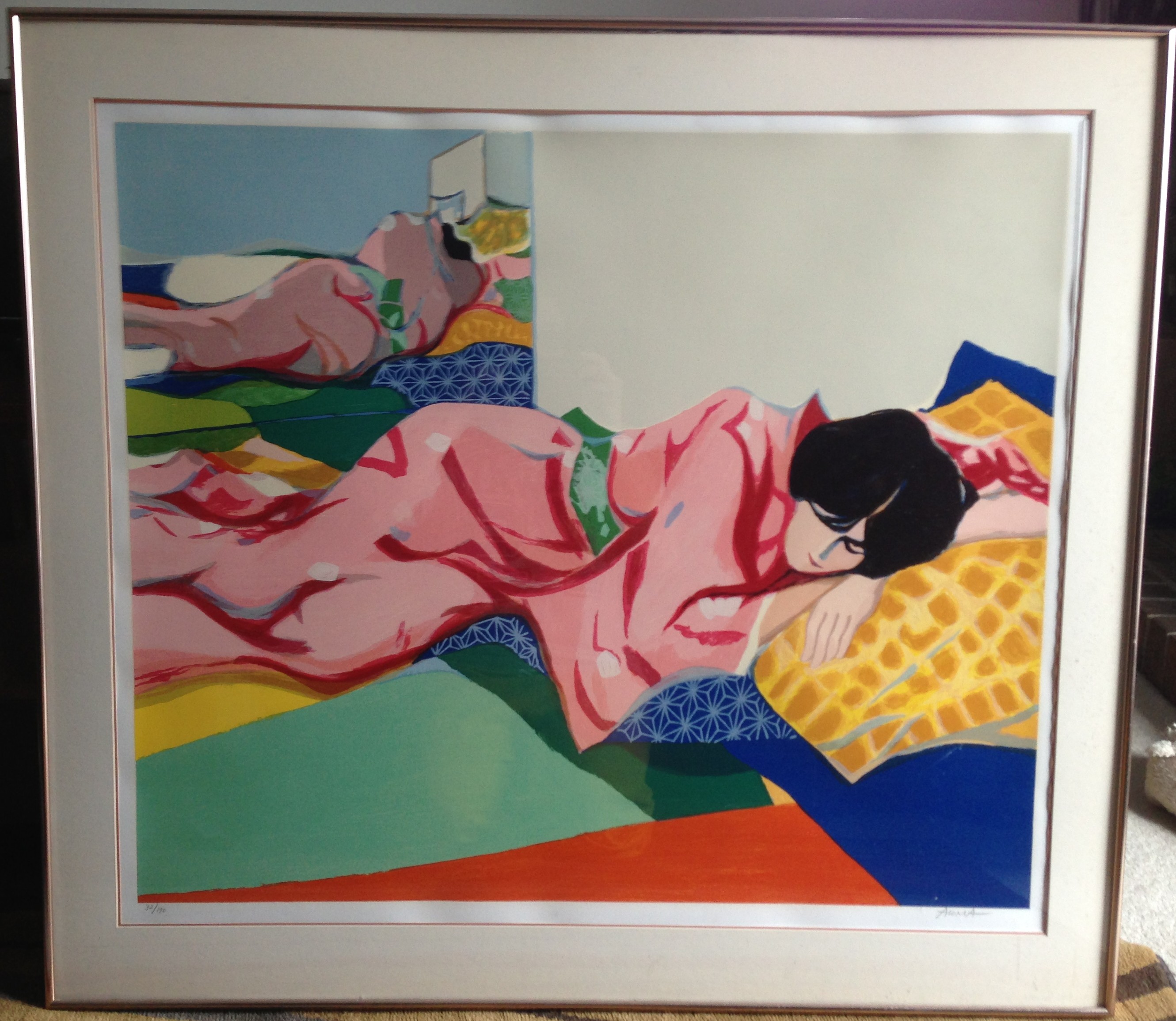 Pencil signed limited edition screenprint of a reclining woman by noted listed artist Tadashi Asoma, edition of 190 (this is number 32). Wide gold metal frame with linen mat. As framed, 45" x 41.25". Sight measures 33 1/2" x 28 1/2".
