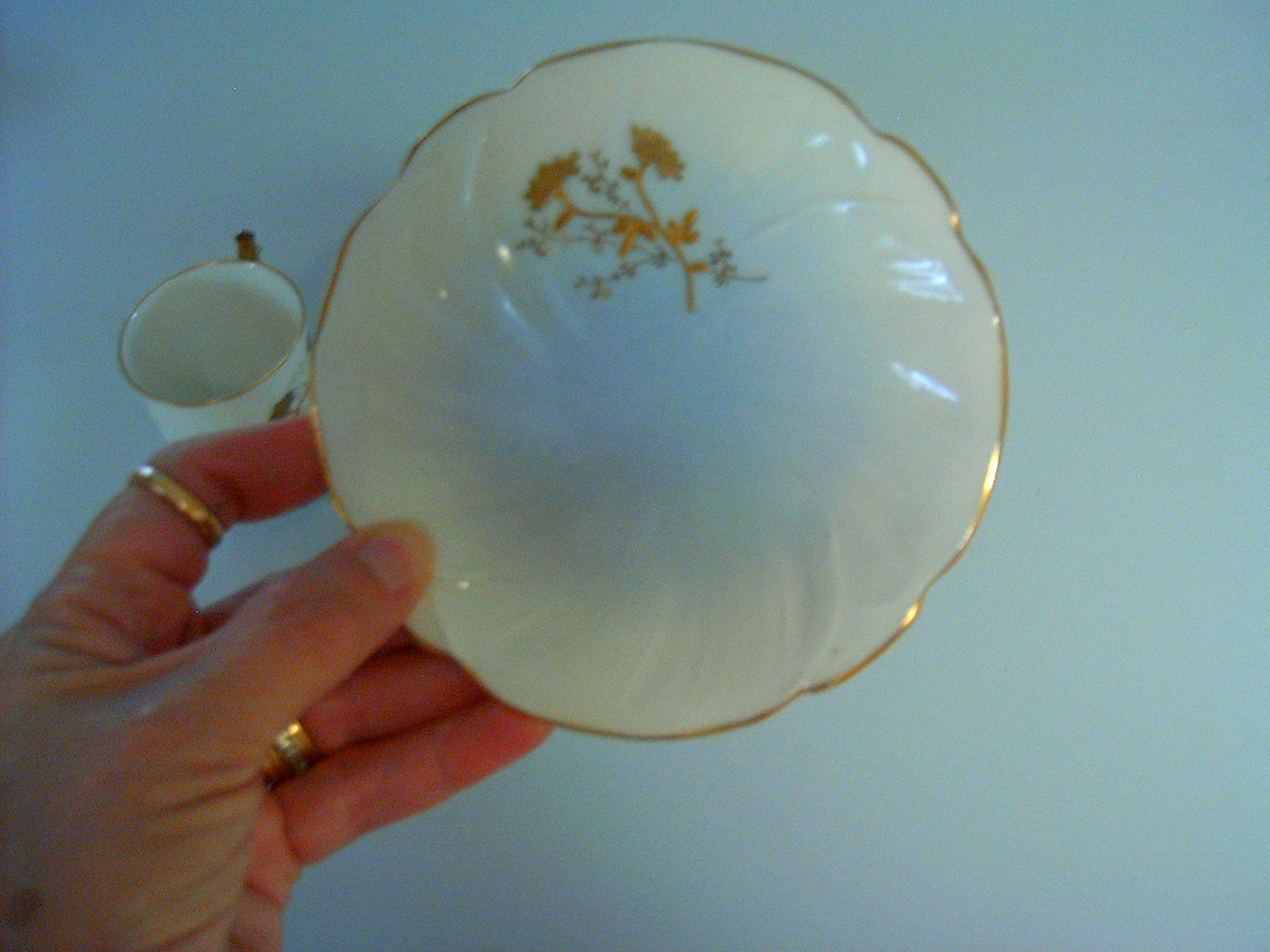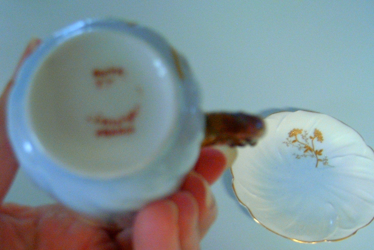The cup is marked in red Limoge France in red and can't make out the mark. It looks like a raised gold floral design on it and its a turquoise color on the lower part of the cup and as it comes up the cup gets lighter in color unti it turns white and has a gold long handle which looks like bamboo and the cup is trimmed in gold around the rim. The saucer has like a scalloped edge in gold trim and is a turquoise color in the center and comes out to a white around the outer edge. It has swirl to the pattern. Its not smooth but indented. It has a single bamboo raised floral design with two flowers on a branch with a filler. The cup is marked with a green Limoge , an arrow pointed to the left and France under it and a red Elite with a mark shaped like a pocket and under it Limoge and under that France. The plate itself looks like a floral pedal from a distance and the cup has a pedal impression going upwards all around the cup. Its really light weight. And its also translucent on both pieces when held up to the light.