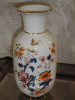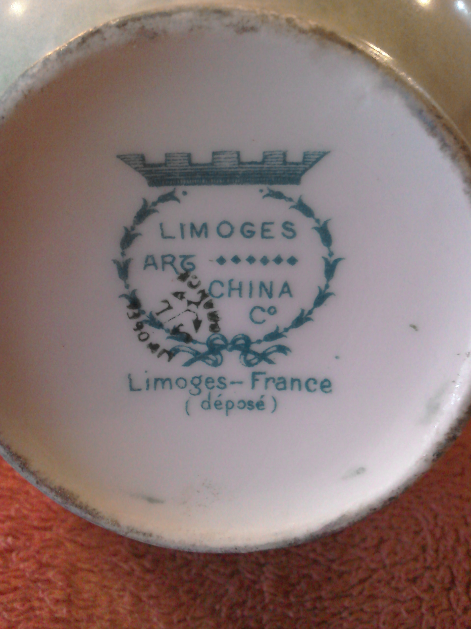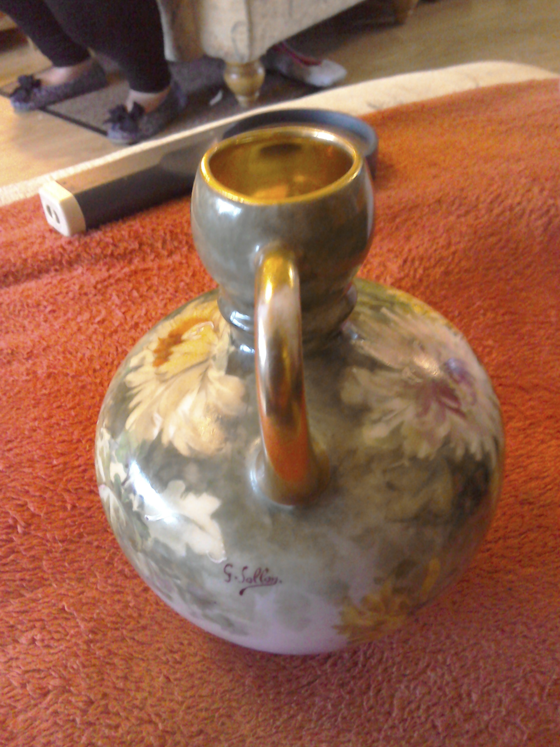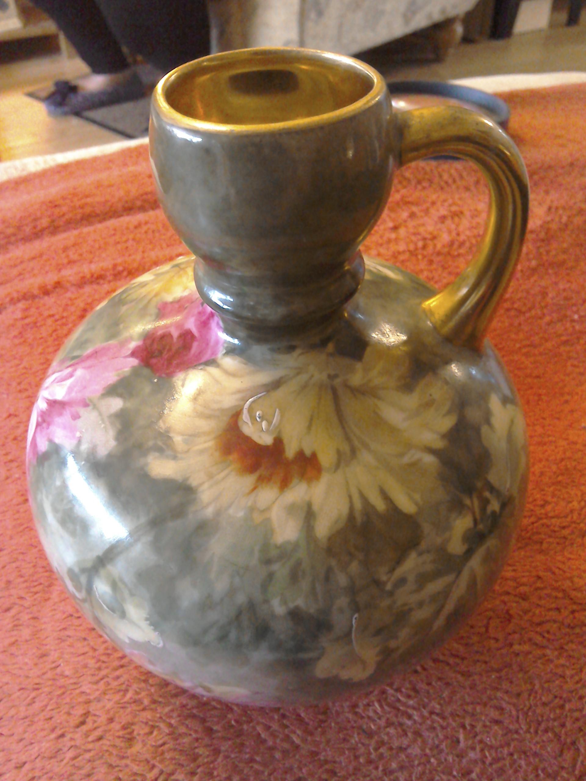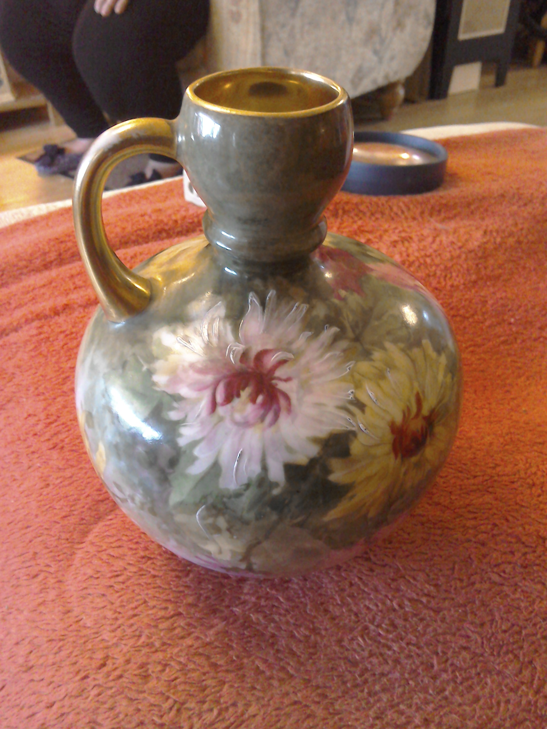 Green background with pink, white and yellow chrysanthemums and a golden handle and the inside of the top is also golden.