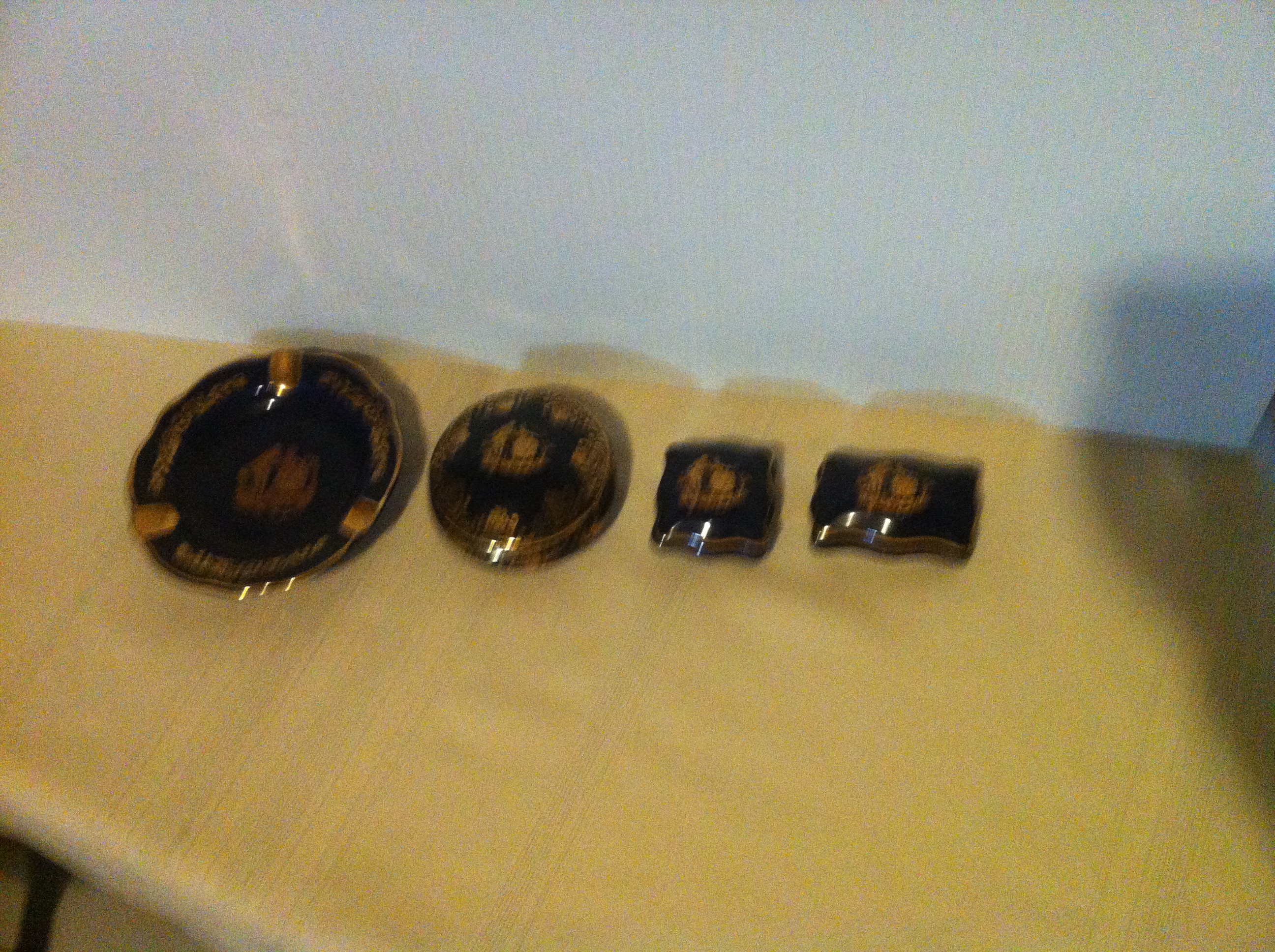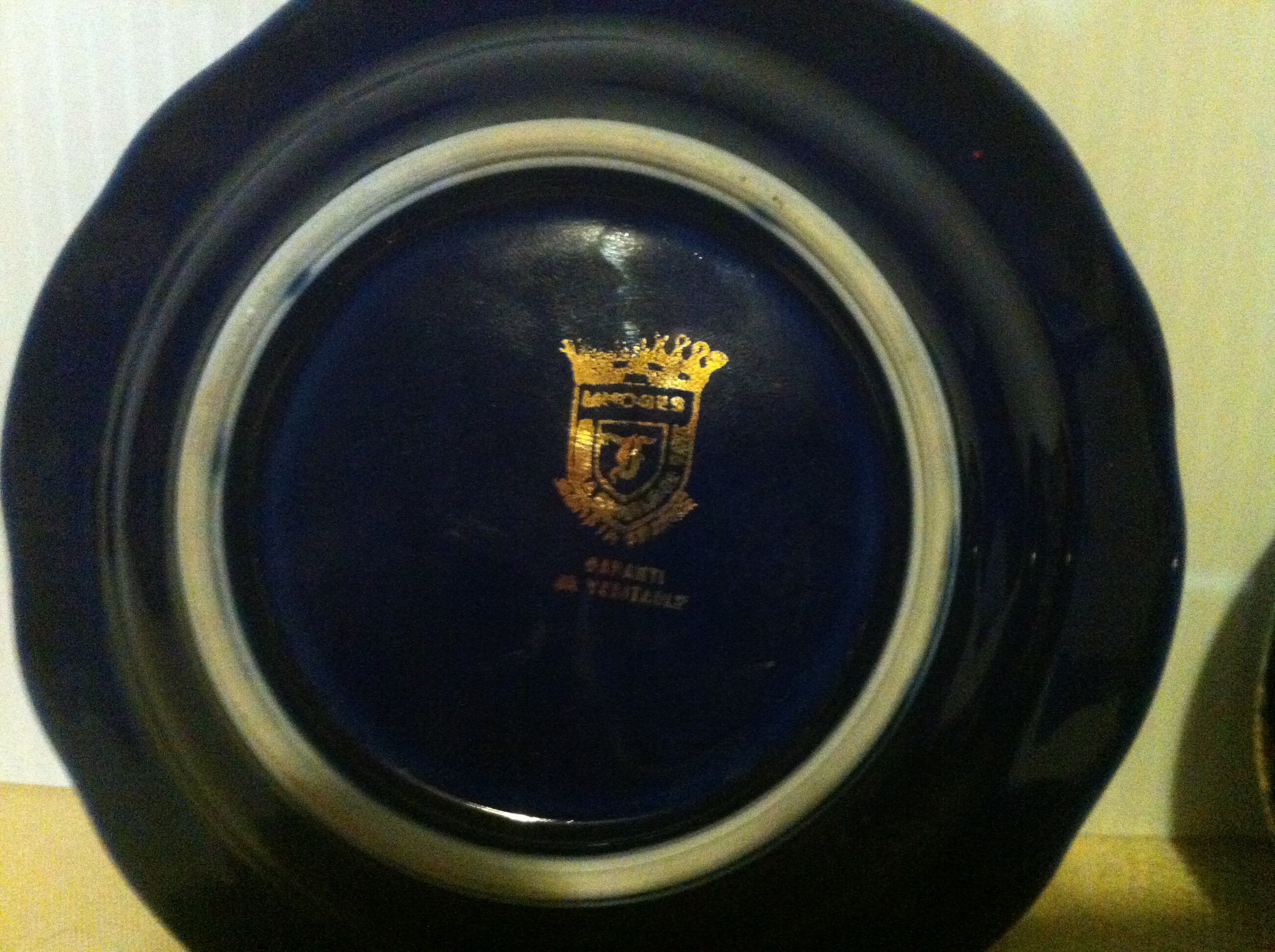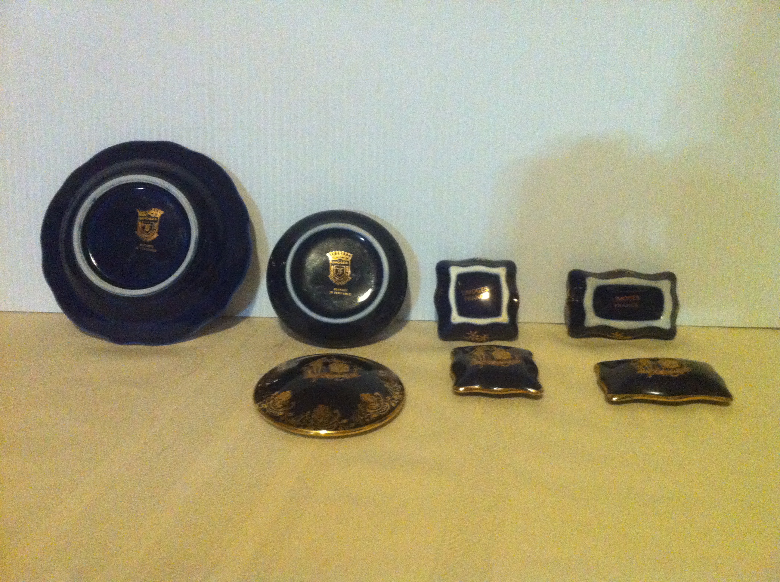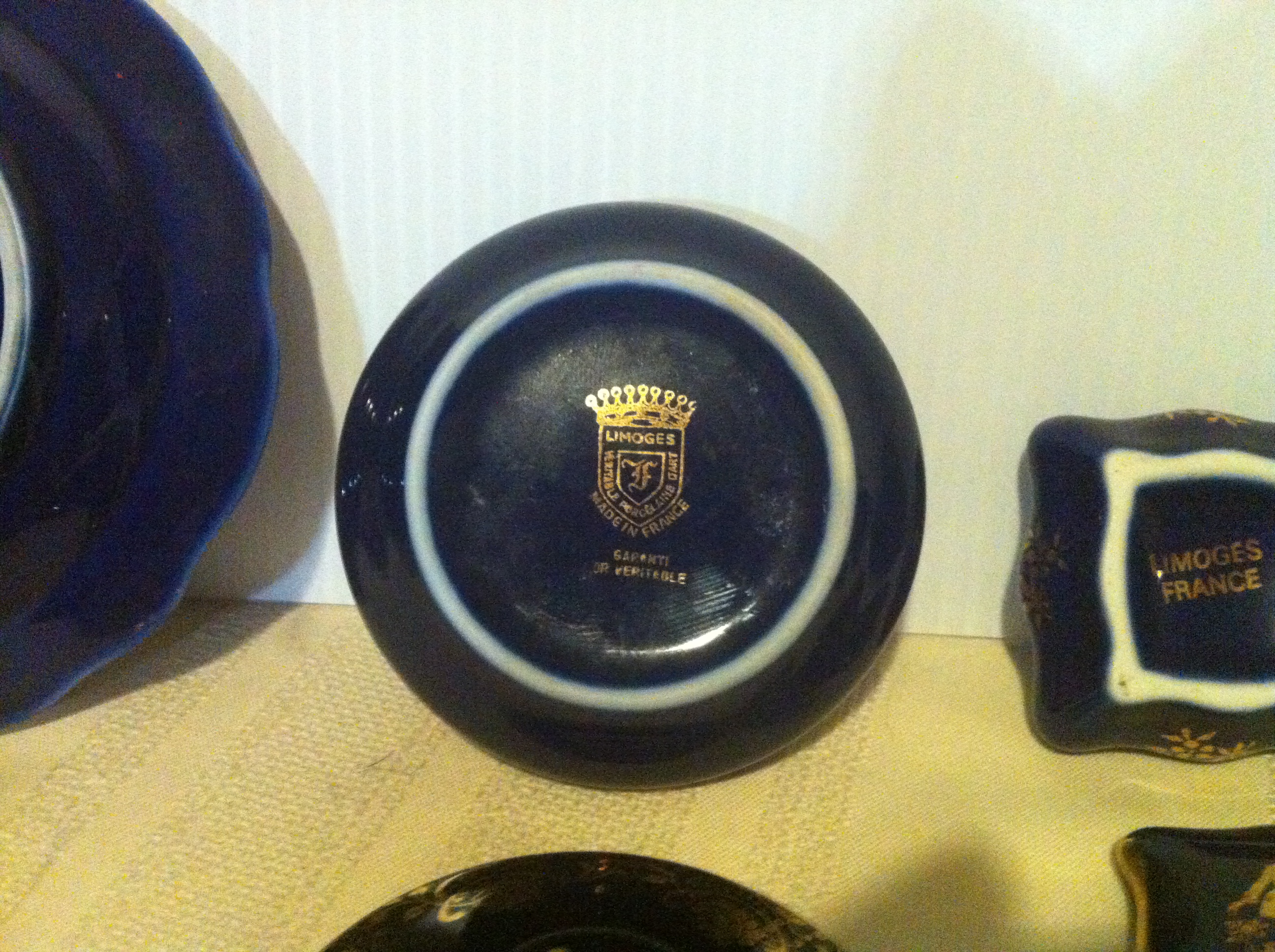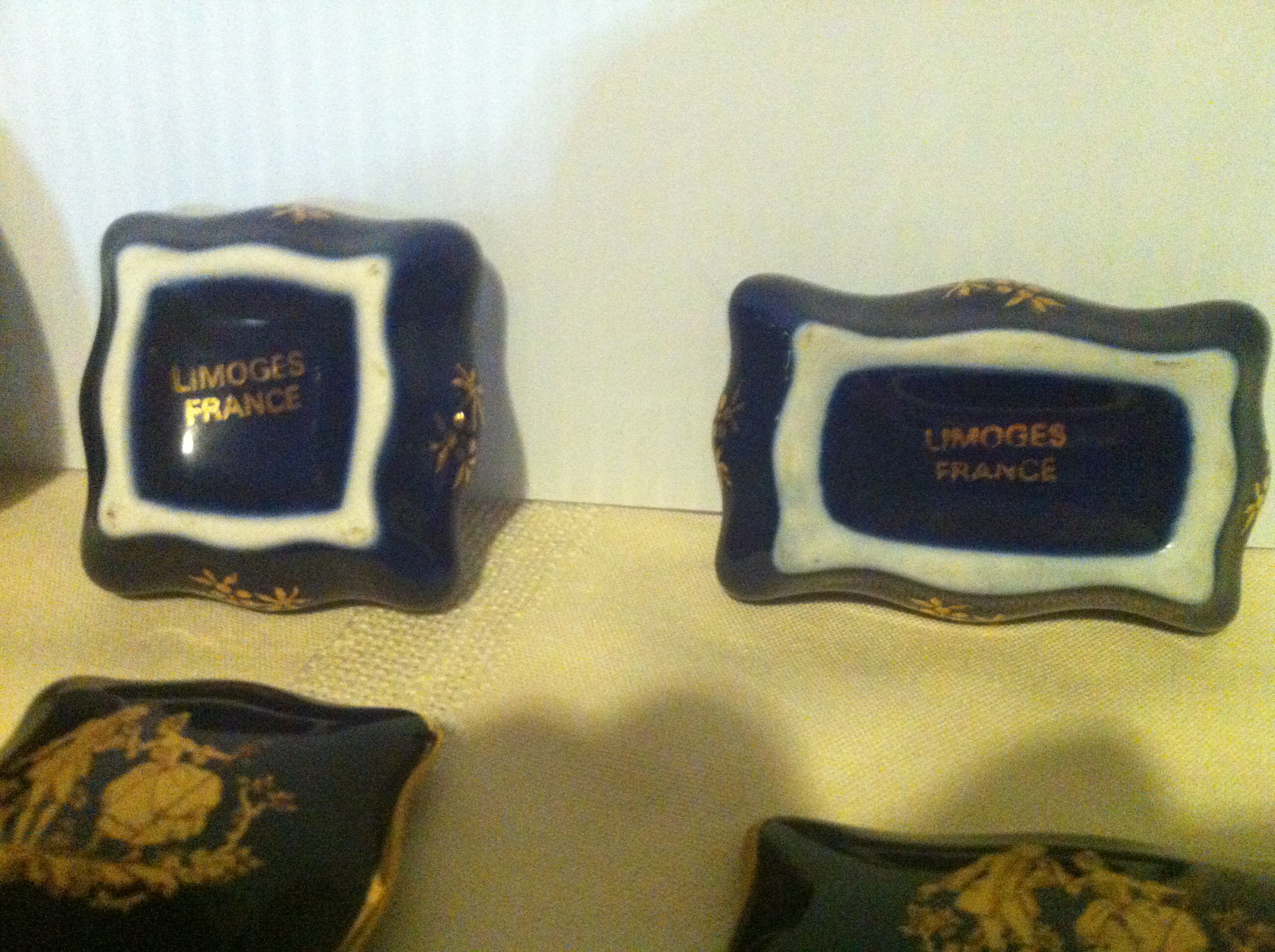 Blue and Gold trinket boxes with a courting couple. The round box and ashtray have a Limoges La Seynie F mark on the bottom. The Square & rectangle boxes have Limoges on the bottom. I saw the round box and the ashtray on justantiques.com with the same markings estimated at a crazy amount. Overall, all the pieces are in very good condition. The ashtray has a little wear by one of the flat gold areas. I would like to know if anybody has any info on these items. Thanks!