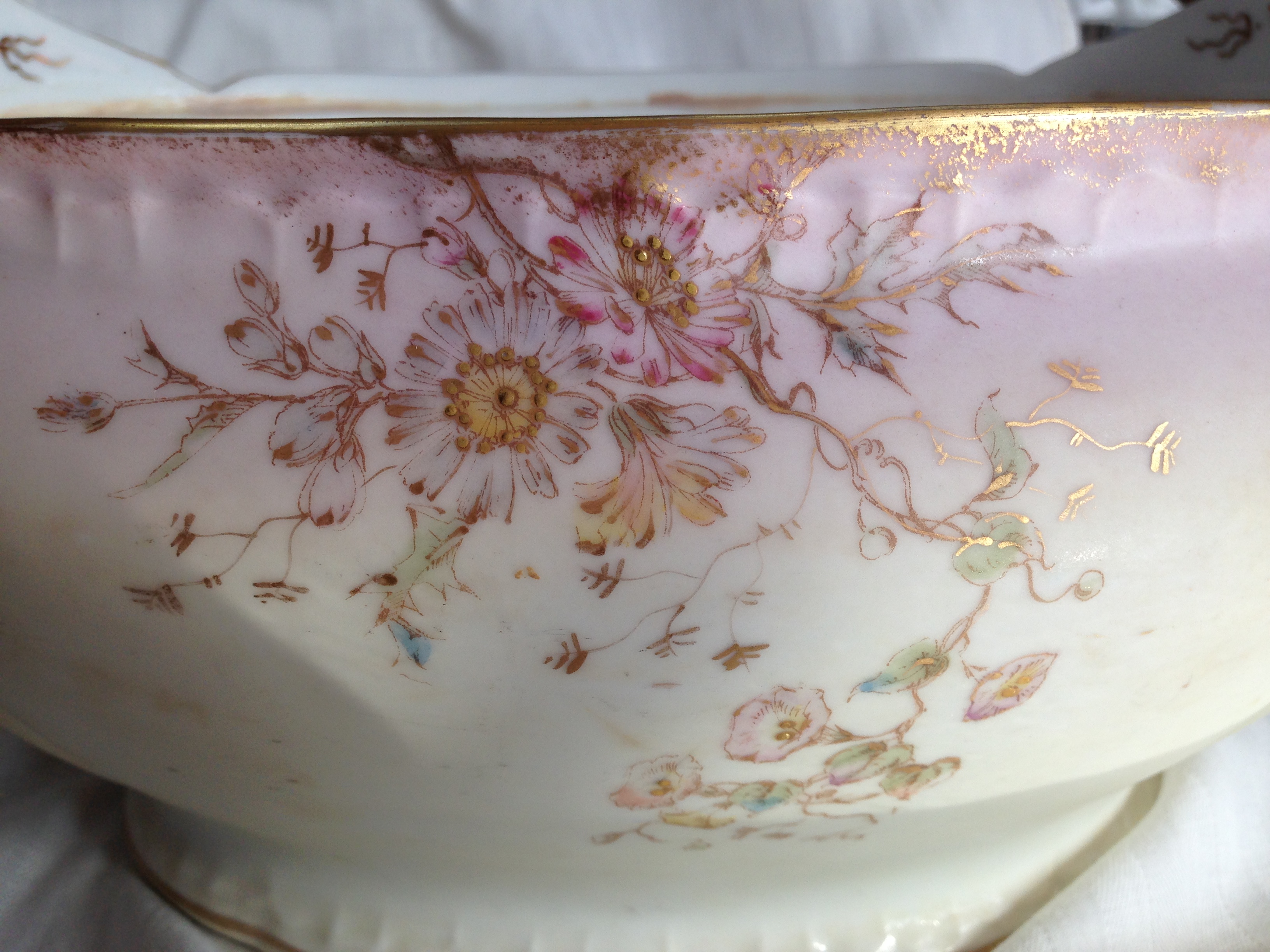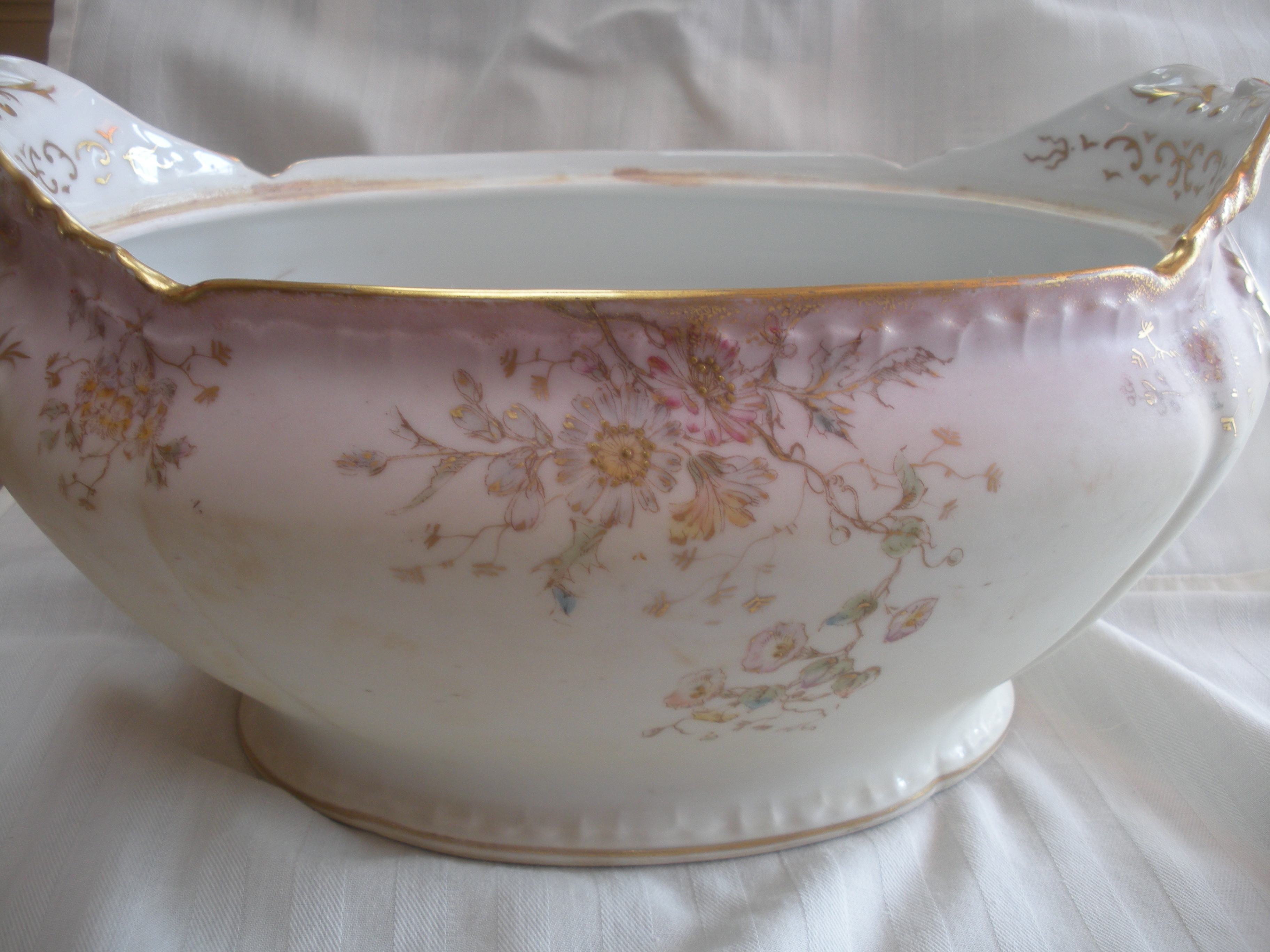 Attached are 2 photos of a Limoges soup tureen, 13" long with a matching 15" base (not shown).