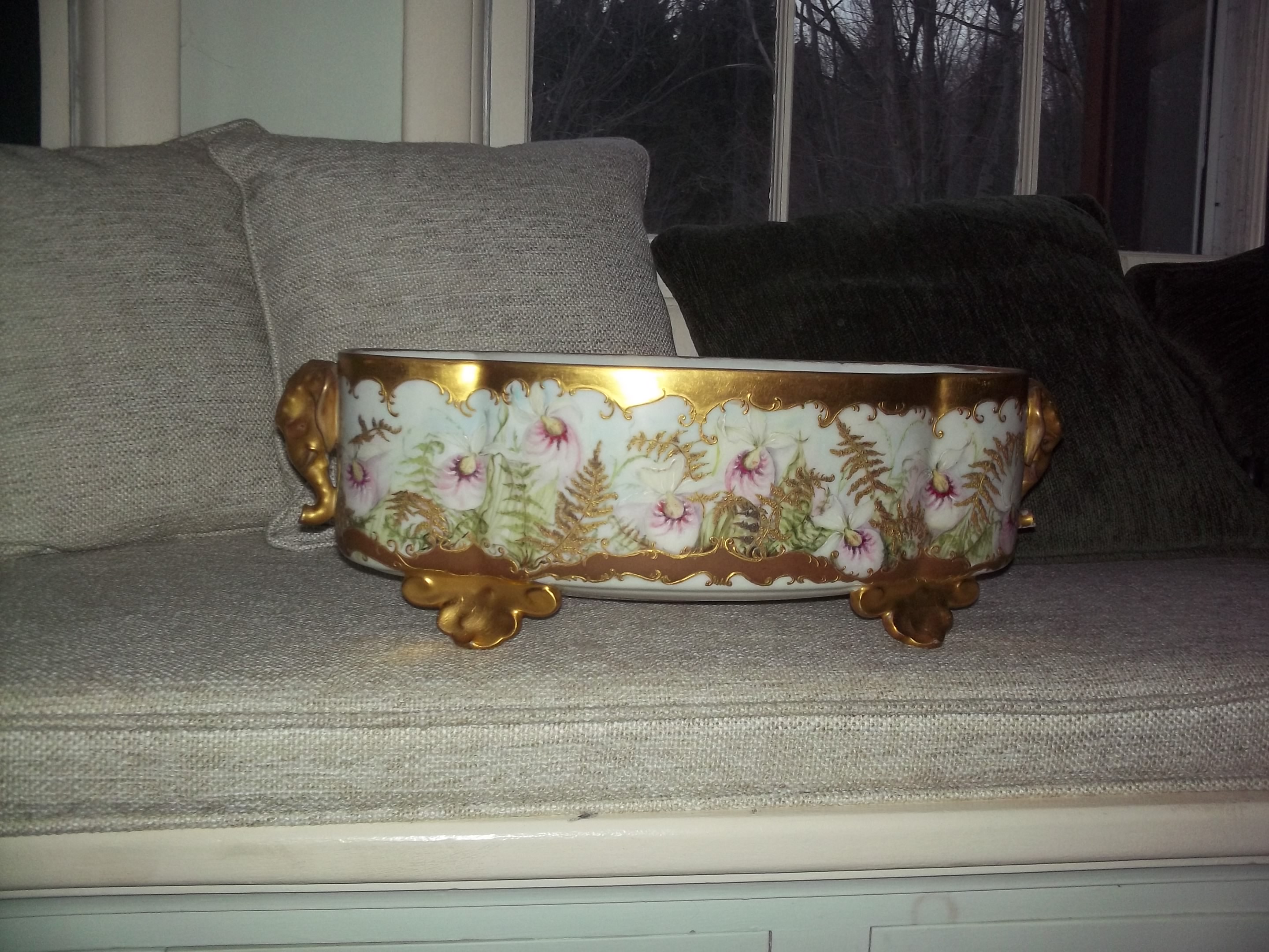One of a kind -1894 hand painted (H&C) Limoges gold elephant bowl and dishes. Many of the matching dishes are signed. The peice is in very good shape with minimal gold rubbed off on the bottom feet. The bowl is oval shaped 17" X 9" . There are 12 plates 7.5" in diameter. Many of the plates have been personalized and signed.