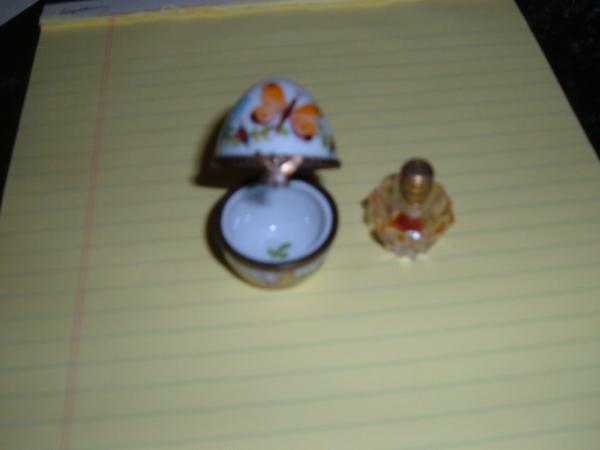 Trying to find some information for my dad on a few eggs that he has. This one is a Limoges Peint Main and has a painting of a butterfly on the outside, when opened up there is a tiny perfume bottle inside. Other markings on bottom of egg are NL and Oufarry. Any info on what the value of it would be great.