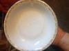round pink plate with pleets gold trim pink flowers in the middle of the plate,