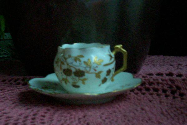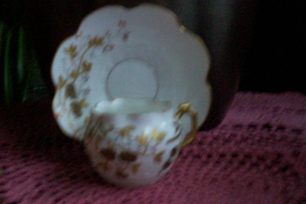 I bought this at a consignment shop in Kentucky for my mother in law. It has an unusual design. I have searched for some time looking for any information on this item. Bottom of cup is stamped with a Red Eiffel Tower and says Limoges. There were so many companies that it is very difficult to find out how old it is or what it is worth. Any information would be greatly appreciated. Haven’t given it to my mother in law yet because I know she will ask all kinds of questions about it. Thank you for your help. Sorry about the quality of my photos.