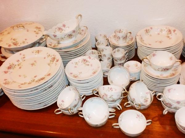 Limoges Theodore Haviland Fine China - service for 12! Approximately 135 pieces total. Only missing pieces are 7 tea cups and 1 individual butter dish (single patty size) - otherwise complete and in excellent condition. Been in the family since new (I am told it was a wedding gift to my great grandmother - and I am just over 60!). The service for 12 includes dinner plates, soup bowls, salad plates, demitasse cups & saucers, consume cups and saucers, butter plates, small dish (perhaps dessert?), tea/coffee cups (only 5, but all plates), butter server, gravy boat and plate, three covered serving dishes, 1 uncovered serving dish, four serving platters. All in excellent condition - as far as I know only one demitasse cup and one tea cup show slight stress crack (nothing broken or repaired) and there are no chips or other damage I am aware of.