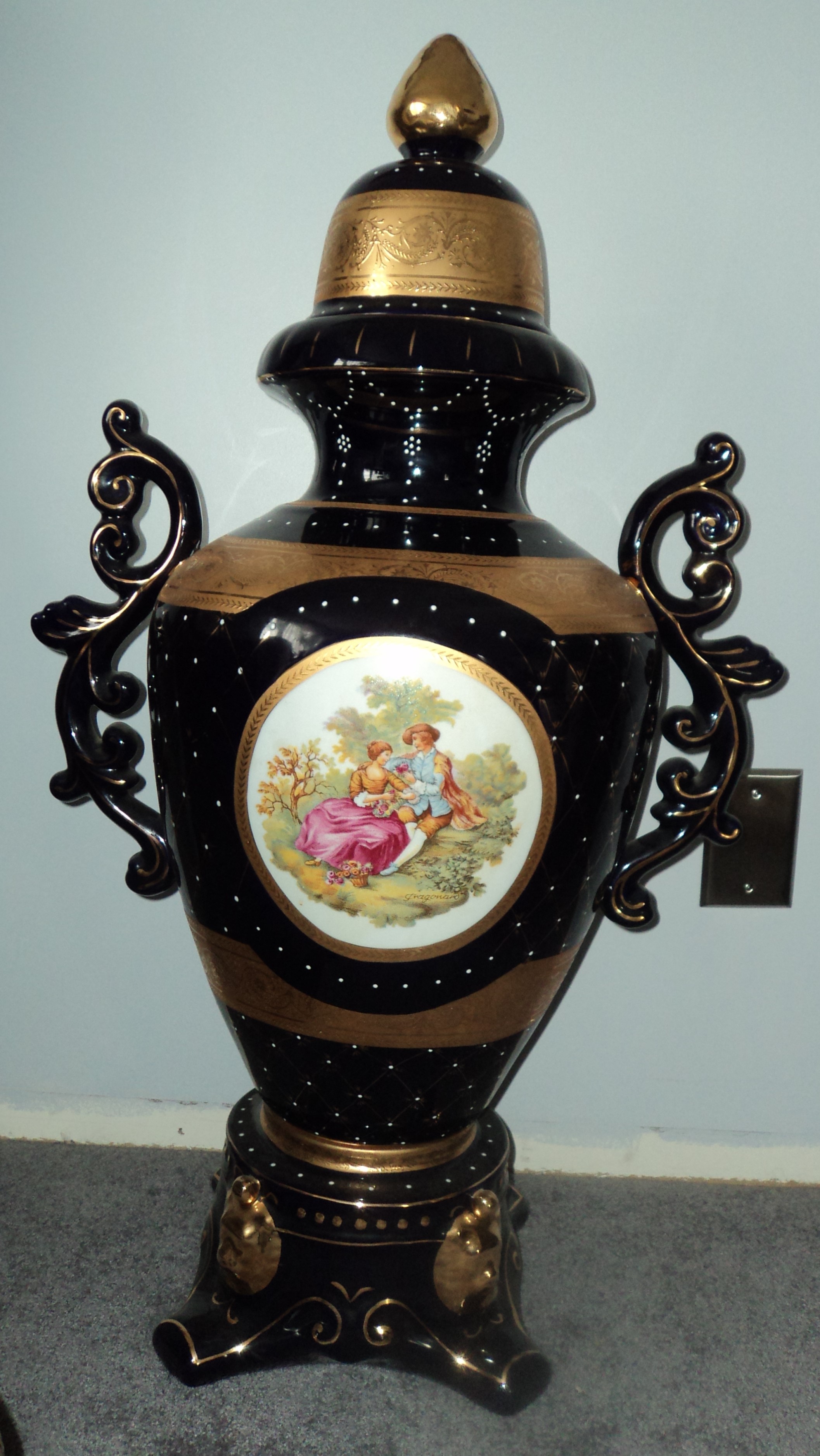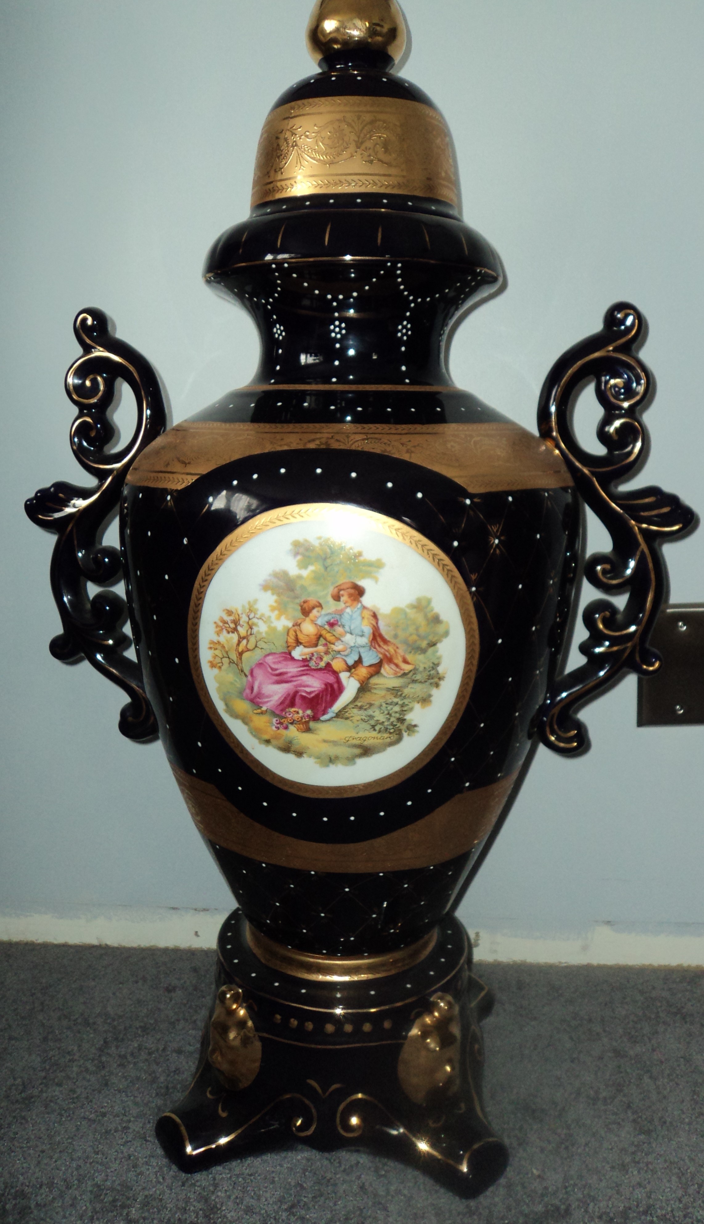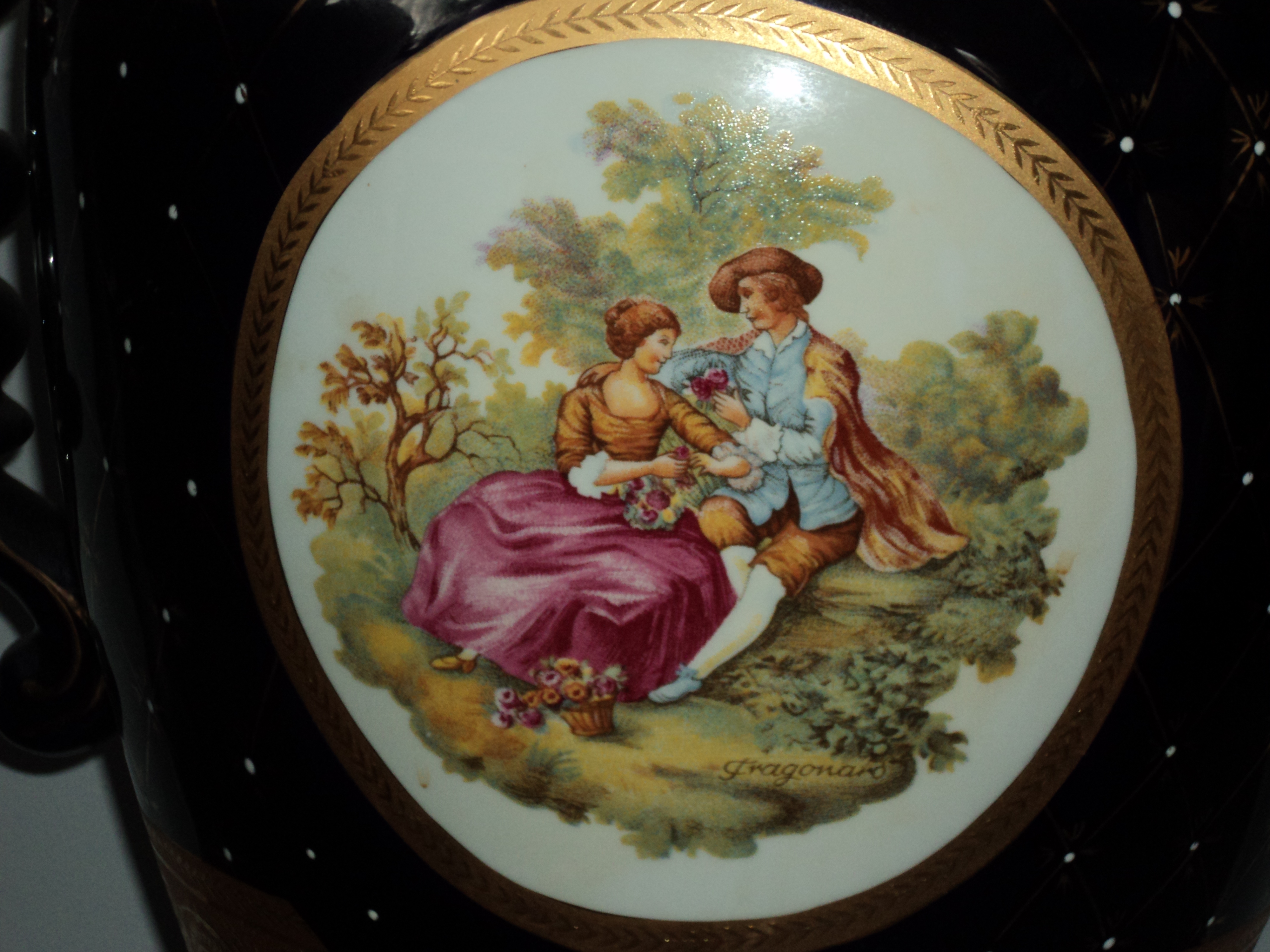 Limoges Urn "courting" Large with intact lid. Deep Royal blue with tiny white markingsattached with gold lines.