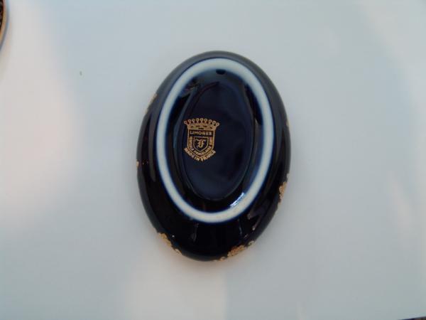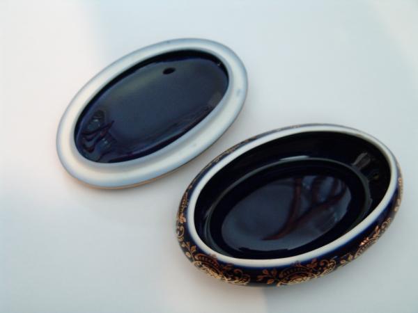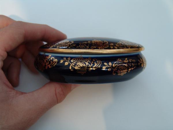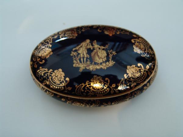 Blue Limoges Veritable Porcelaine d'Art with gold accents. Oval in shape. Picture of a man and woman dancing on the center of the cover.