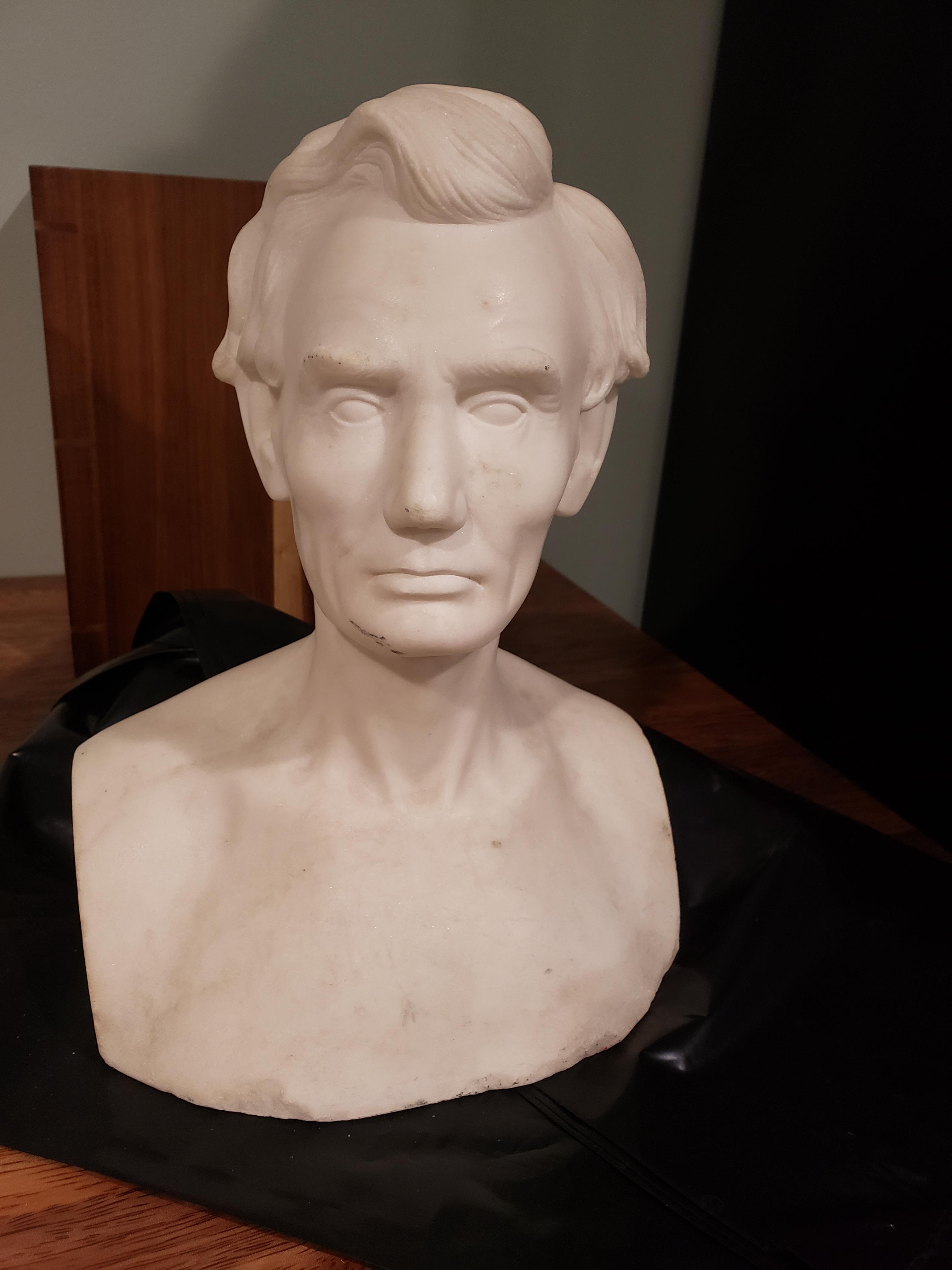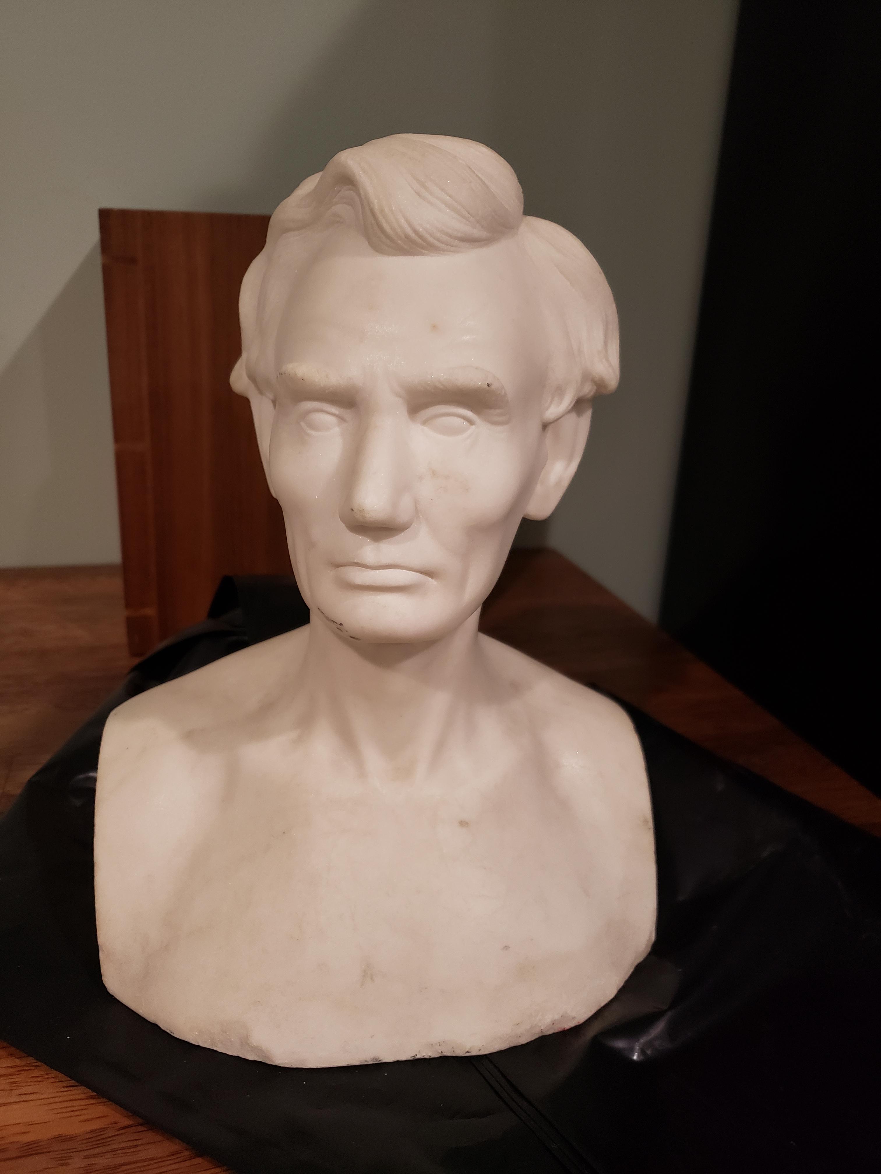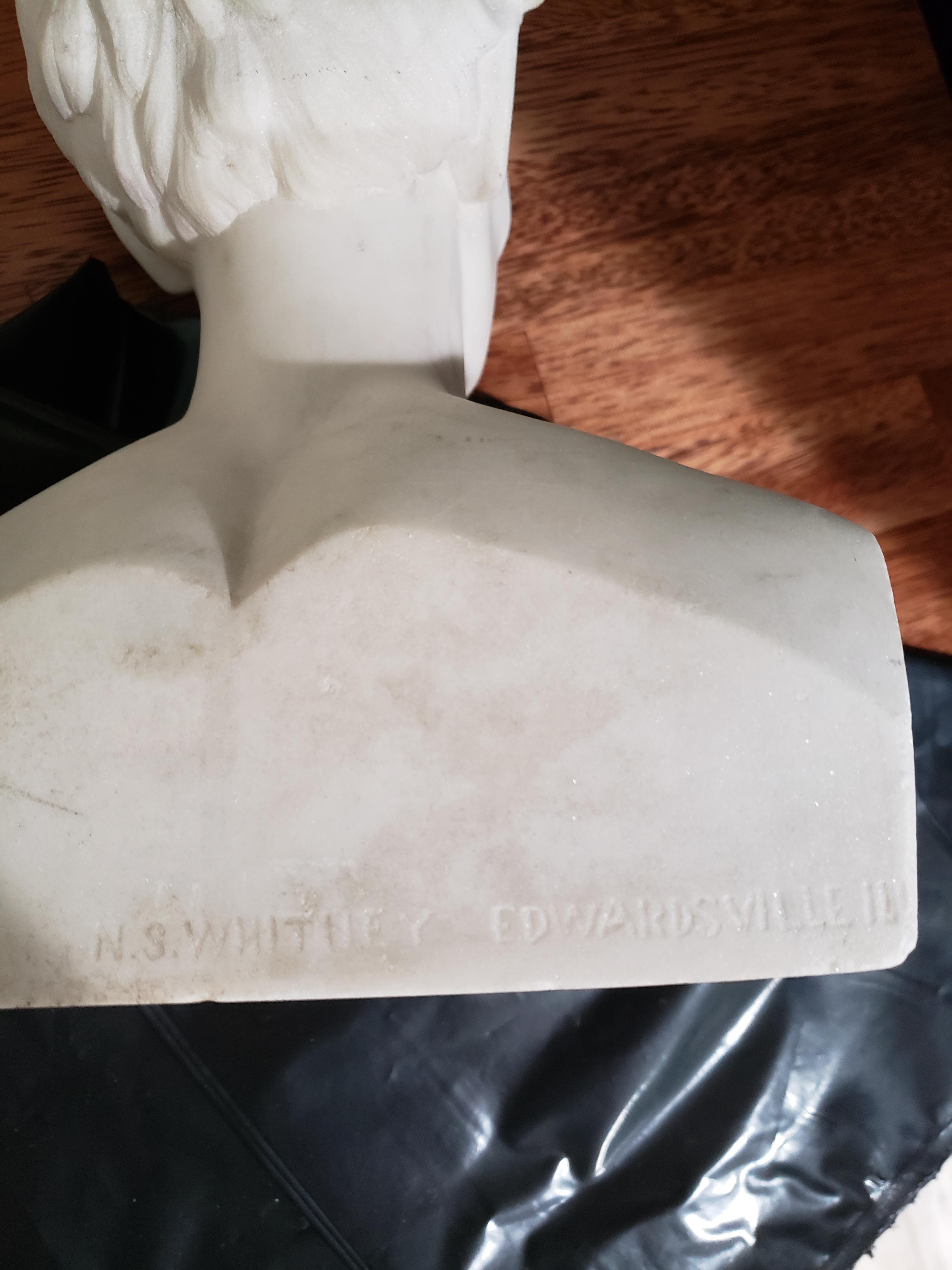 N.S. Whitney Edwardsville IL engraved on the back. I was able to find that N.S. Whitney moved to Edwardsville in 1860 and died sometime around 1880. He was the proprietor of Edwardsville marble works. The bust is approximately 12" tall. This came from m grandmother who said it was in a house her family moved into in Illinois when she was a little girl somewhere around the early 1930s.