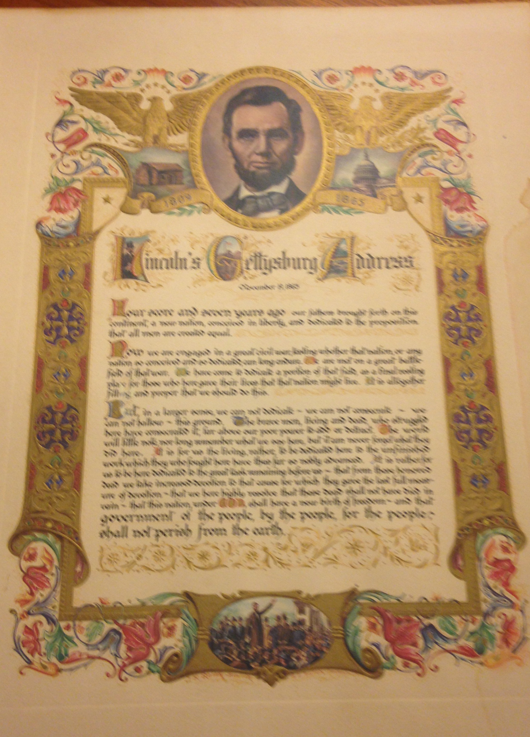Lincoln's Gettysburg address has been reproduced since he first gave that speech and goes through revivals of popularity at each major anniversary in Lincoln's life or the Civil War period. This example was produced circa 1930-1950. They go for about $40.00 at auction.