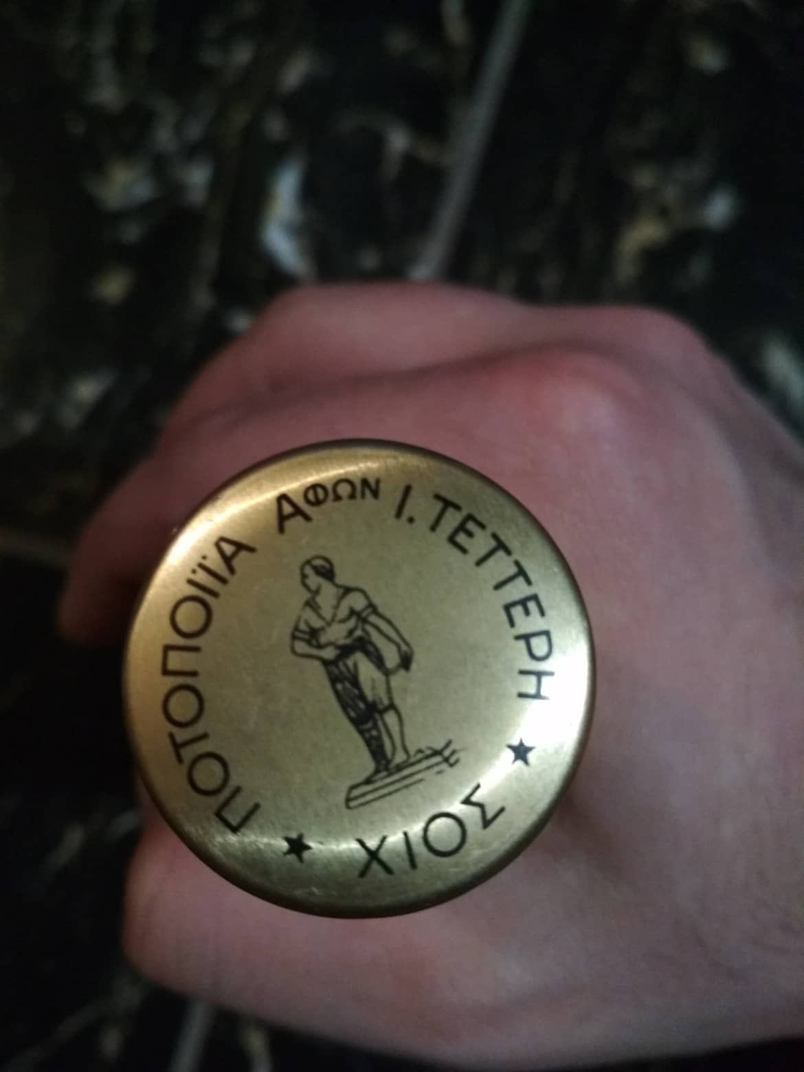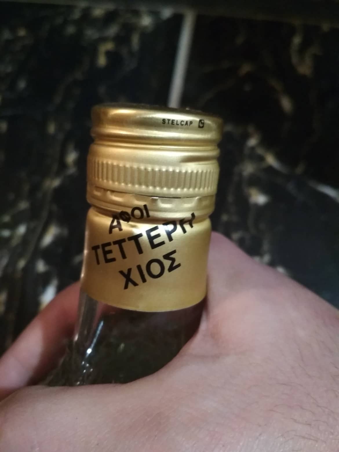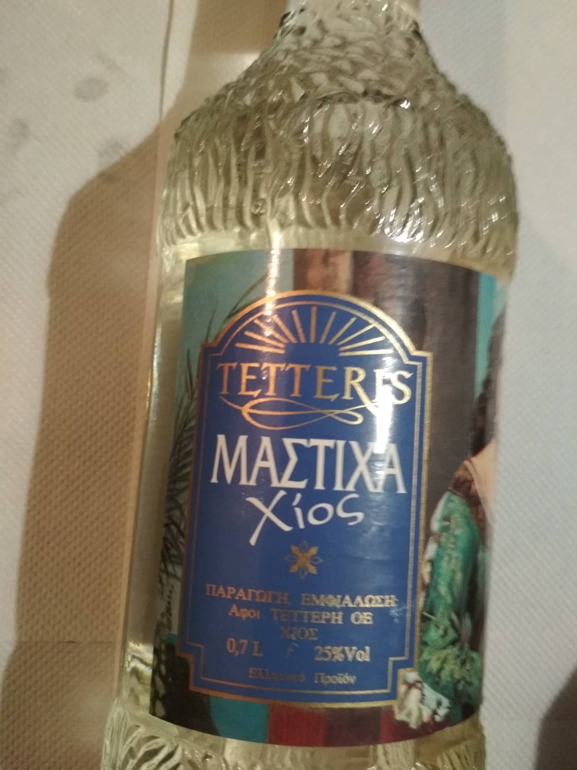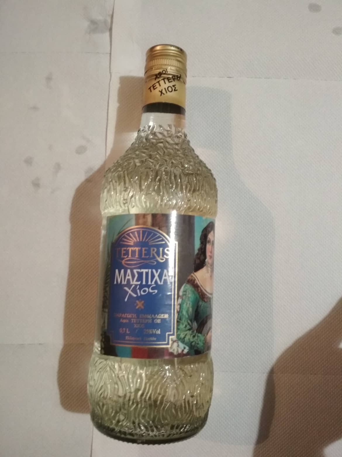 A product that is produced only in Chion, Masticha Liqueur. It's closed. Bottle has " YLA 4 " at the bottom. Greek product.