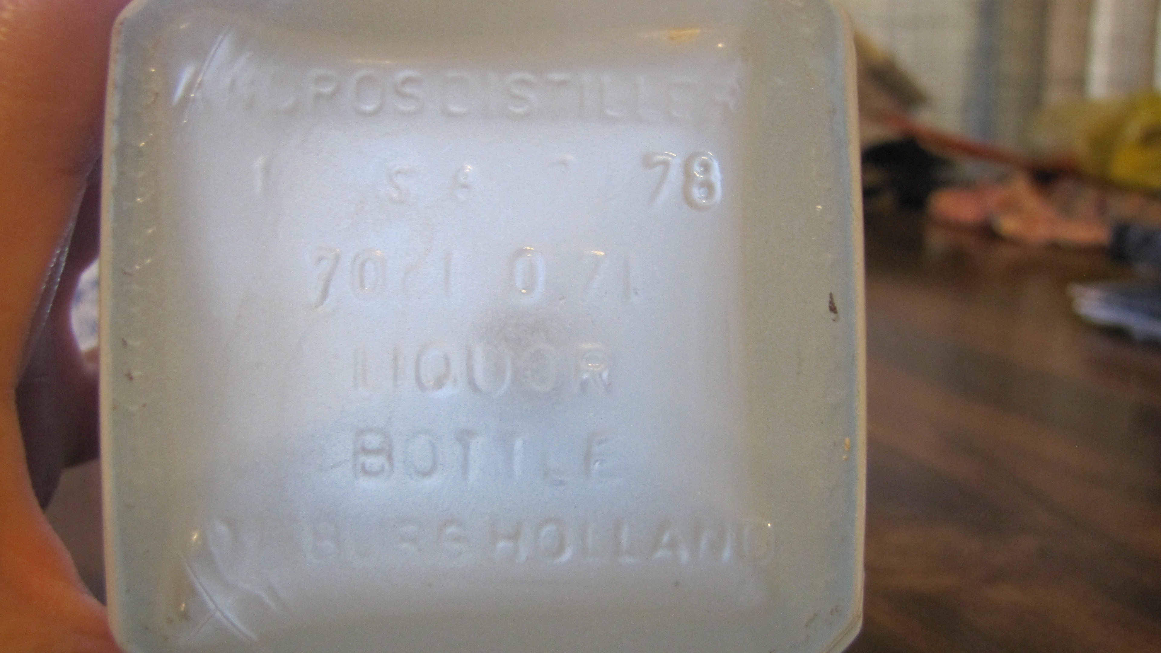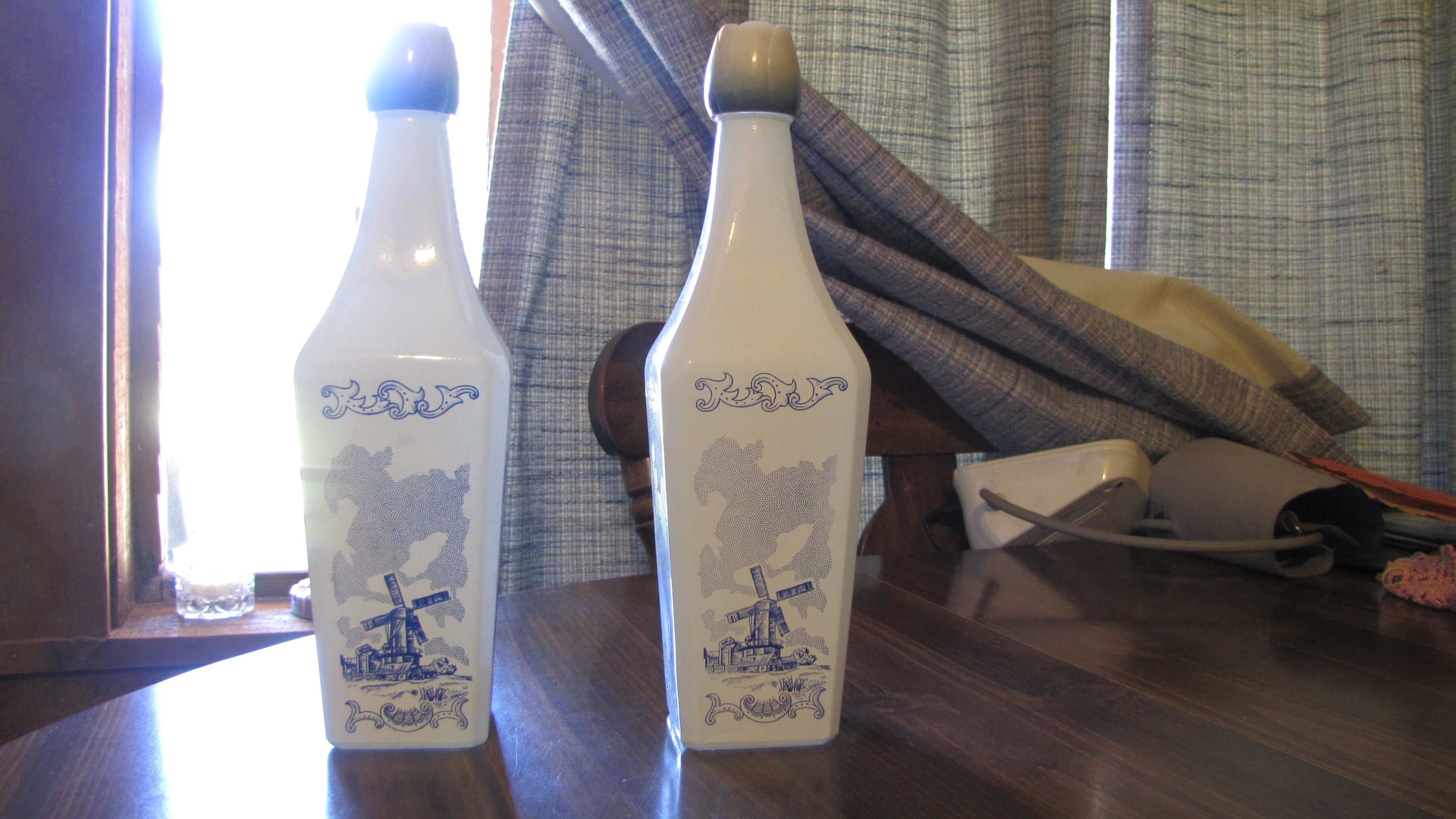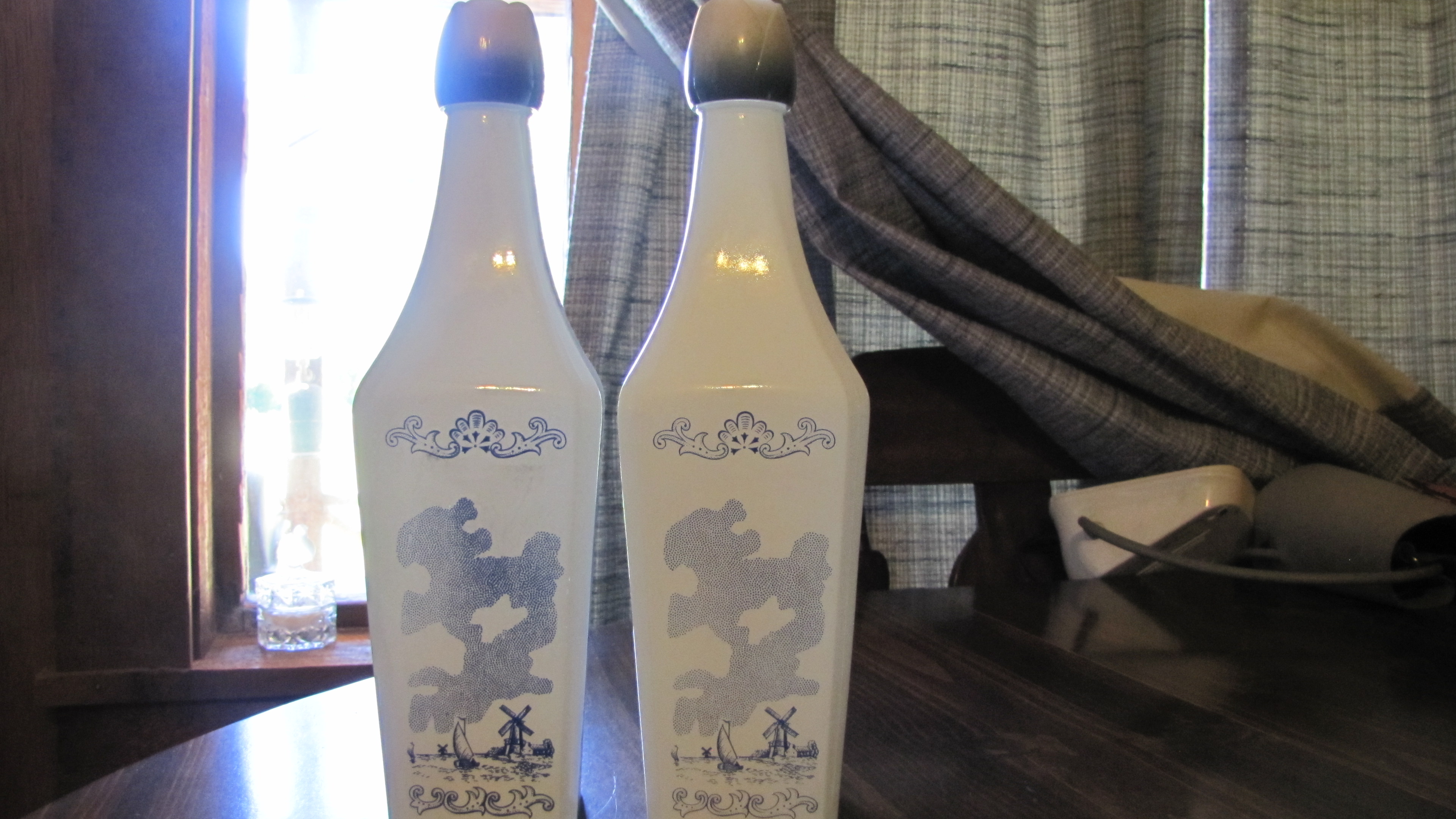 two liquor bottles from andros distillery in tilburg holland from 77 and 78. white with blue windmill scenes and tulip lids.
