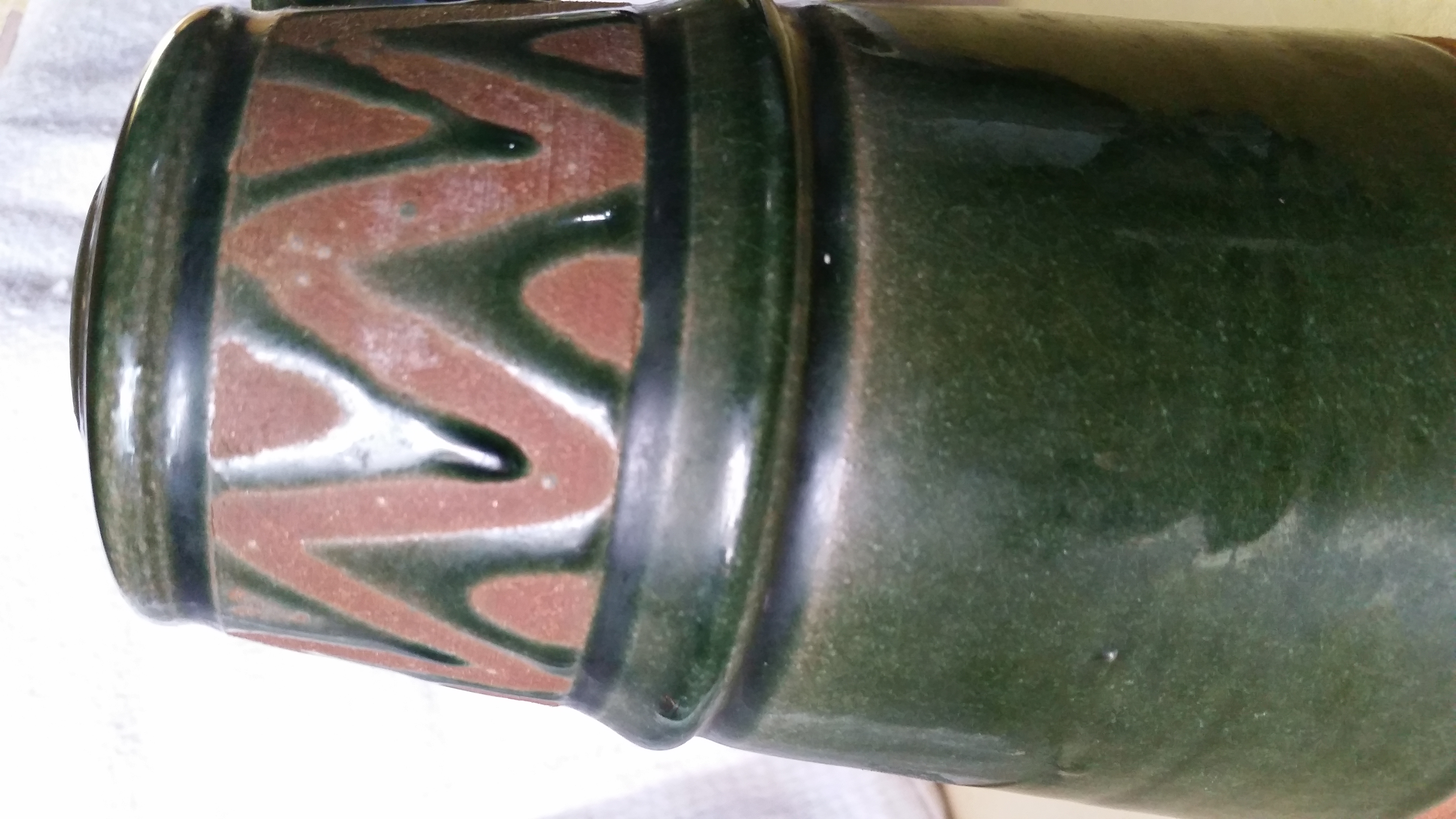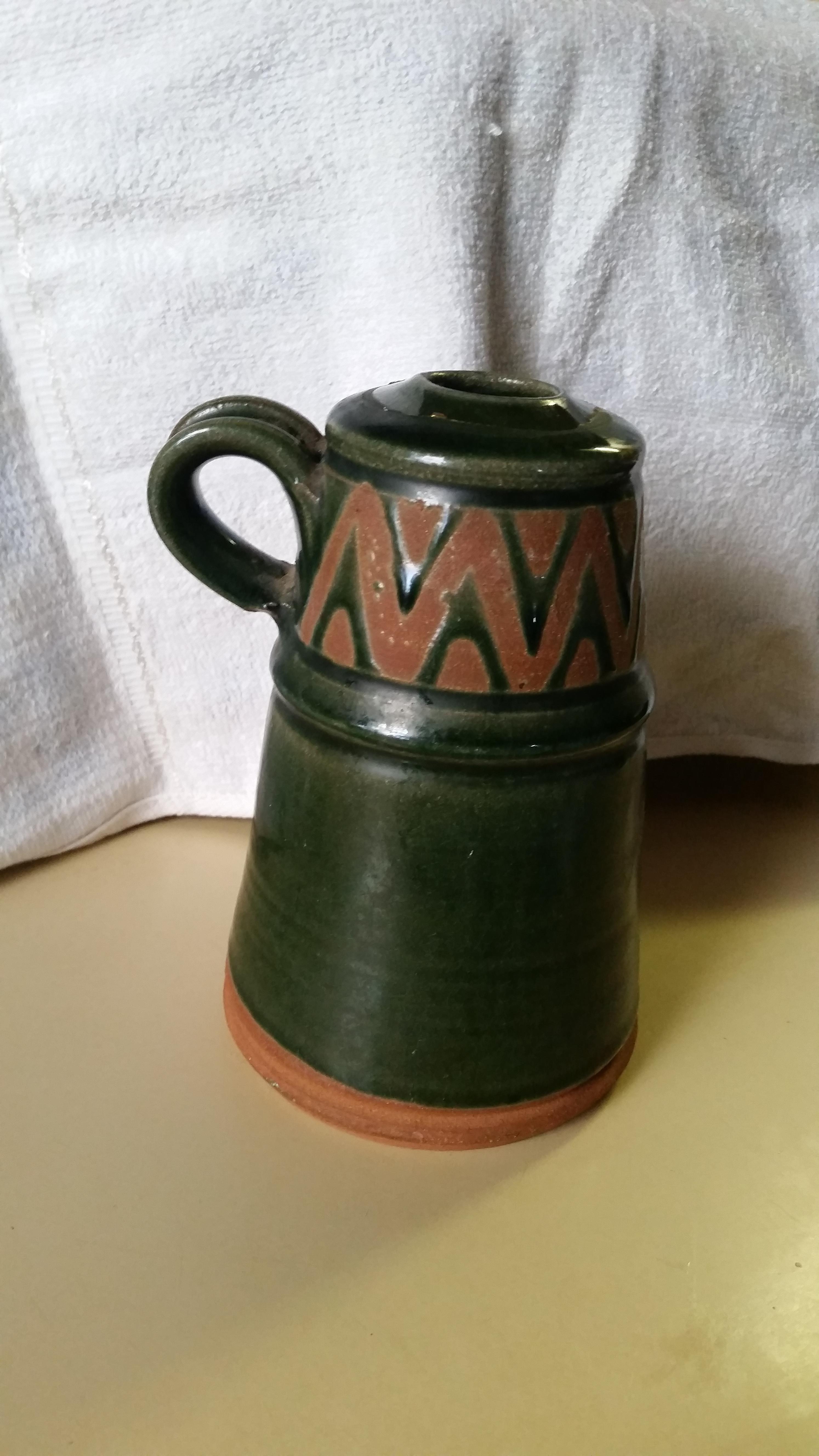 Lisa Tevia pottery piece, approximately 6" tall and 4" wide at the base. Her married name is now Lisa Tevia Clark. So i would assume she made this before she got married. She and her husband now own a Fine tile company called Bella Vista Tile. The bottom is marked with her name and Dubois, Wyo.