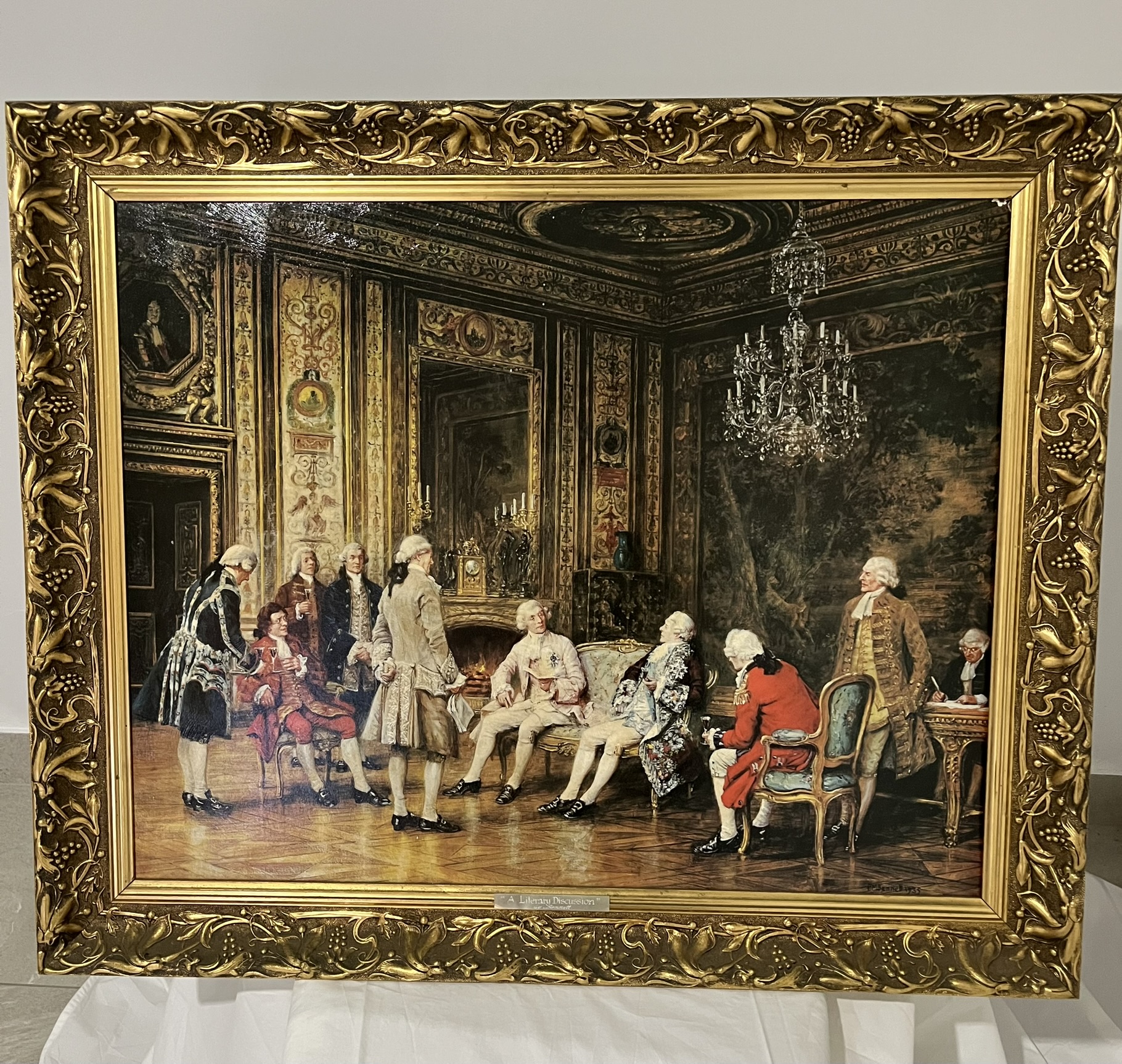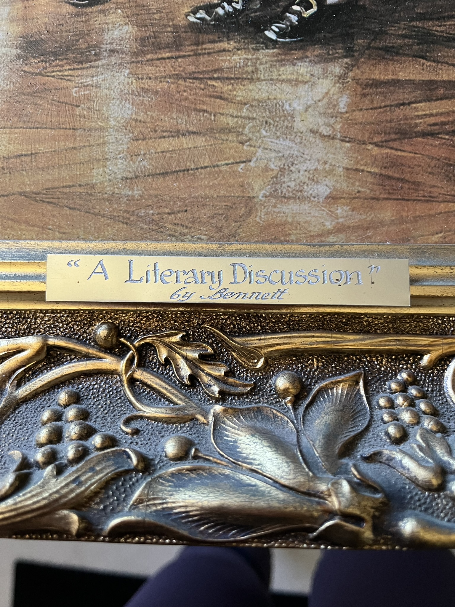 LARGE F M BENNETT PRINT OF " A LITERARY DISCUSSION" SIZE 75 cm X 60 cm IN GOOD QUALITY FRAME GOOD CONDITION, IT HAS A VARNISHED FINISH TO APPEAR LIKE OIL PAINTING .