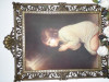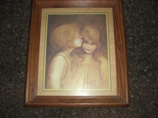 “A little Kiss” is a lovely print of one her well-known vintage images from her early career. Kane captures a sweet moment as a young boy plants a soft kiss on the cheek of a beautiful little girl in this charming piece. Rich browns and ochres dominate the color palette in the piece giving it an incredible glow of warmth. The print gives the illusion of being double matted but it is an extension of the two-dimensional picture plane. The piece is mounted in a beautiful dark oak frame, complimenting the rich browns of the composition and bringing the total measurements to 17”x 20.”