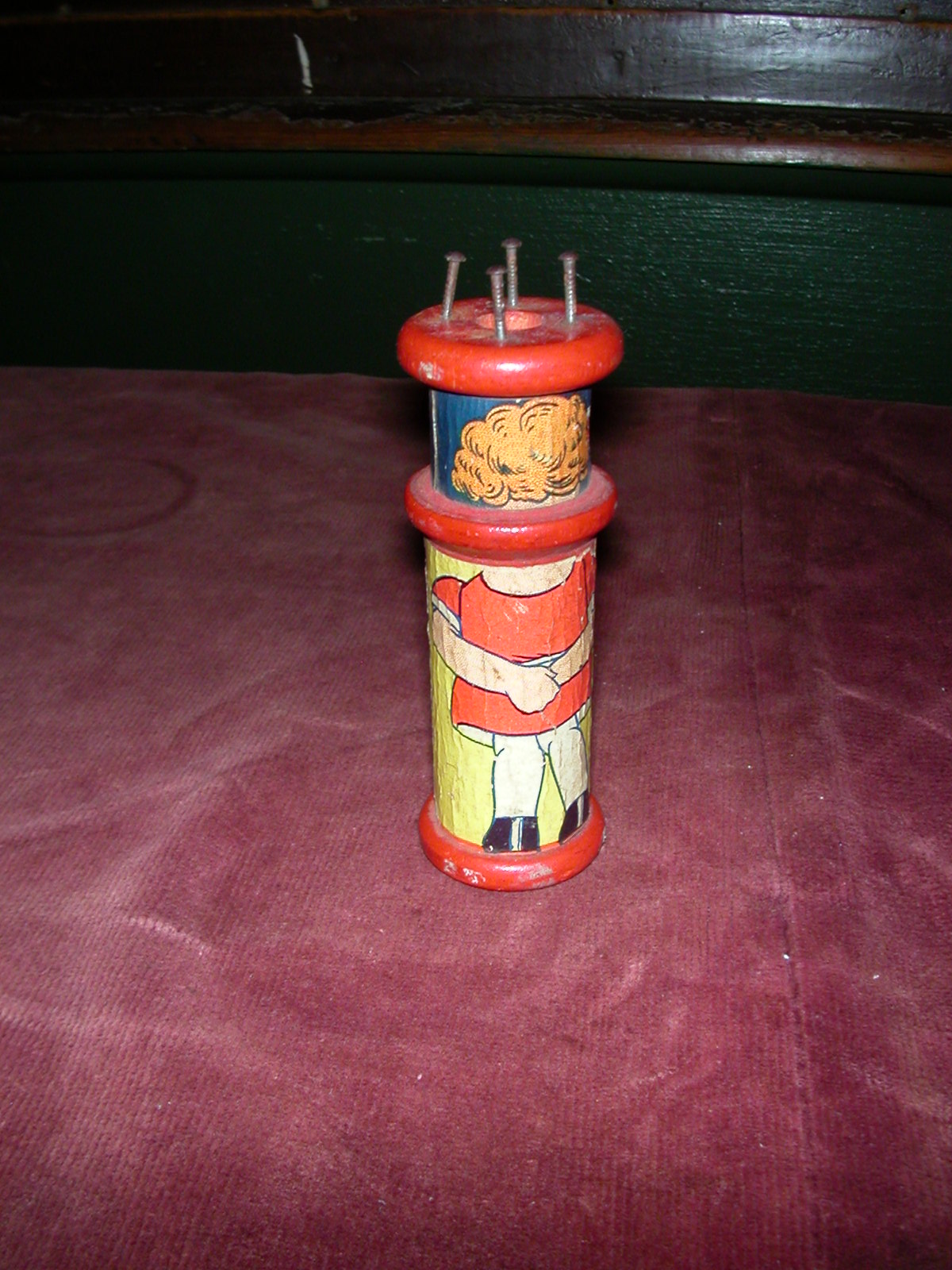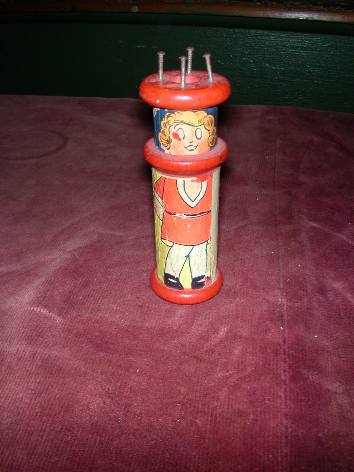 Little Orphan Annie character child's crochet tool /toy. Lithographed paper around red painted wooden cylinder. Cyclinder has a hole running the length of the piece so that yarn can pass through and out of the end. Four tiny brads at the top of cylinder held the yarn.