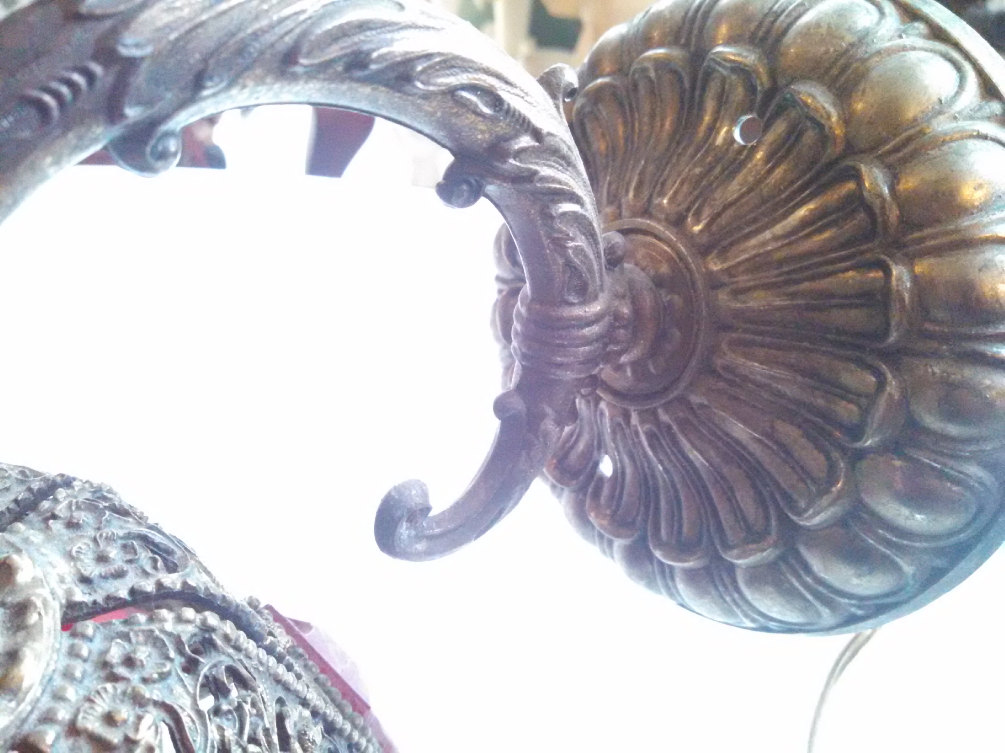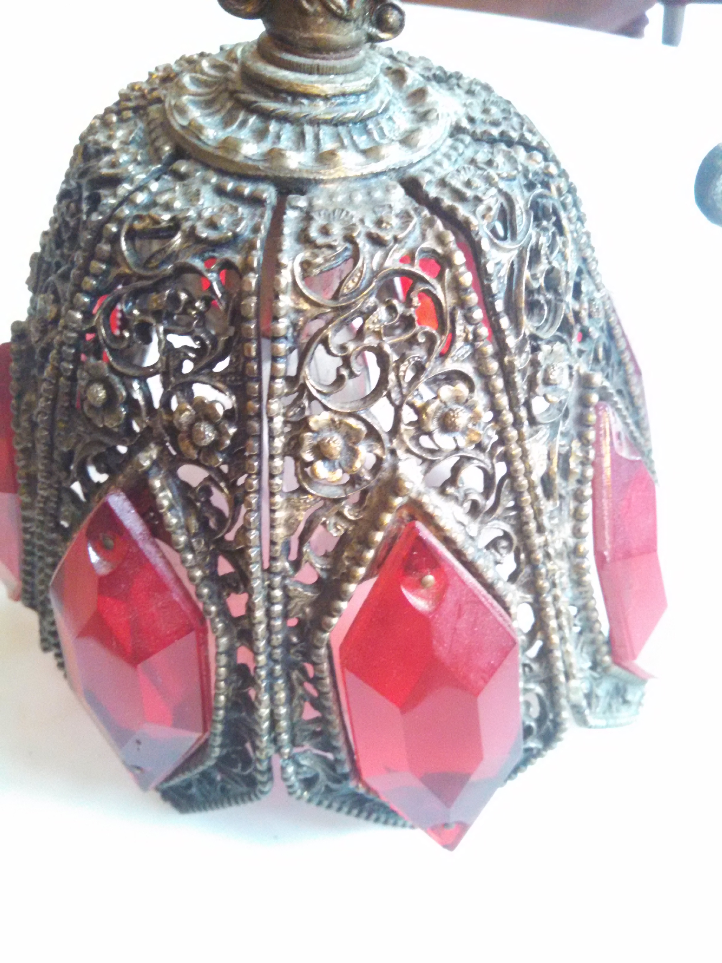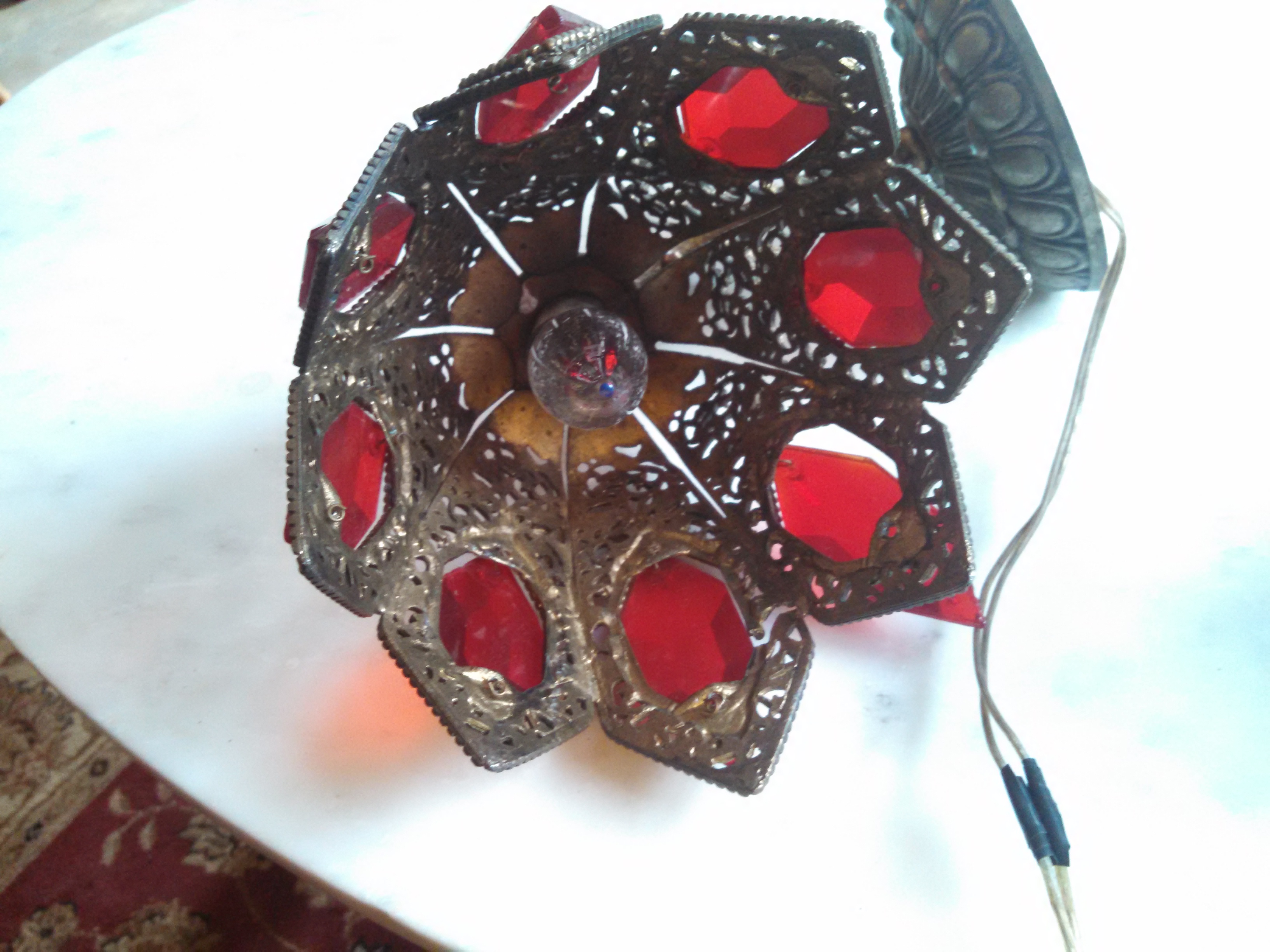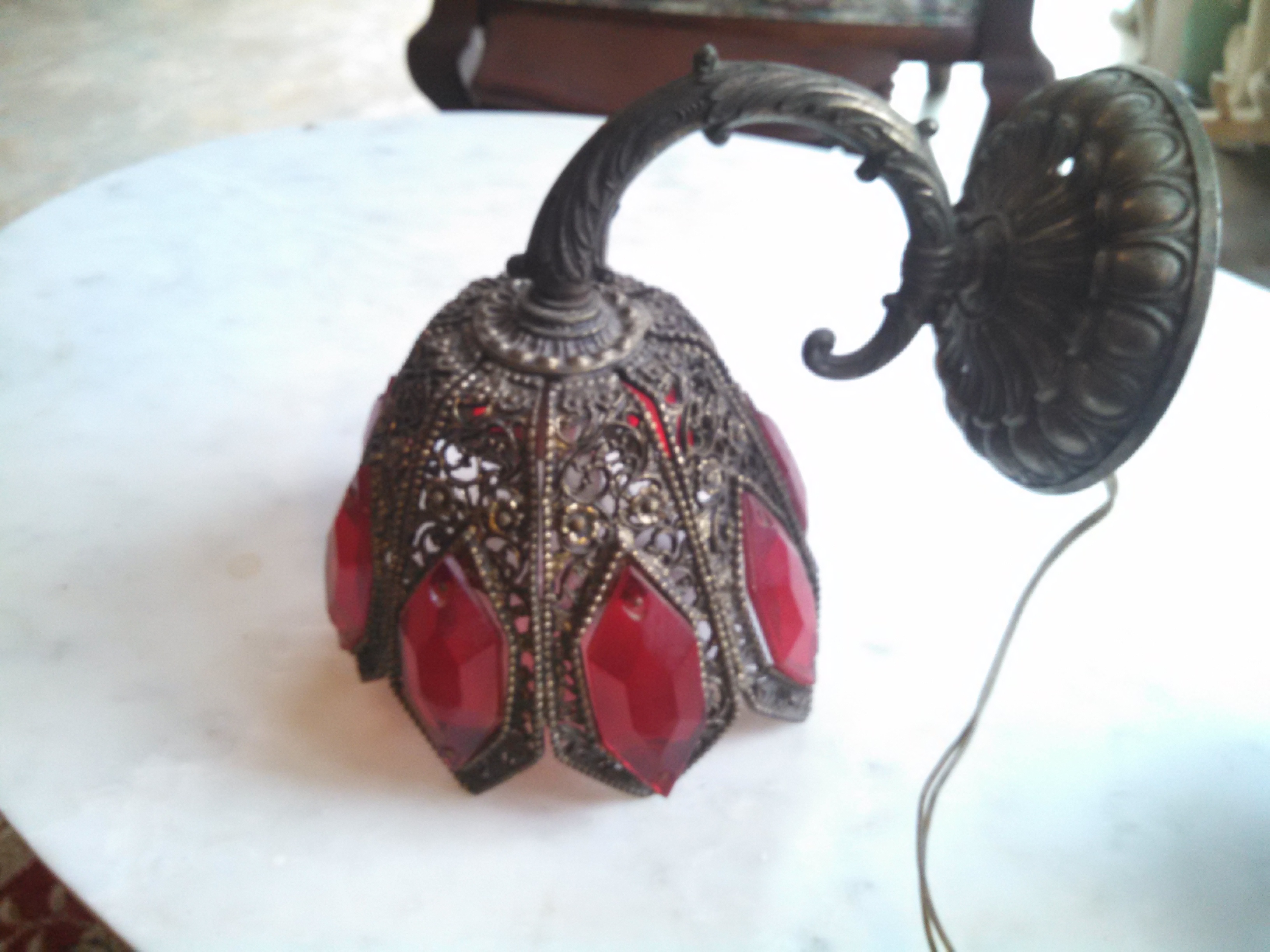Solid cast intricut pattern, strong arm, solid wall plate (rings like a bell when struck), Cut red glass windows, over 1/4" thick, seriel number and markings inside wall plate #9089 Slip 1/16 L&L MWC, wired, works fine, some small breaks in casts, but do not show up unless looking for...beautiful light