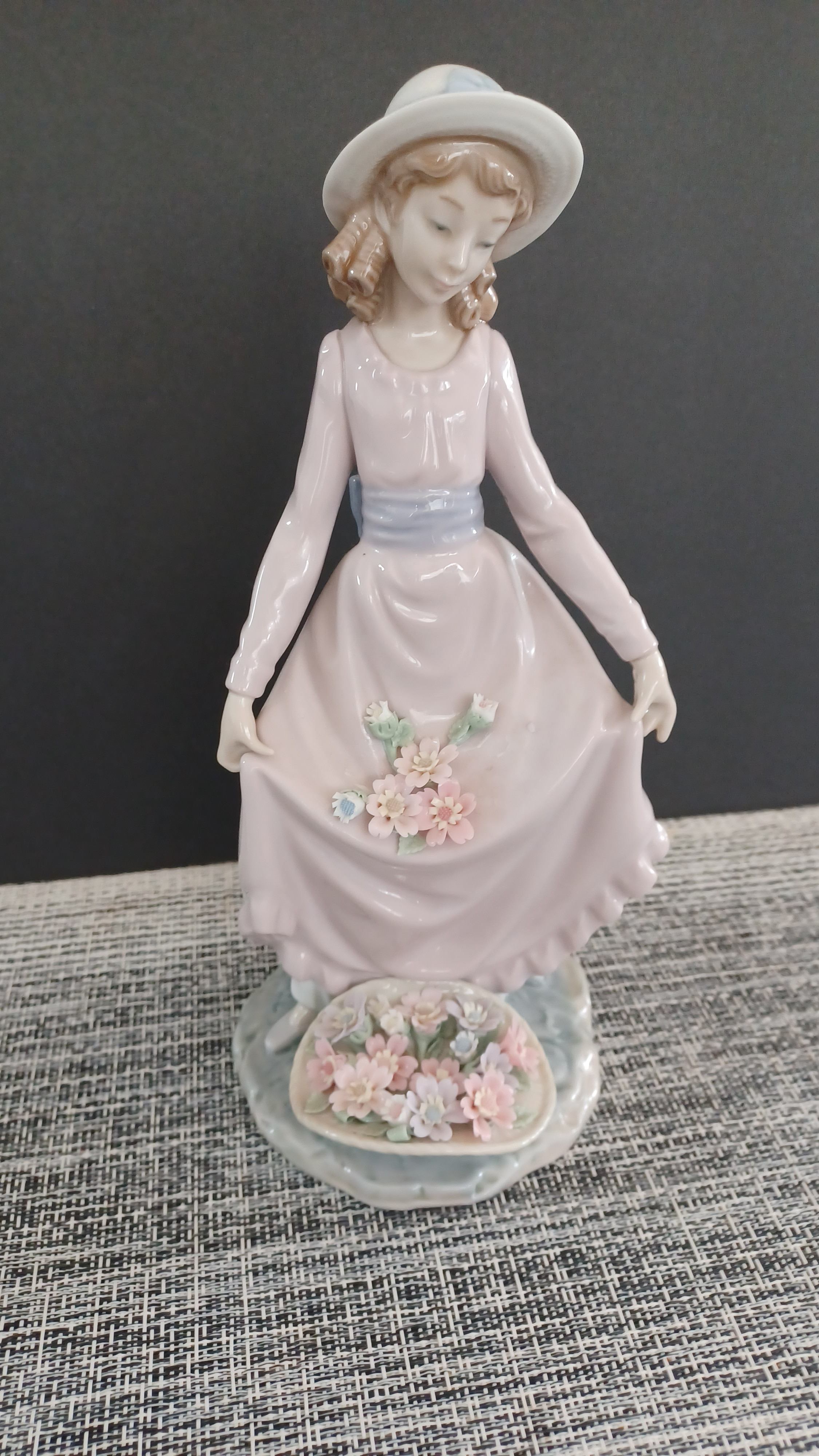 This elegant Lladro figurine depicts a young girl in a pale lavender dress and hat, holding her skirt daintily as a hat full of pastel-colored flowers rests at her feet. It exhibits the classic soft color palette and delicate hand-applied floral detail Lladro is known for. The base marking confirms authenticity and date lineage, referencing the DAISA copyright from 1975, though actual production likely occurred in the 1990s based on finish and model characteristics.