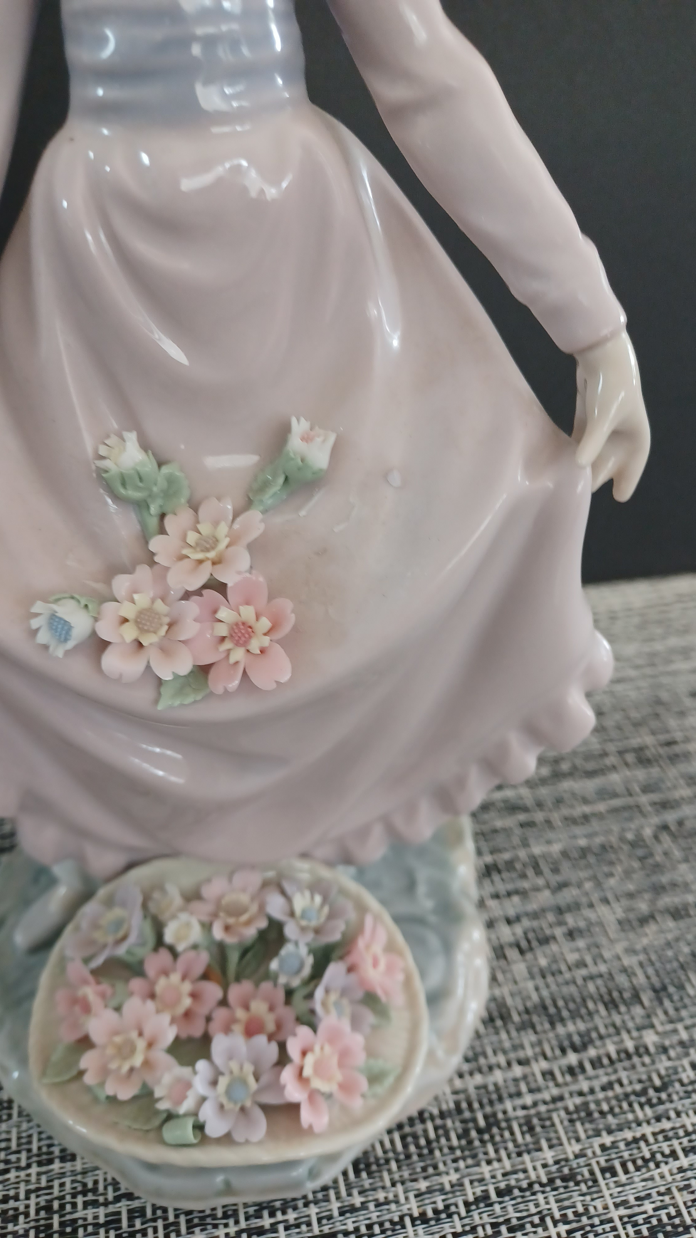 Pastel colors Lladro girl with flowers and basket in porcelain. Some flowers are missing from the dress as shown in the picture