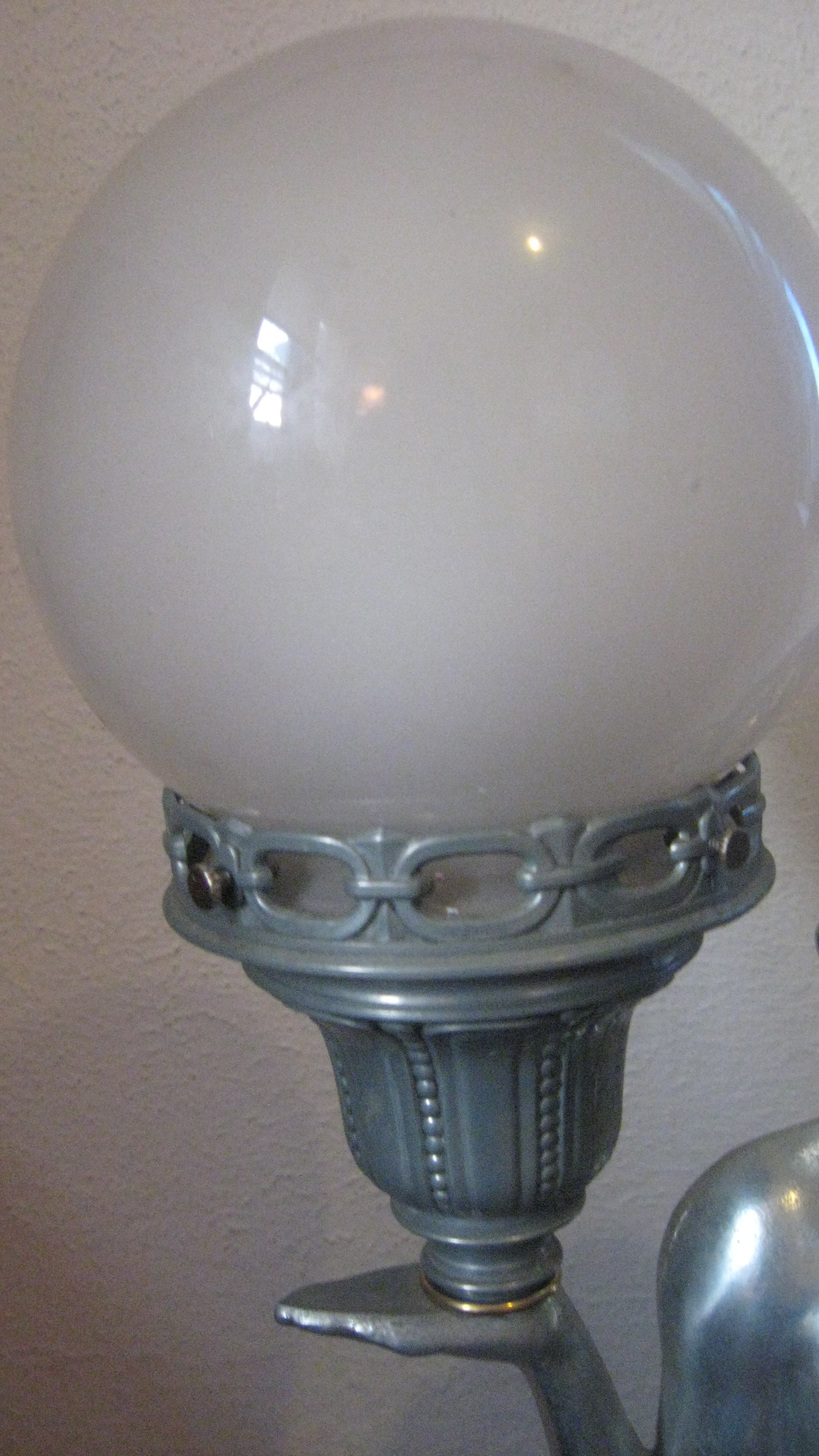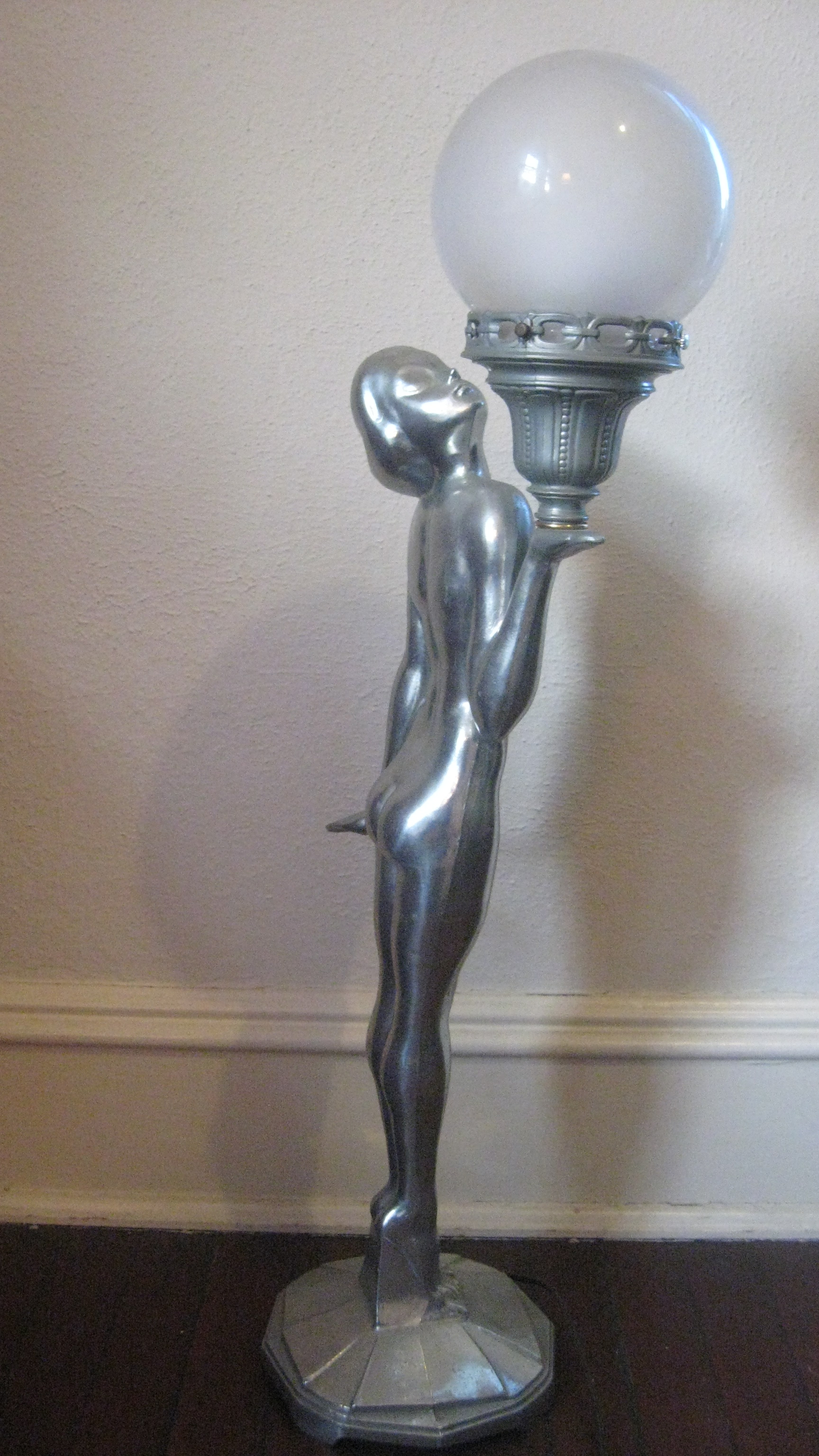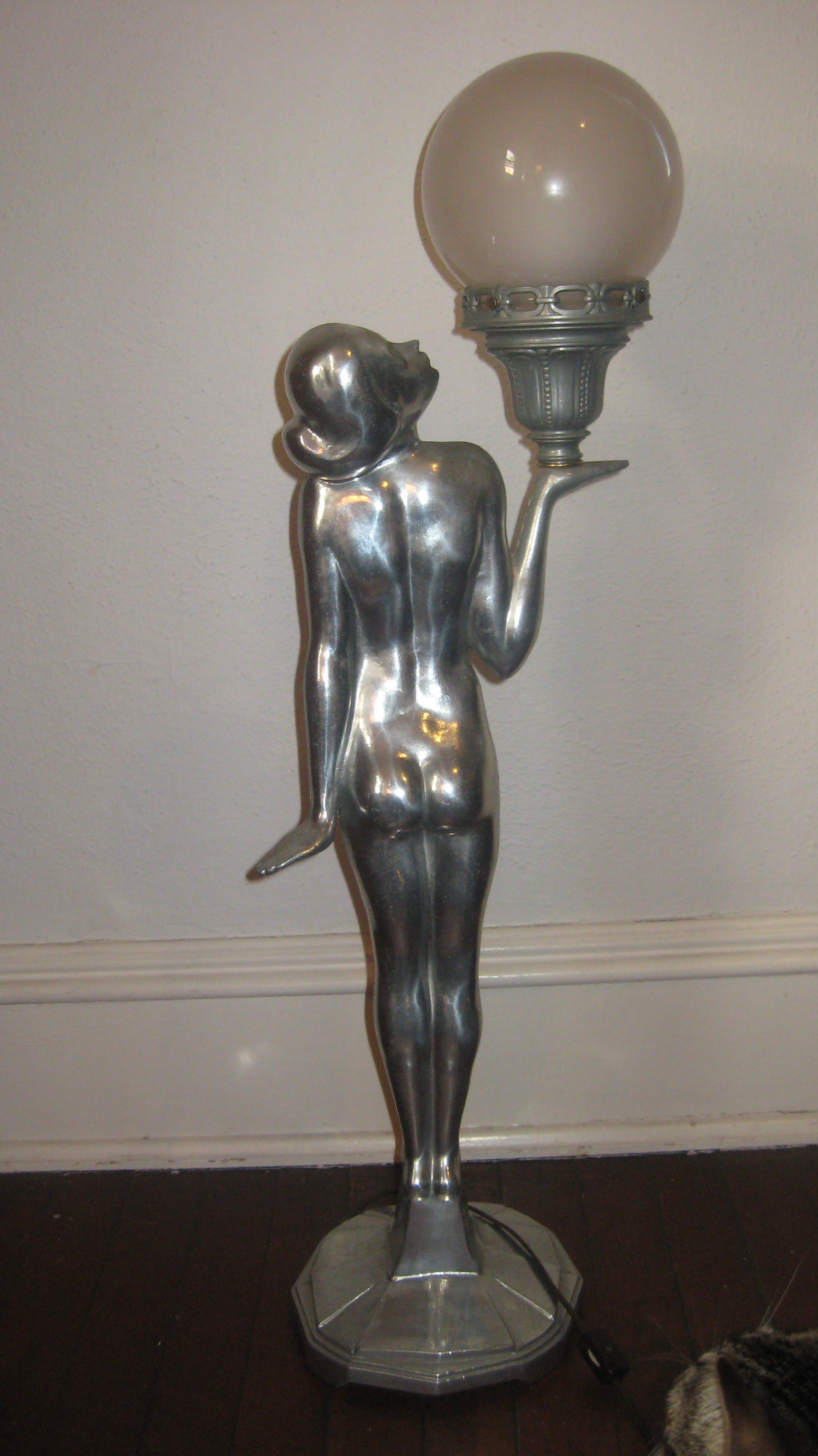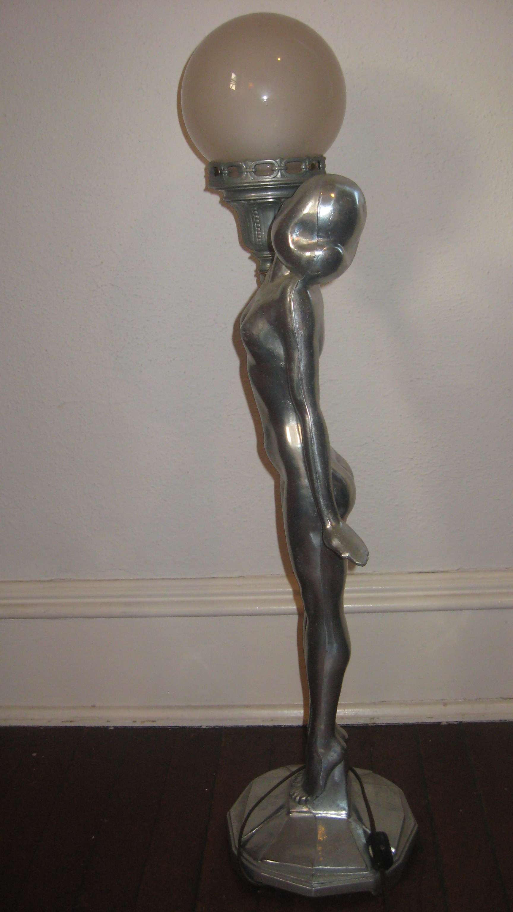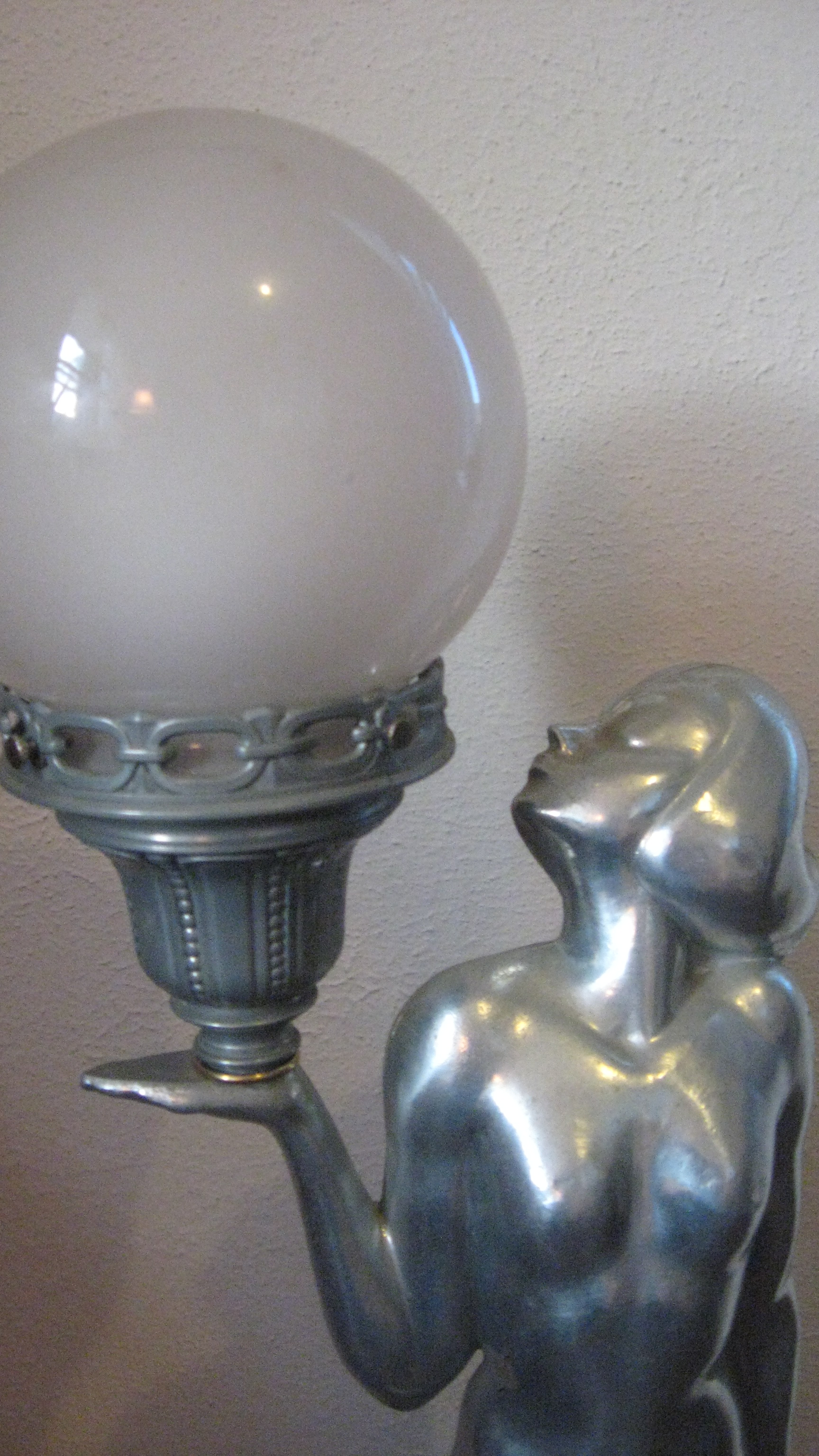Art Deco style nude woman lamp.  in her left hand she holds a sconce with a white glass globe lampshade.  Her head is turned, and she is gazing at the light.  Electrical cord has been refurbished.  Base of lamp is 8", and she stands 31" high.  Base is marked L&LWMC 9937.  The sconce in her hand has a slightly different patina, a little duller than the rest of the lamp, and is marked L&LWMC #9629.