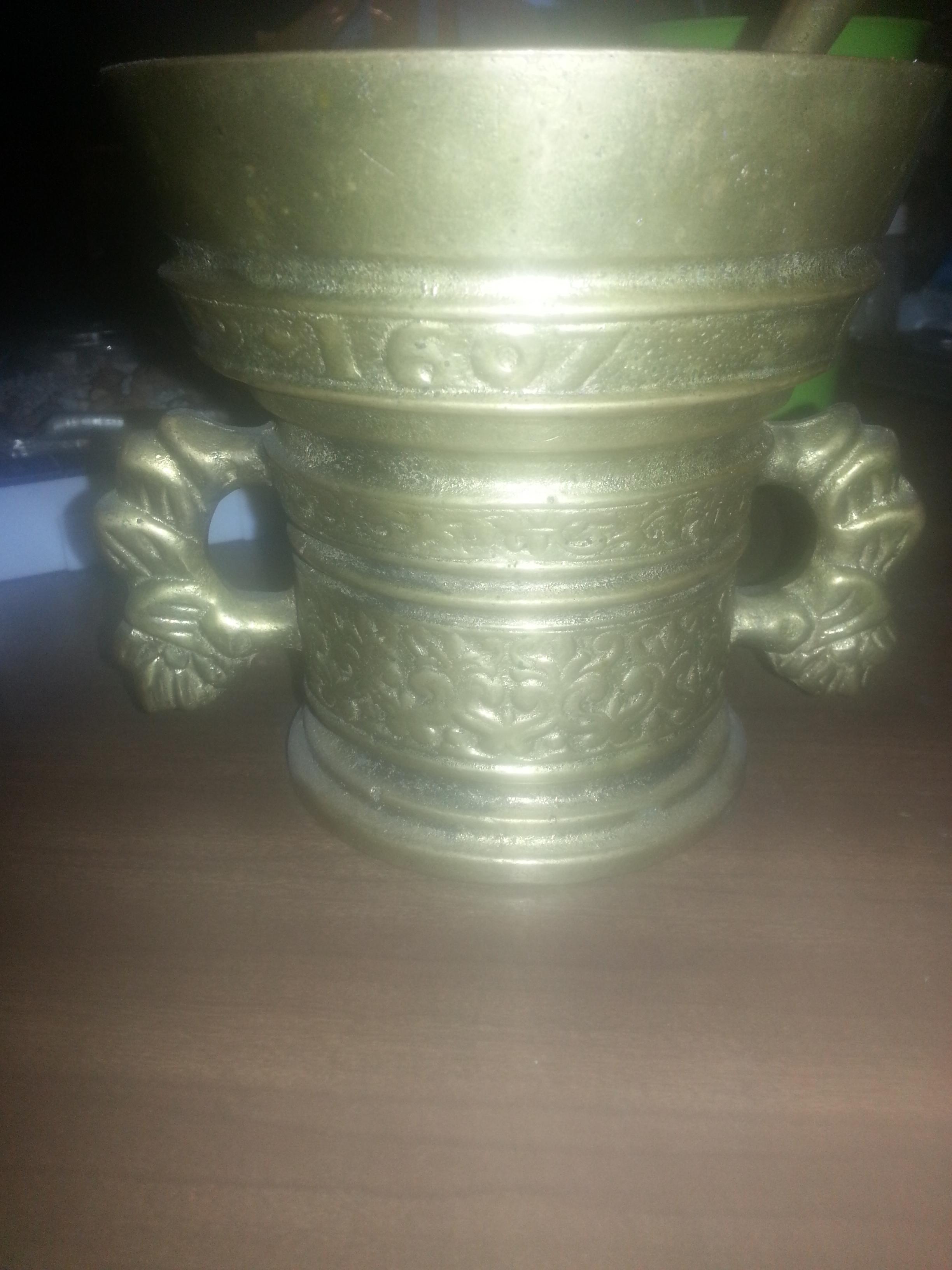 Mortar and Pestle marked Lof Godt Van A AO 1607 under the rim. Research done comes back possibly early 17th century Dutch Bronze or Antique Brass. It is extremely heavy with minor nicks in both mortar and pestle and approx.6 inches tall. Very ornate.