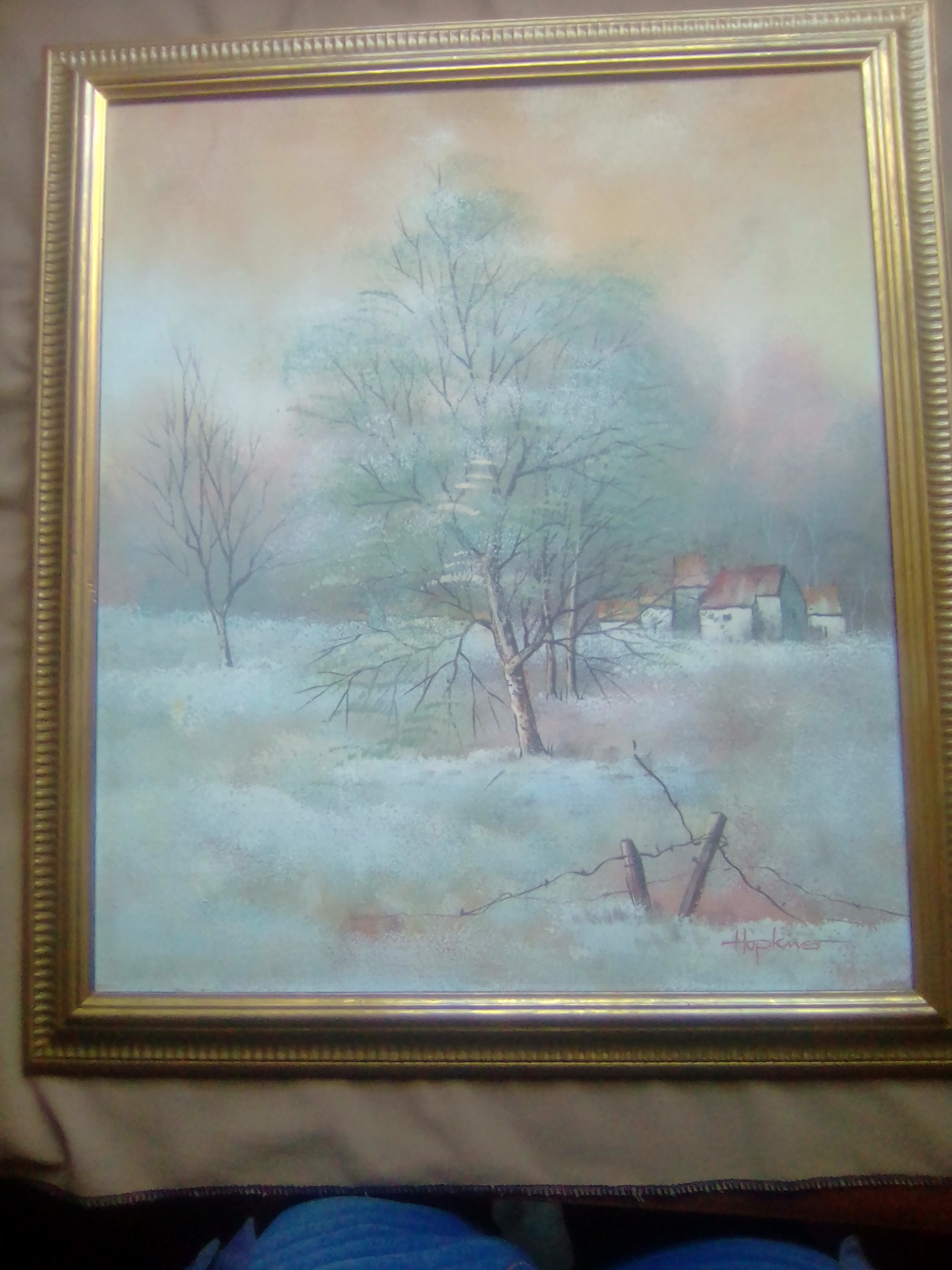 this a work of an isolated home with wild trees around done by an artist with a signature written Hopkins, i bought it in south africa at an outdoor auction in 2017 and it looks like it was done 20 to 25 years ago by maybe a south african artist, its in good condition, its paint on canvas.