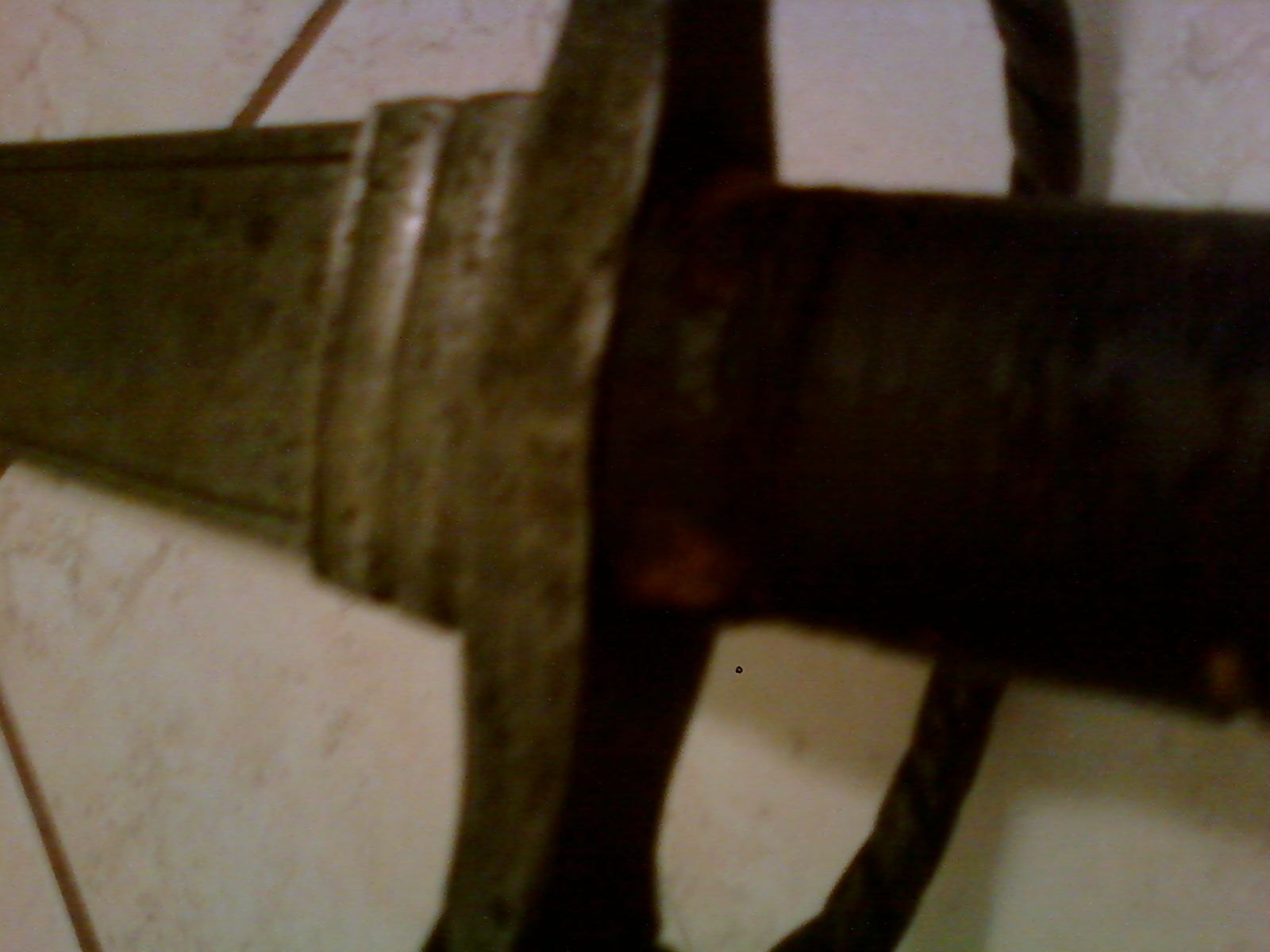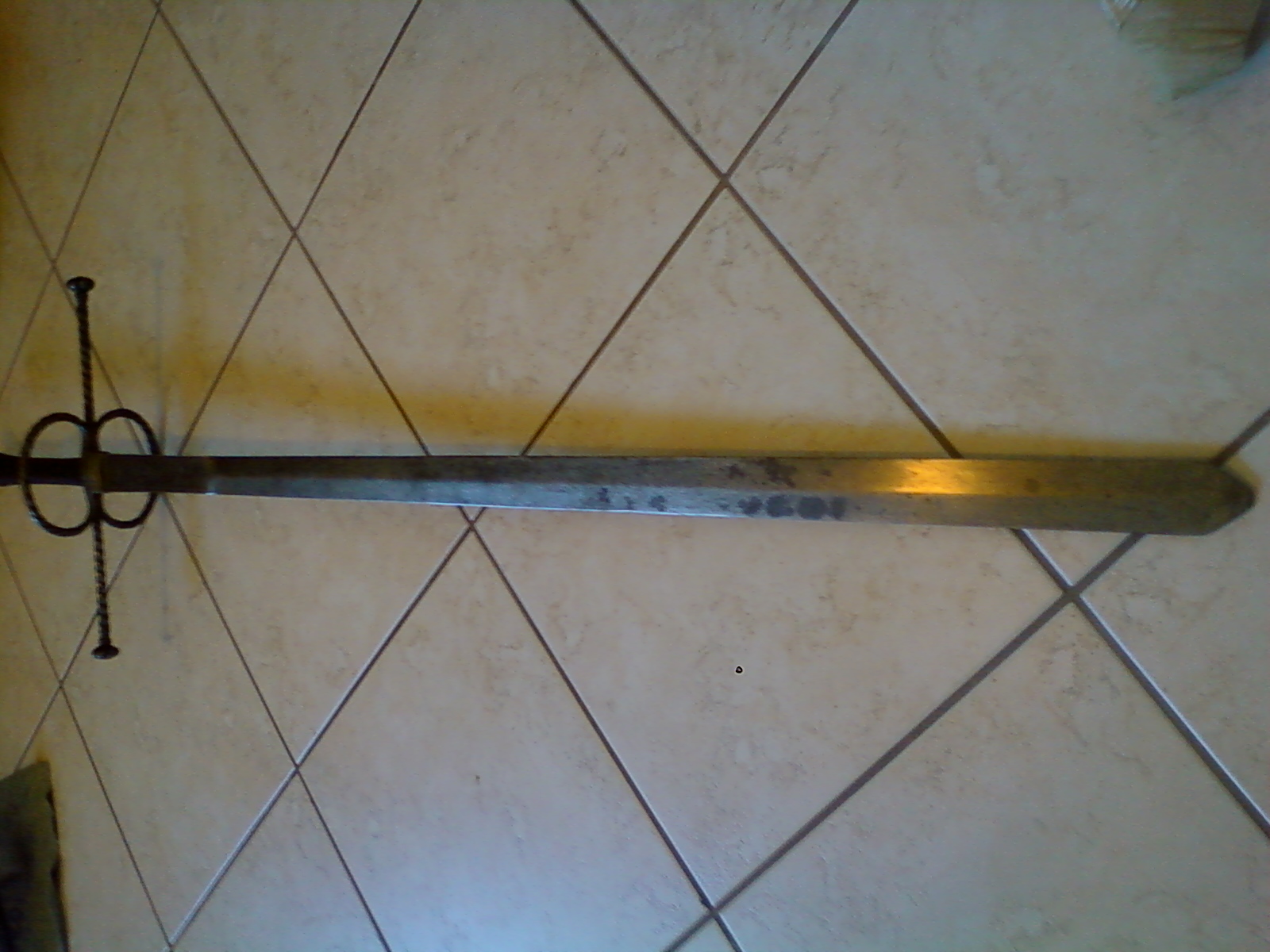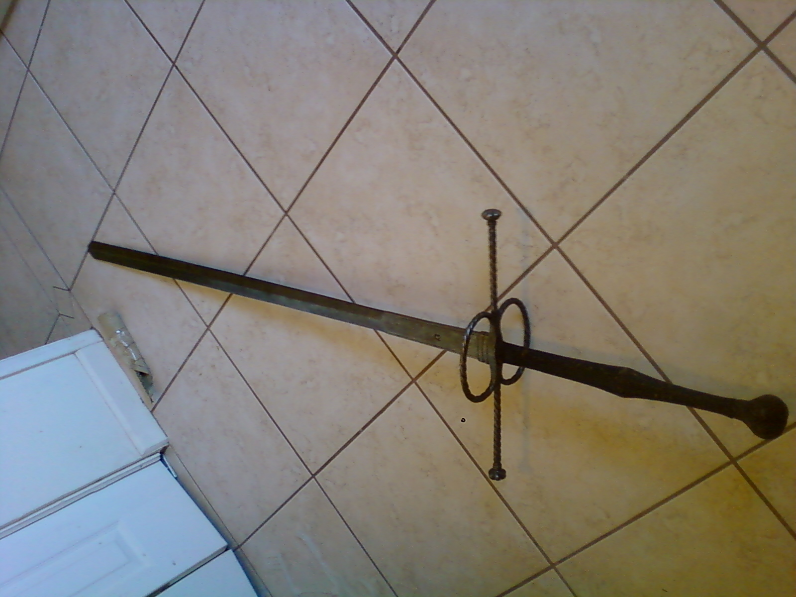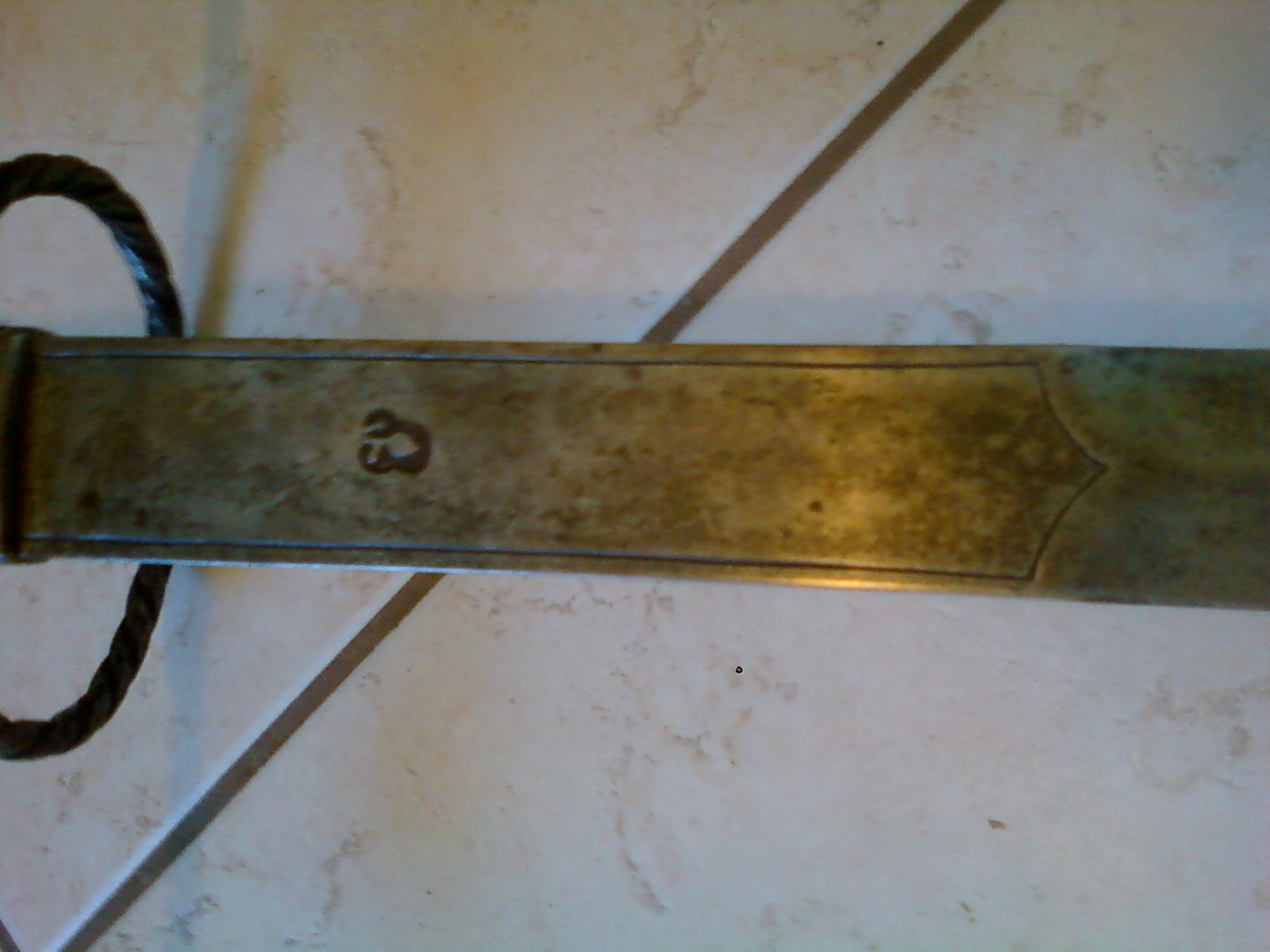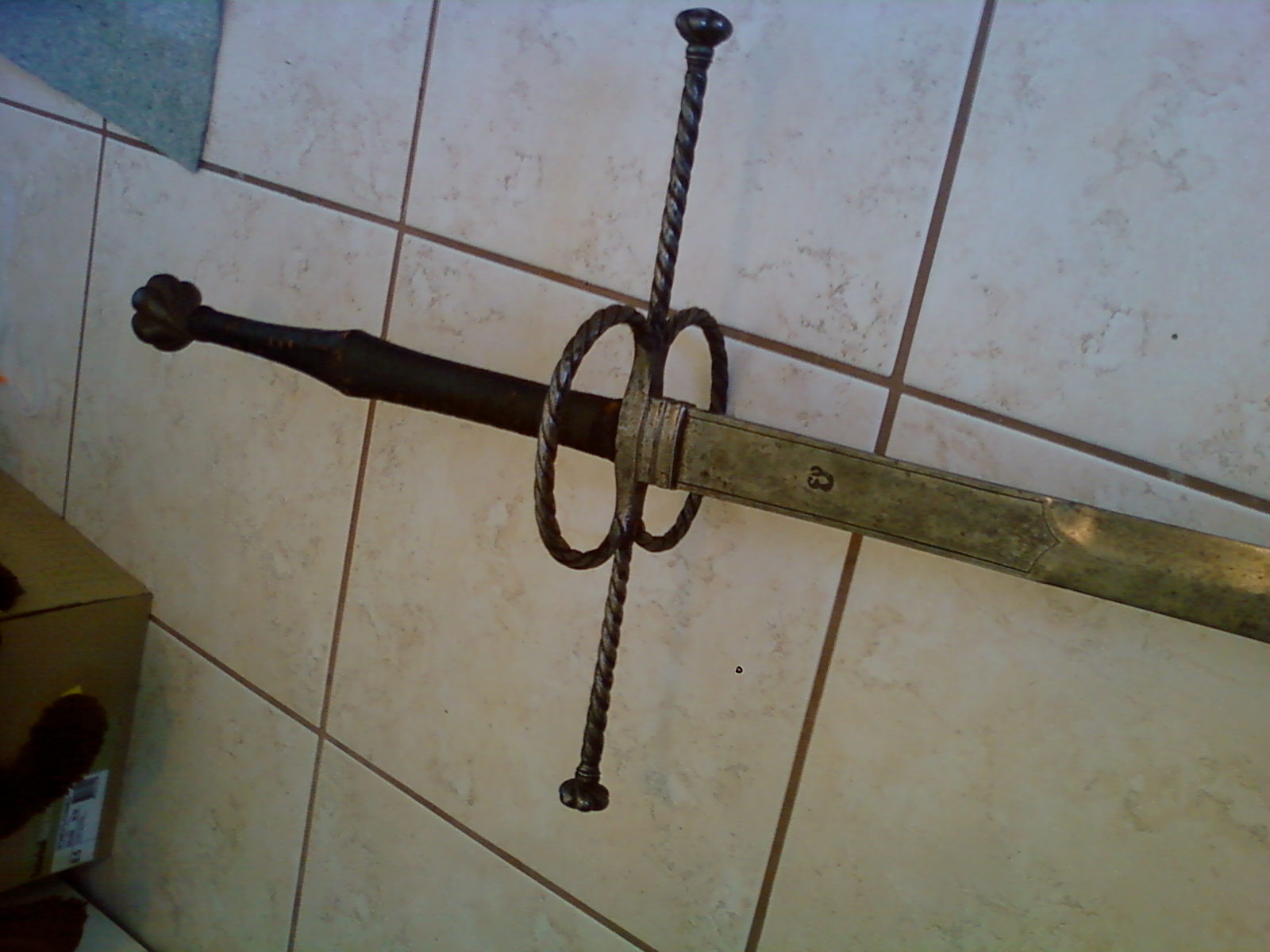 This is what seems to be an orignal long sword from the Renasiance. It is made of all iron and wieghs a good amount. The blade is very long and also yery straight. There seems to be one side that looks as if the blade may have seen some action. The cross-section blade that seperates the handle and the blade is what seems to be a Double Fuller Cross-section Blade. The design on the sword looks as if the twist was hand ffiled instead of made by a machine. This pre-industrial piece shows blacksmith qualities. The bottom base of the Sword has signs of hand made nailing of the enire piece. The only identifing mark is the one hallmark. We need help identifing this piece as it relates to its iconography. This will help me establis a more definitive description and wherabouts of this magnificant piece of higher class offensive millitary weapons that is from an earlier time.