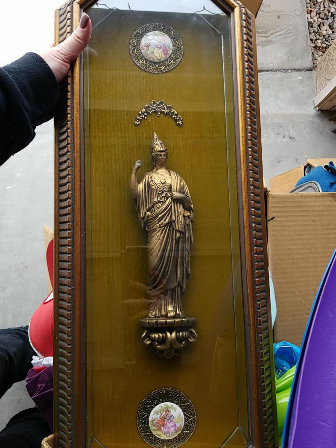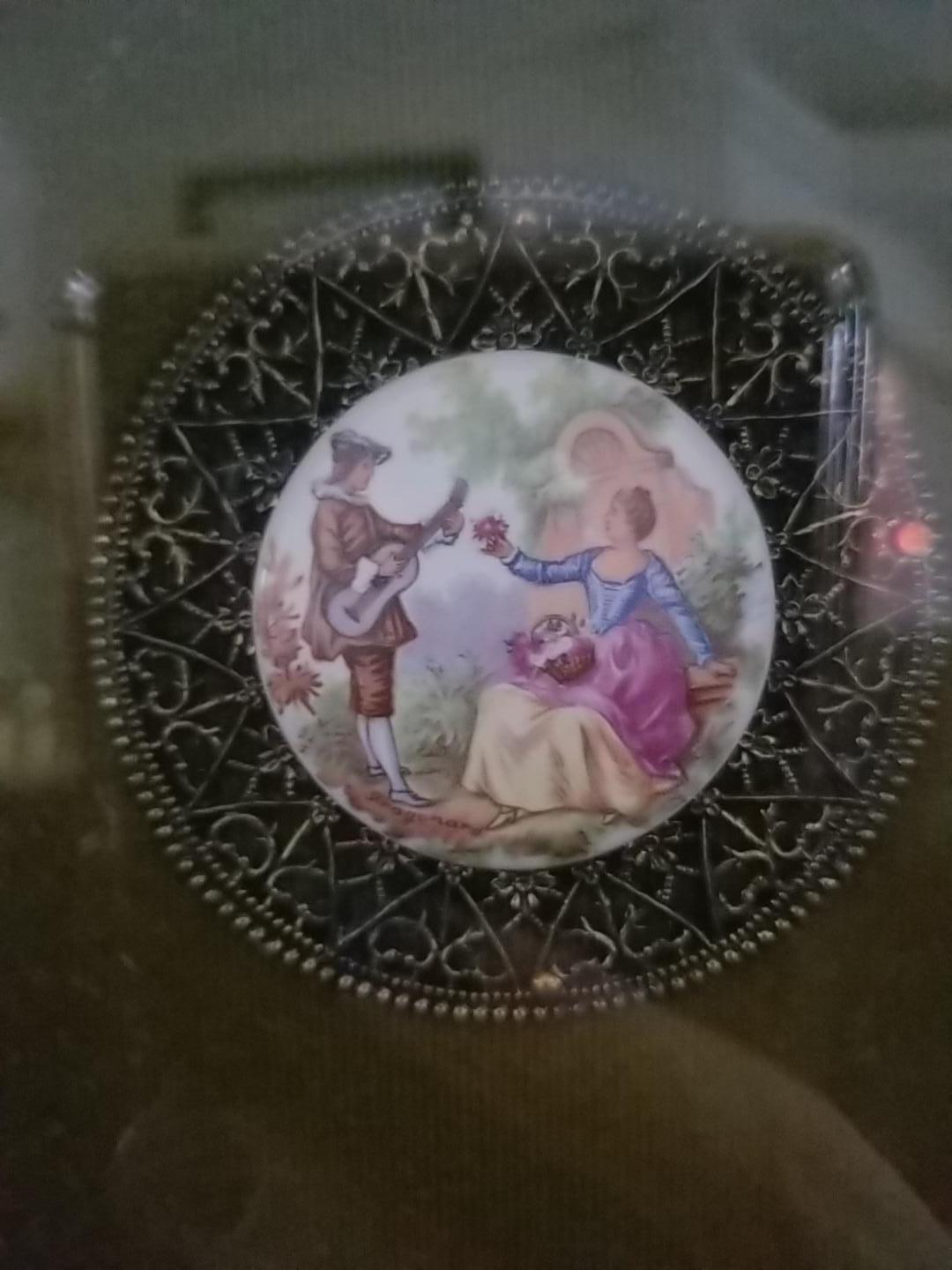 This was left to me by family. I have no idea what it is and would like information. I can find info on the circular porcelain type items at the top & bottom but not much info. And I have no clue what the statue type thing is in the center.