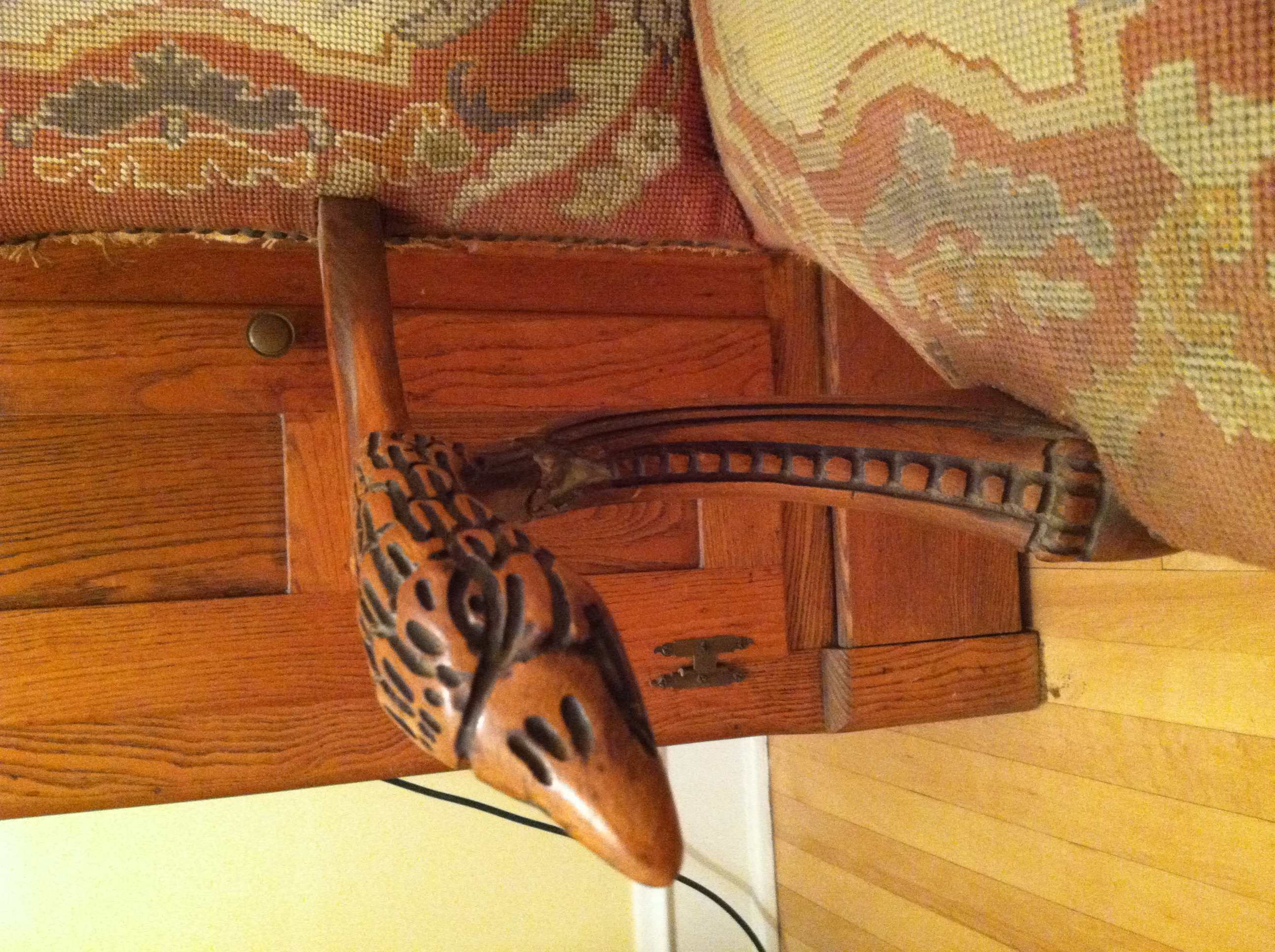 It has two hand carved ducks on the armrest and a cool type of tapestry like upholstery on it.